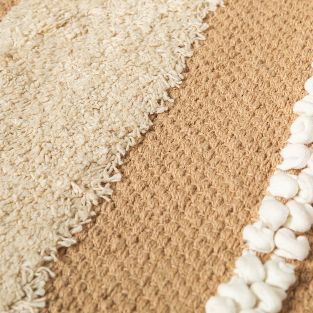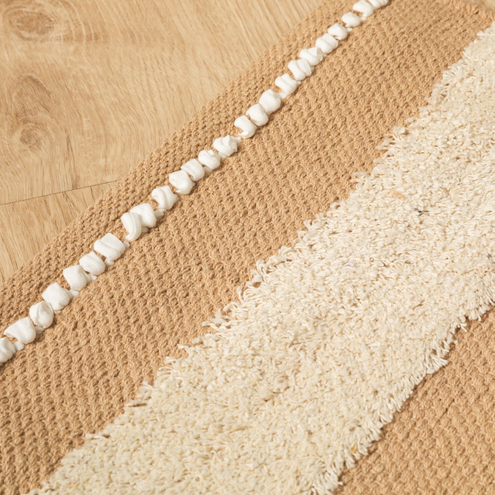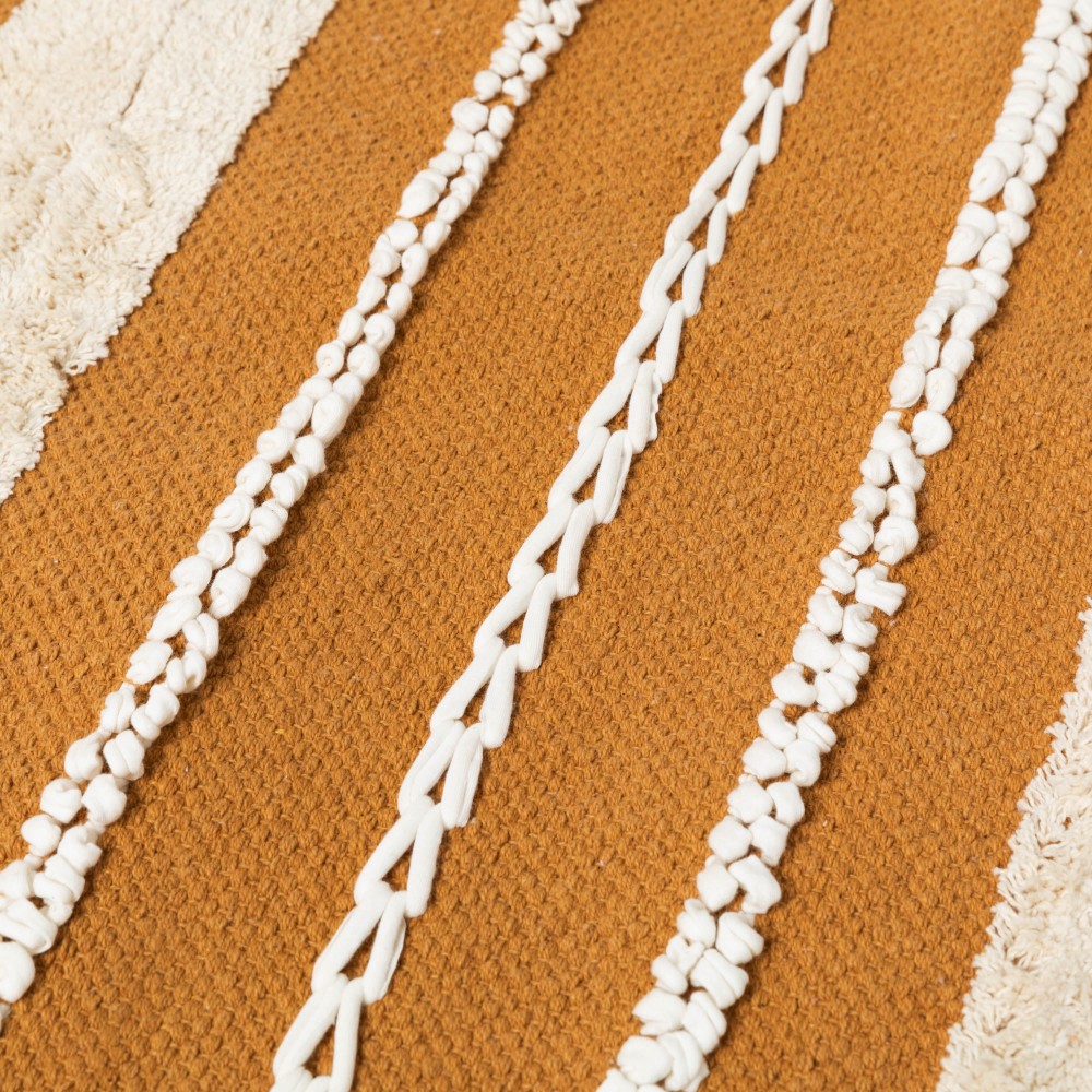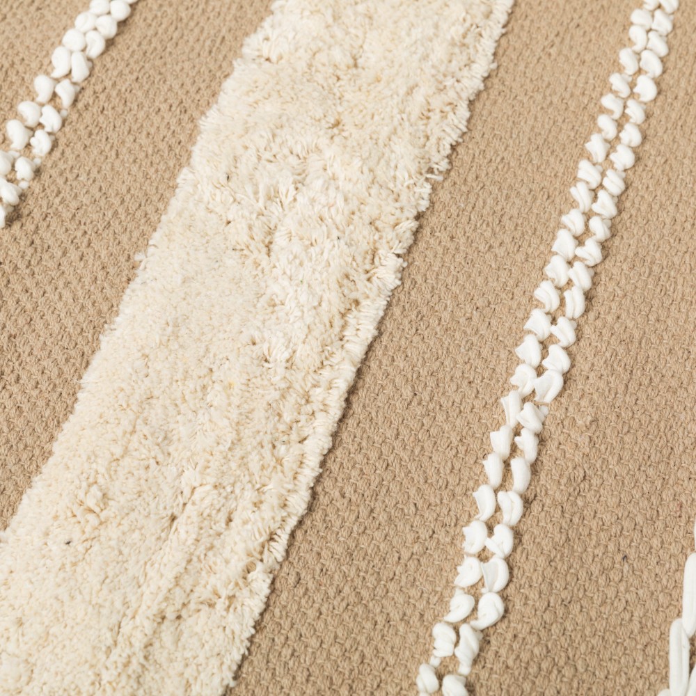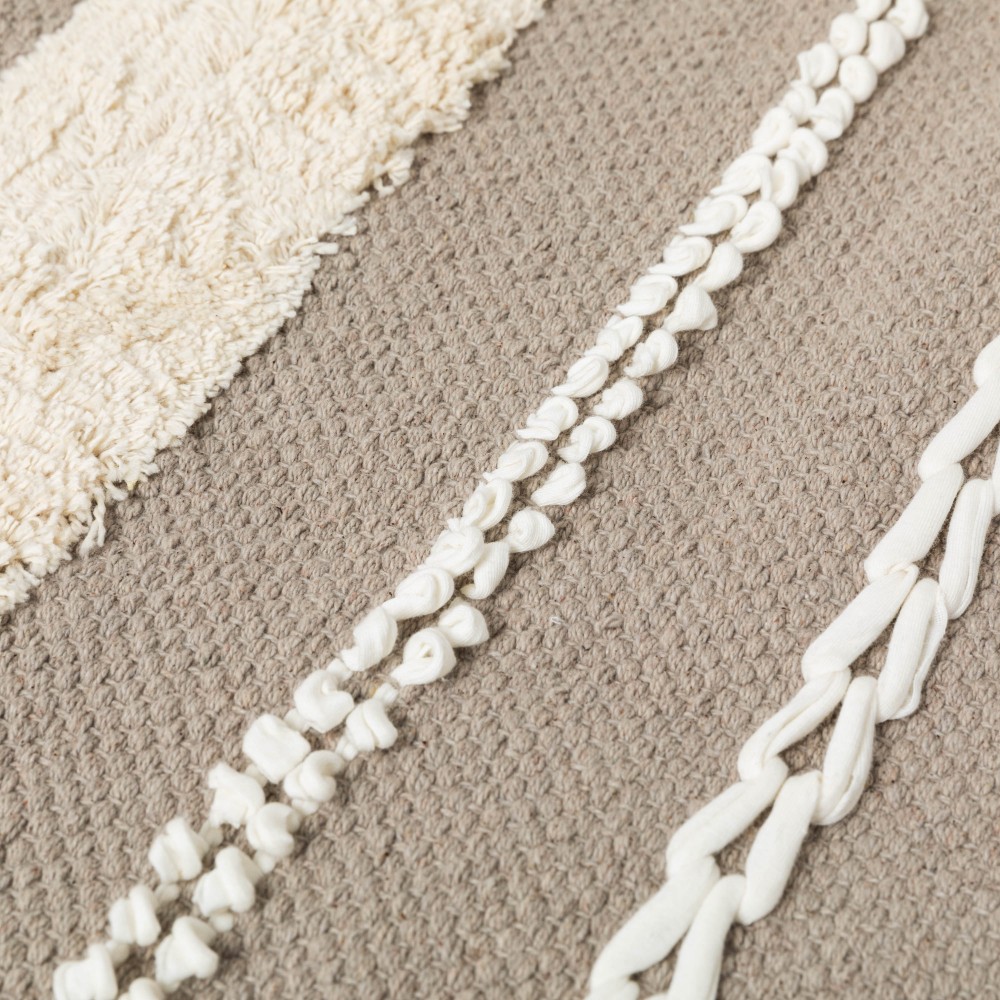 Fabricada en 100% algodón con un estilo boho de franjas con flecos cortos, pequeños nudos y detalles de trenzado en color natural sobre un fondo liso en diferentes tonos.