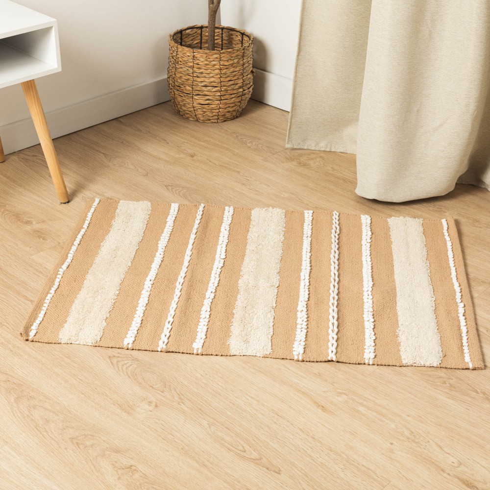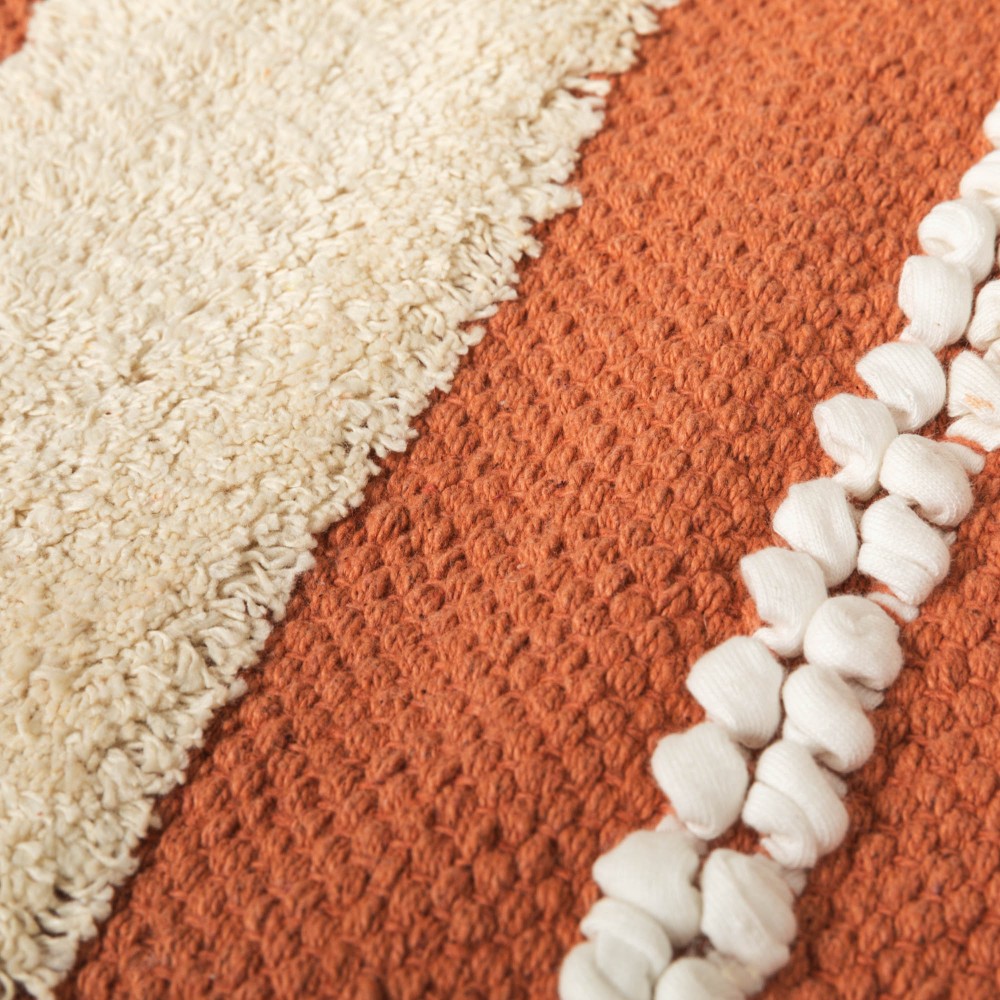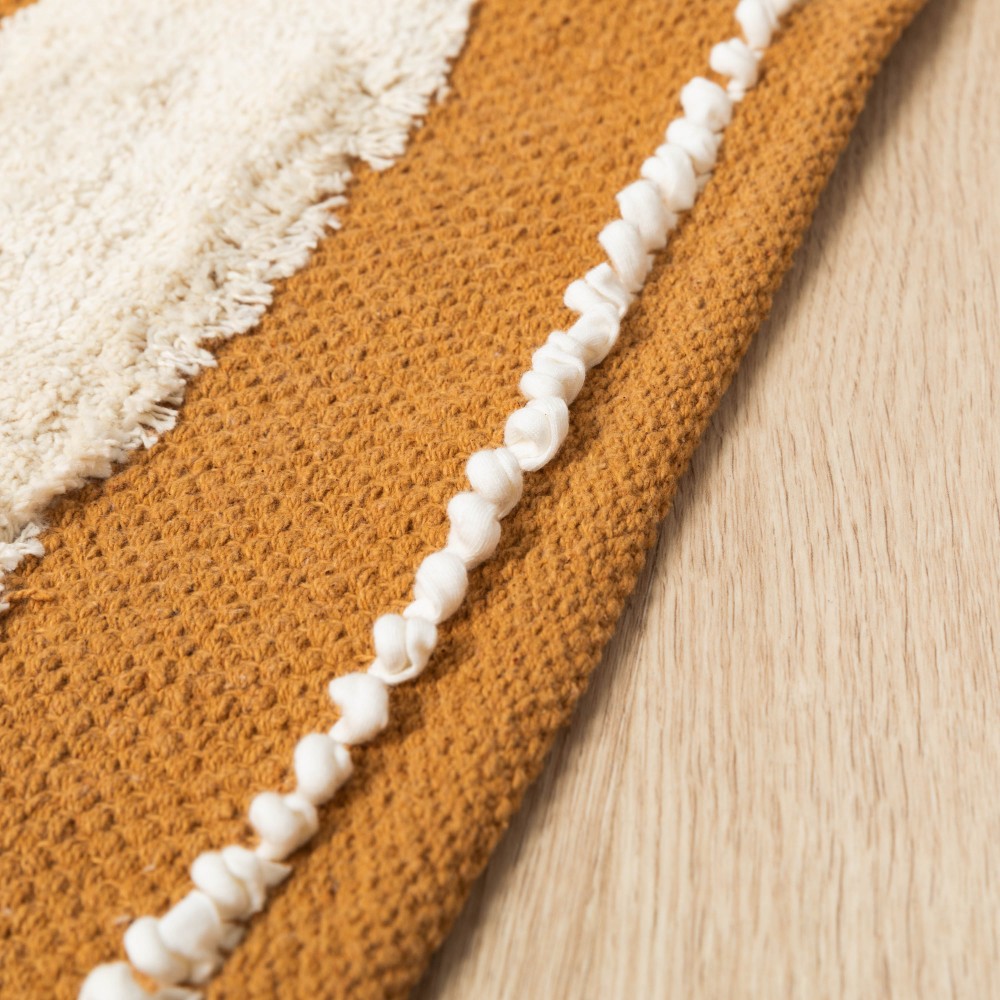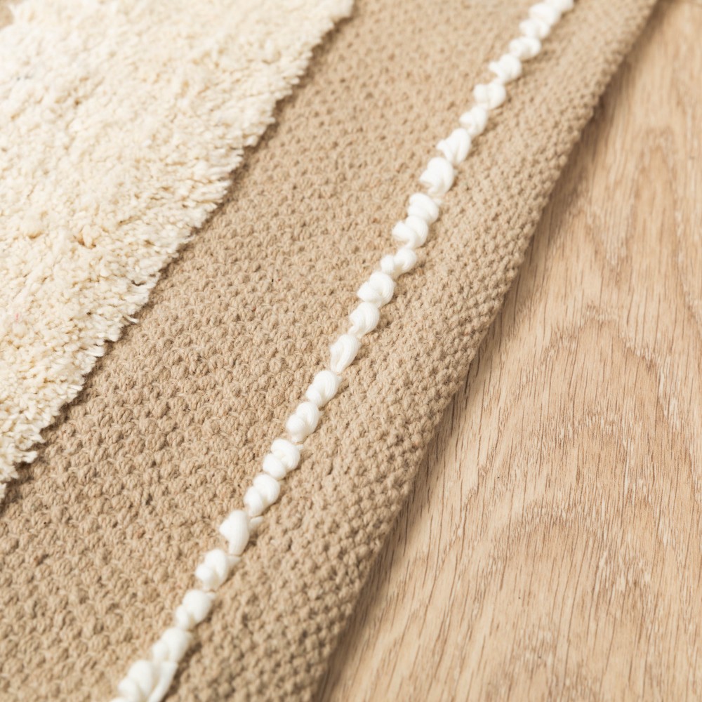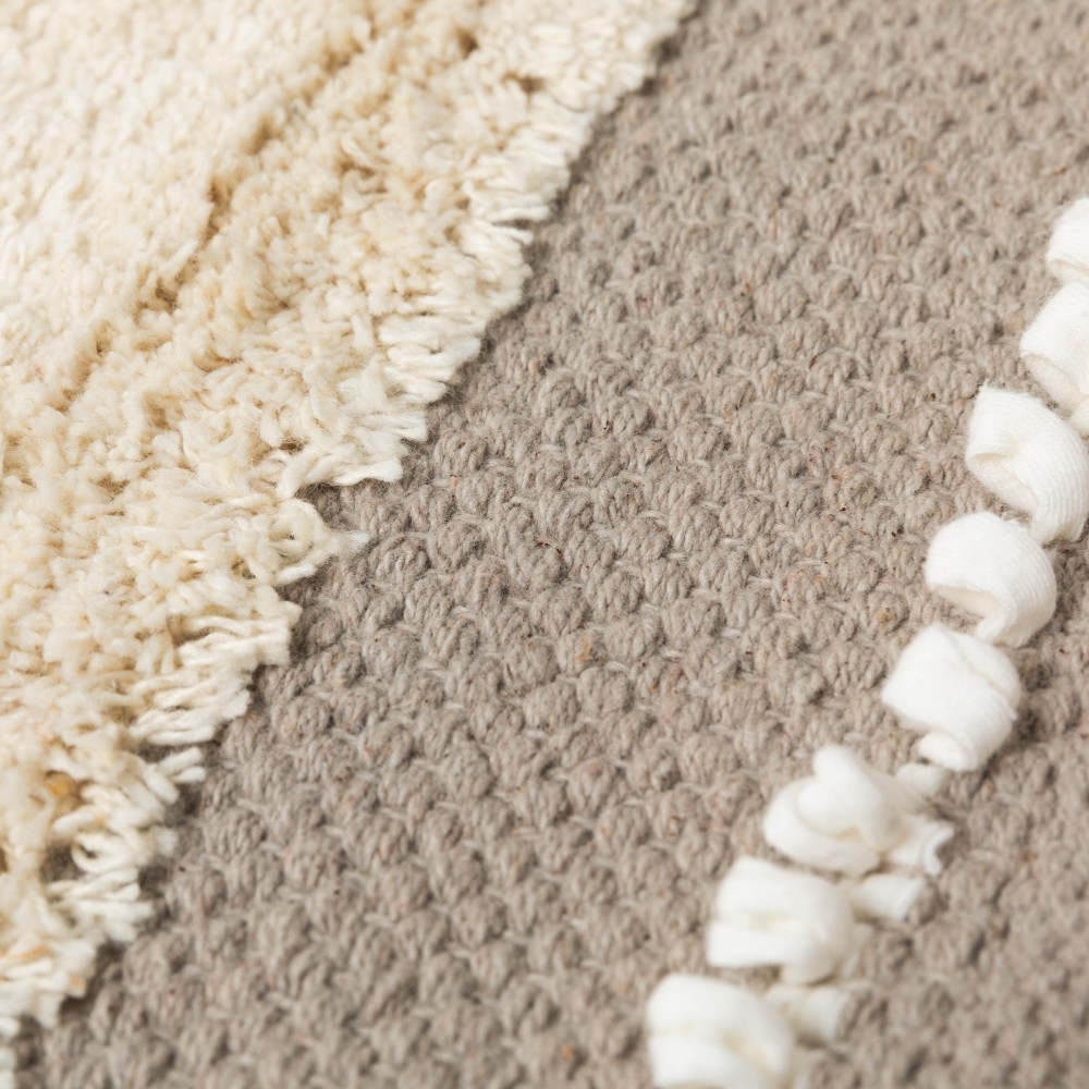 Fabricada en 100% algodón con un estilo boho de franjas con flecos cortos, pequeños nudos y detalles de trenzado en color natural sobre un fondo liso en diferentes tonos.