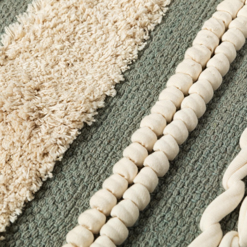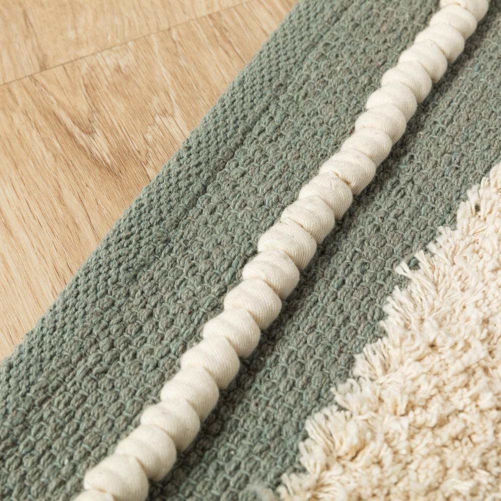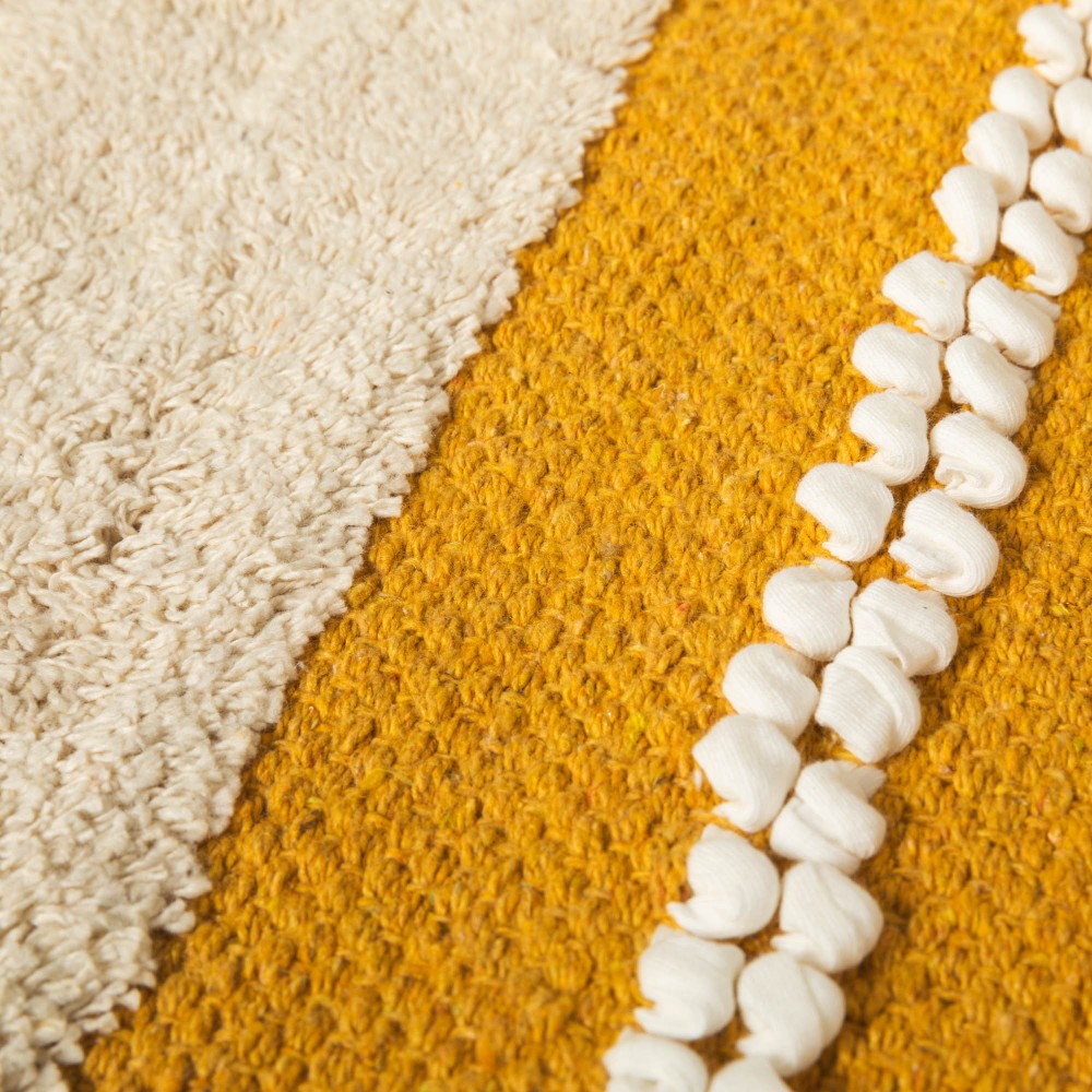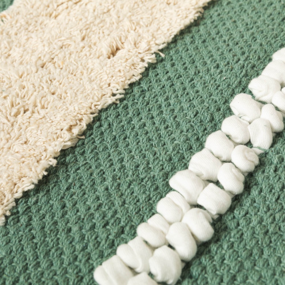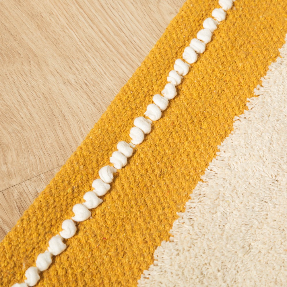 Fabricada en 100% algodón con un estilo boho de franjas con flecos cortos, pequeños nudos y detalles de trenzado en color natural sobre un fondo liso en diferentes tonos.