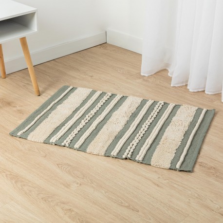 Fabricada en 100% algodón con un estilo boho de franjas con flecos cortos, pequeños nudos y detalles de trenzado en color natural sobre un fondo liso en diferentes tonos.