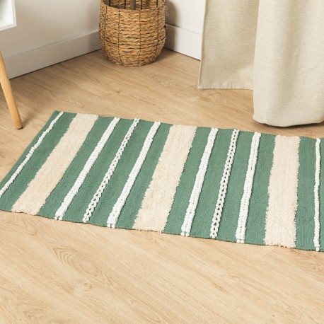 Fabricada en 100% algodón con un estilo boho de franjas con flecos cortos, pequeños nudos y detalles de trenzado en color natural sobre un fondo liso en diferentes tonos.