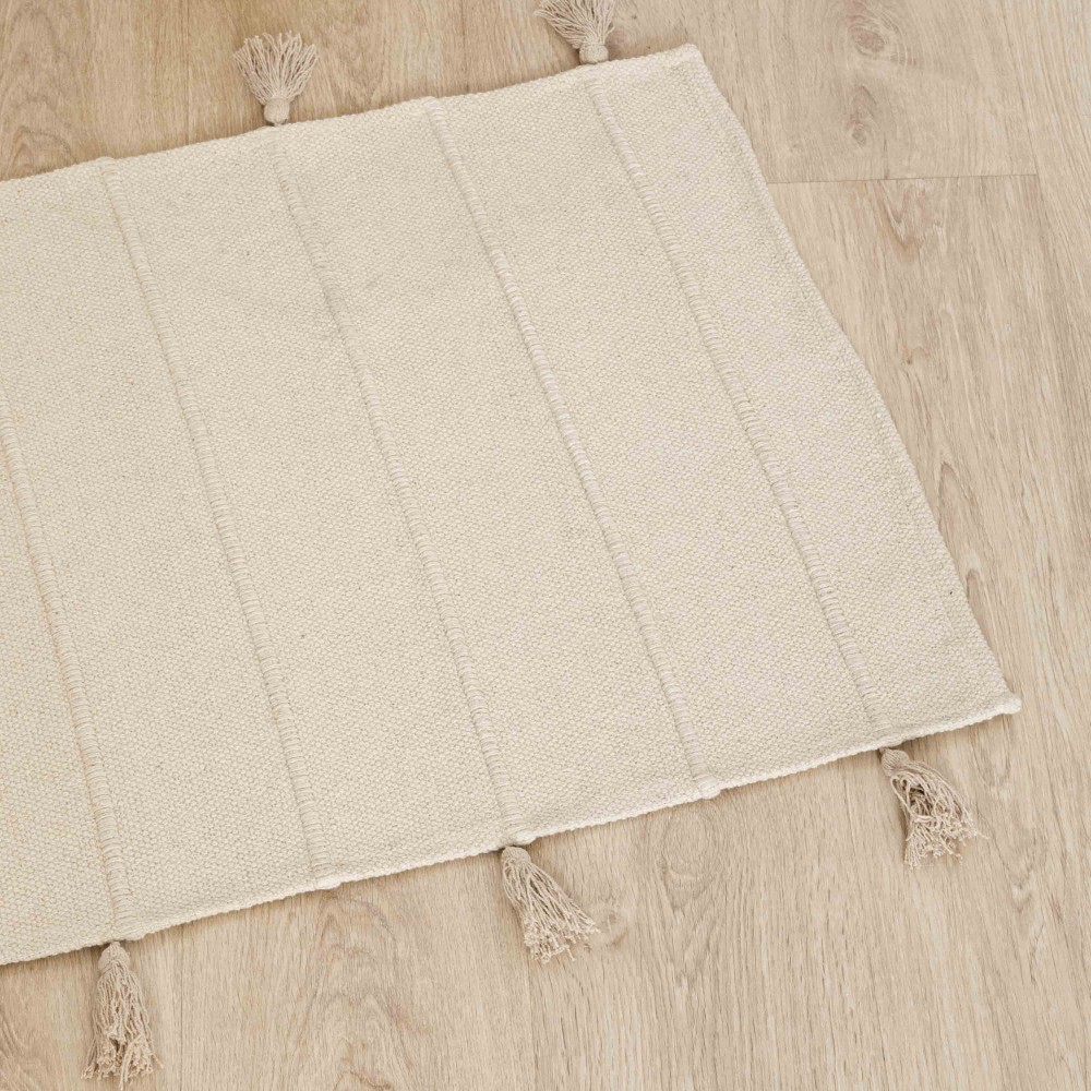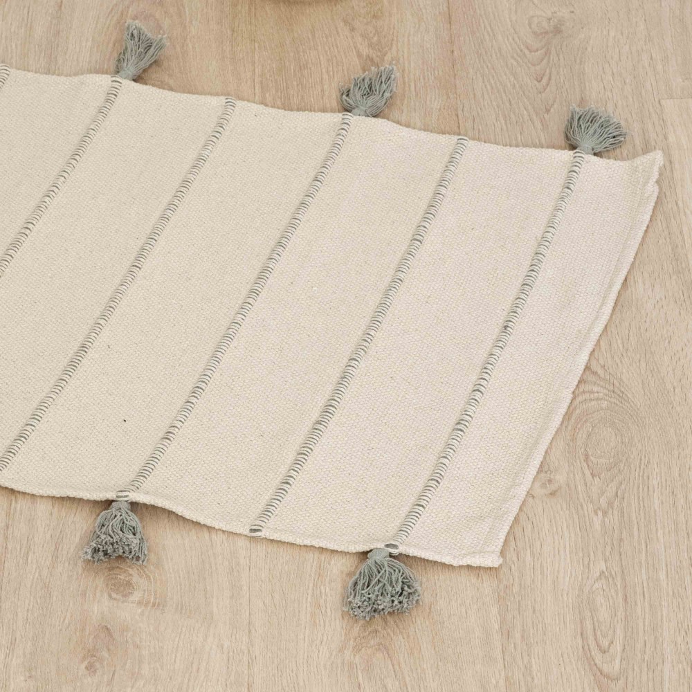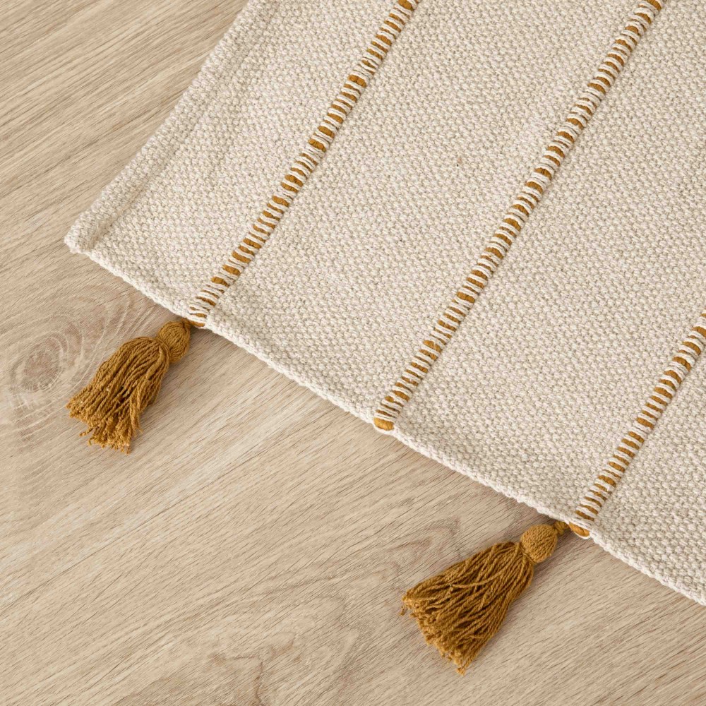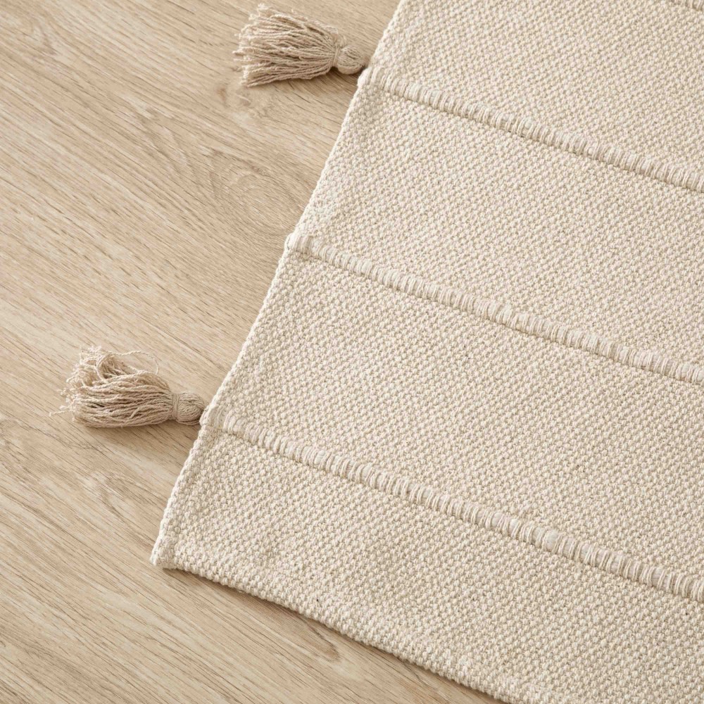 Fabricada en 100% algodón con un estilo sencillo de rayas perceptibles al tacto con borlones de flecos en los extremos del mismo tono.