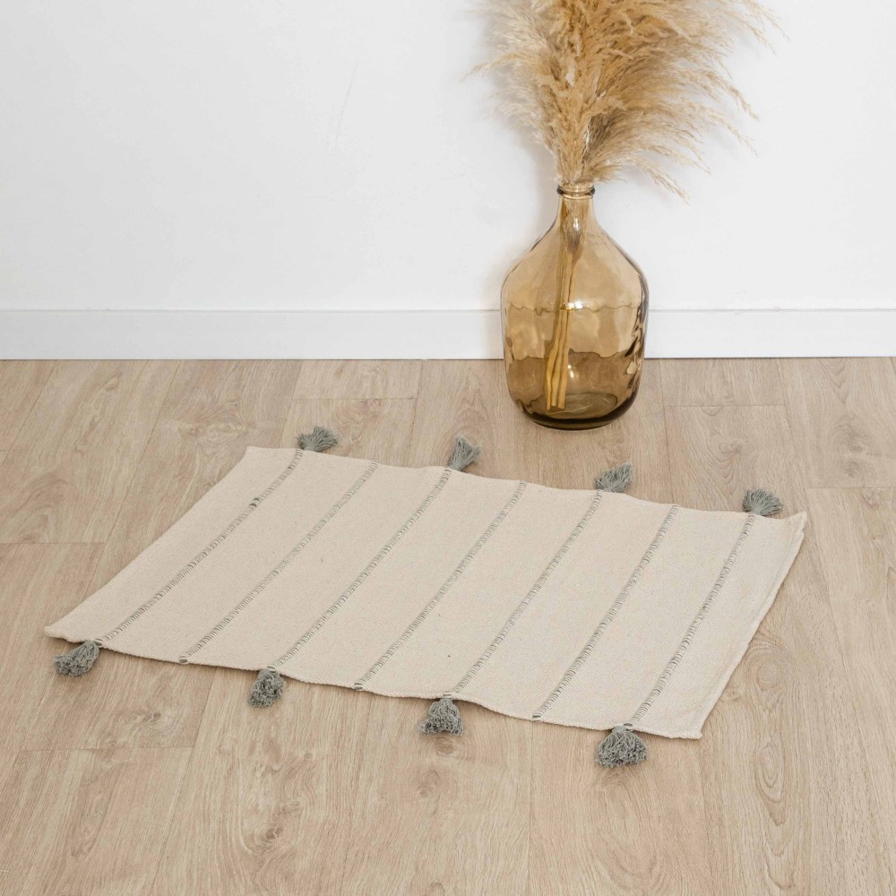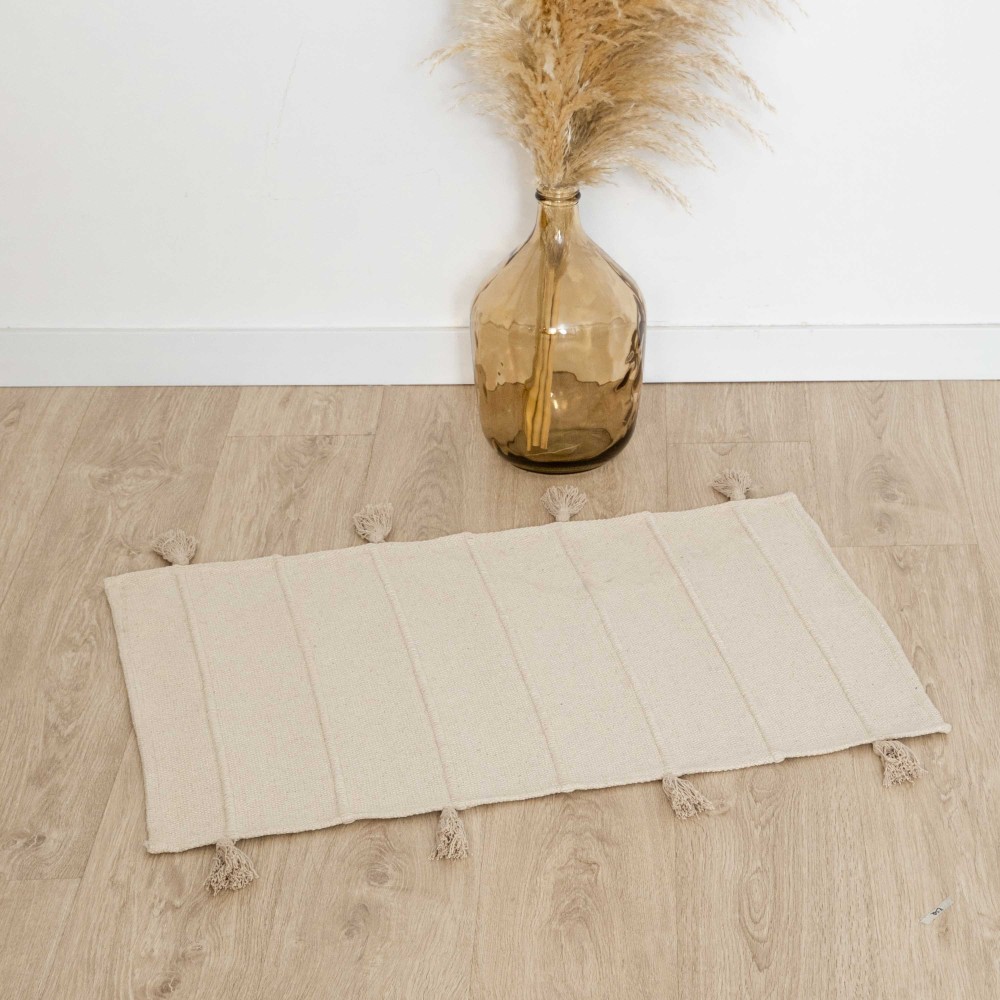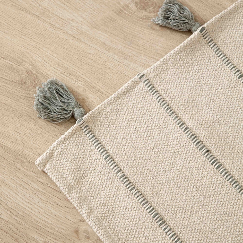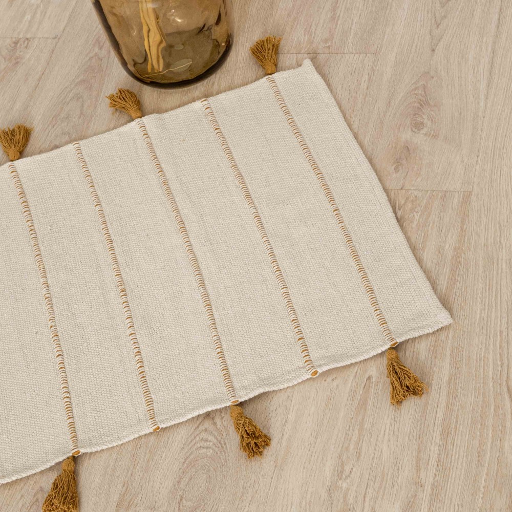 Fabricada en 100% algodón con un estilo sencillo de rayas perceptibles al tacto con borlones de flecos en los extremos del mismo tono.