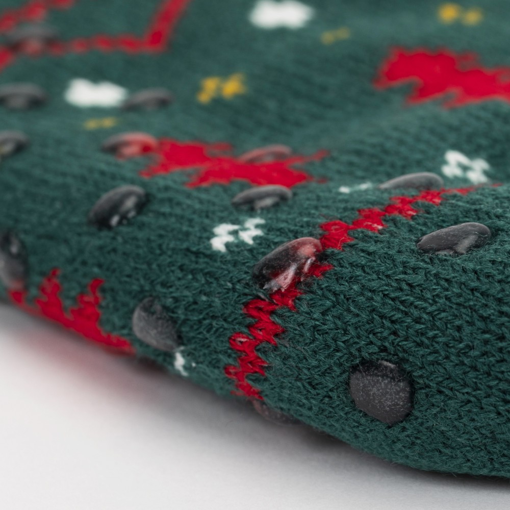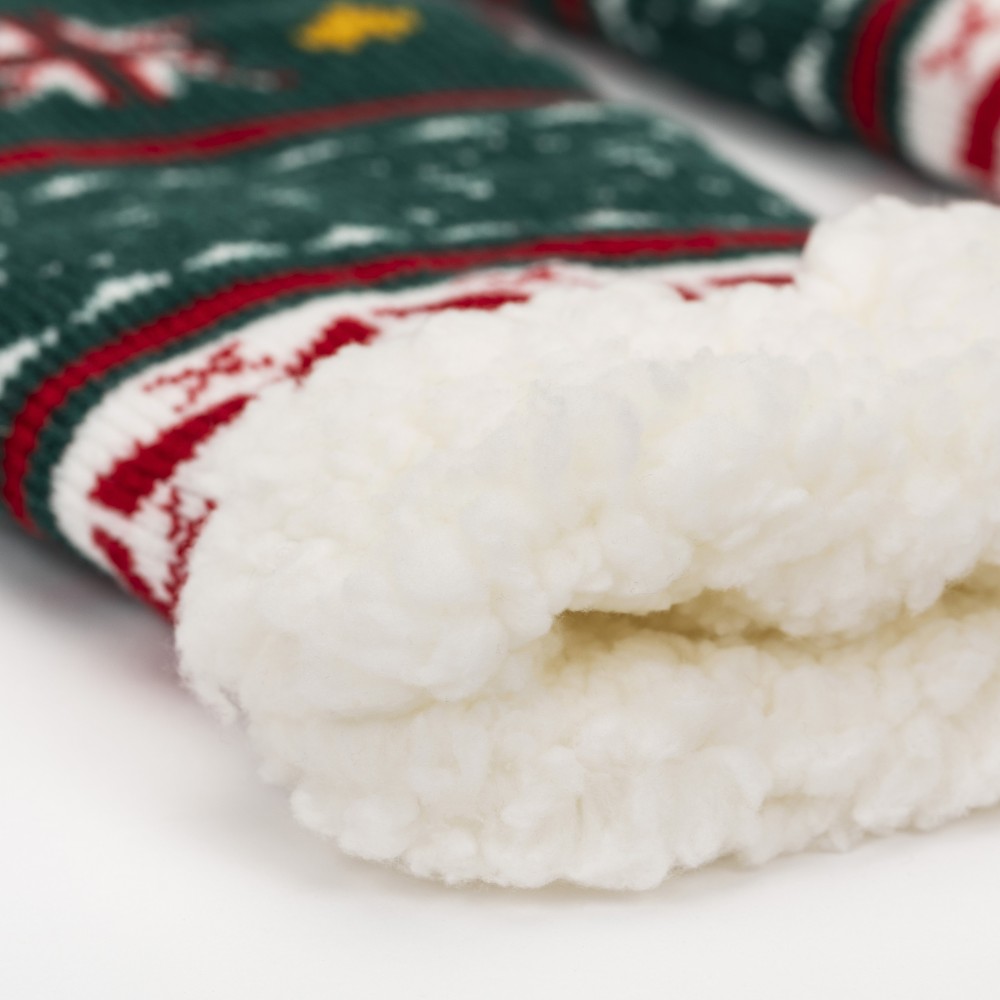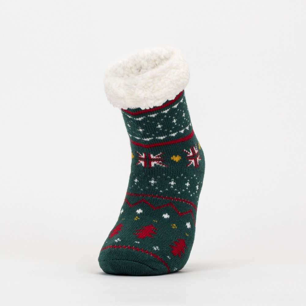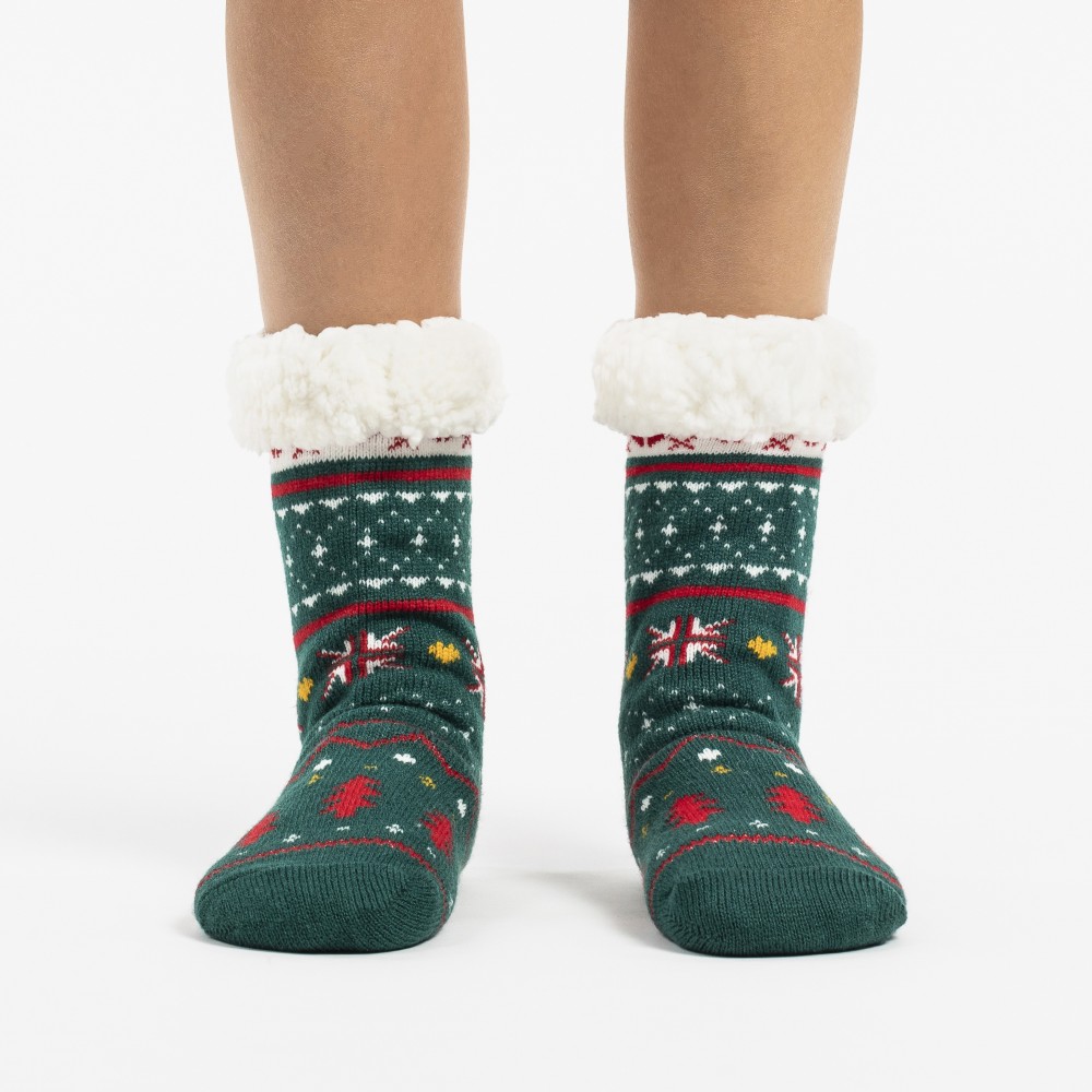 Calcetines térmicos de sherpa unisex de color verde con estampado navideño y colorido de estrellas, abetos y diferentes figuras en tonos rojos, amarillo y blanco que le aportan un diseño más original, además cuenta con agarres de silicona en la parte inferior que le permitirán andar con mayor seguridad por su suela antideslizante.