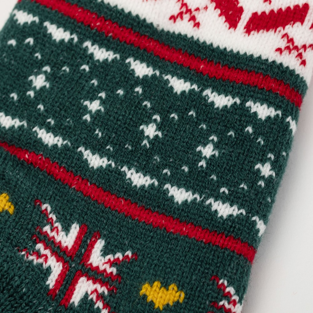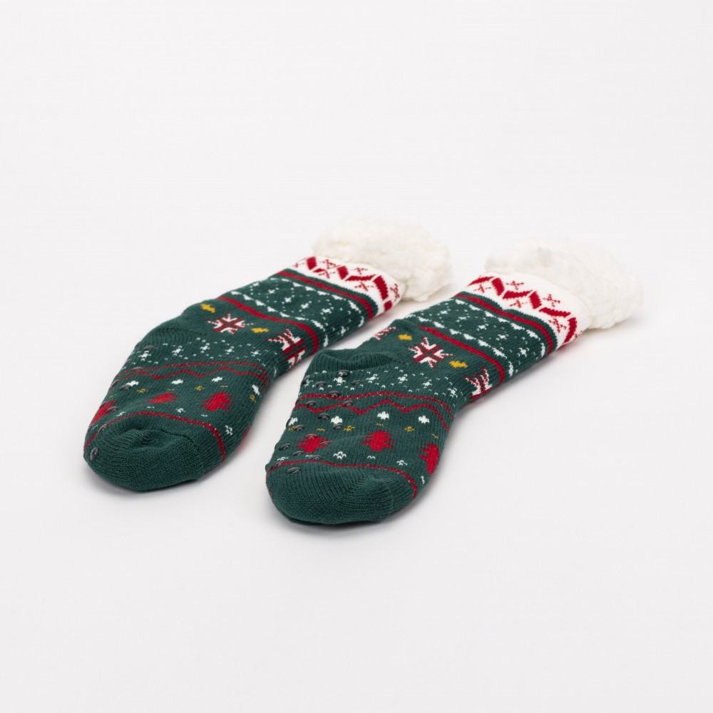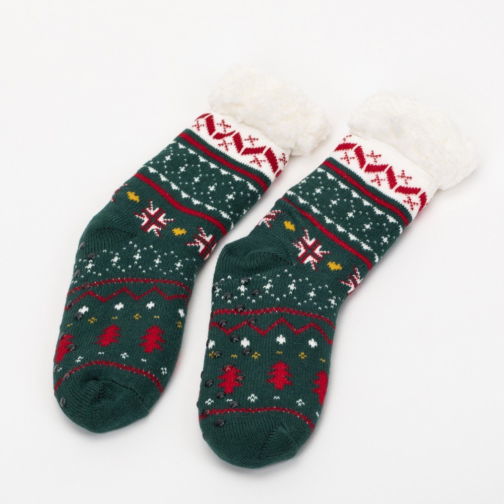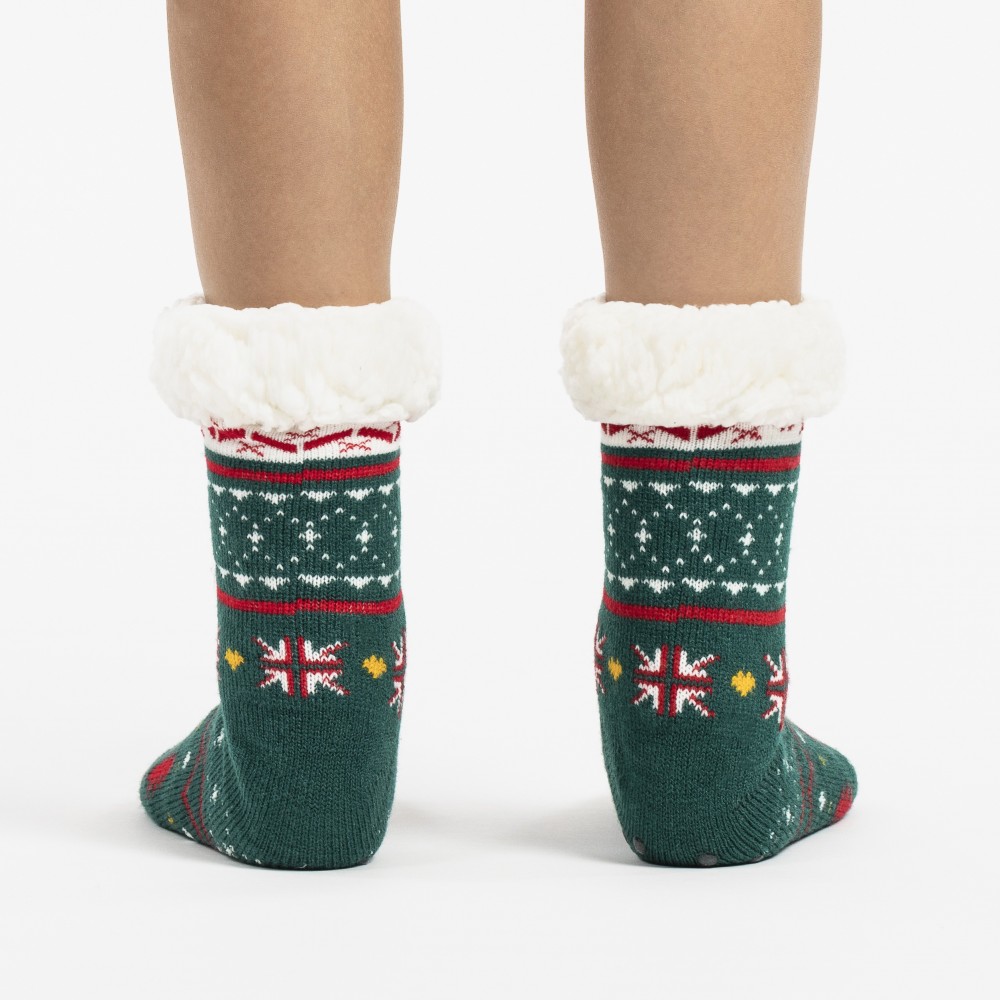 Calcetines térmicos de sherpa unisex de color verde con estampado navideño y colorido de estrellas, abetos y diferentes figuras en tonos rojos, amarillo y blanco que le aportan un diseño más original, además cuenta con agarres de silicona en la parte inferior que le permitirán andar con mayor seguridad por su suela antideslizante.