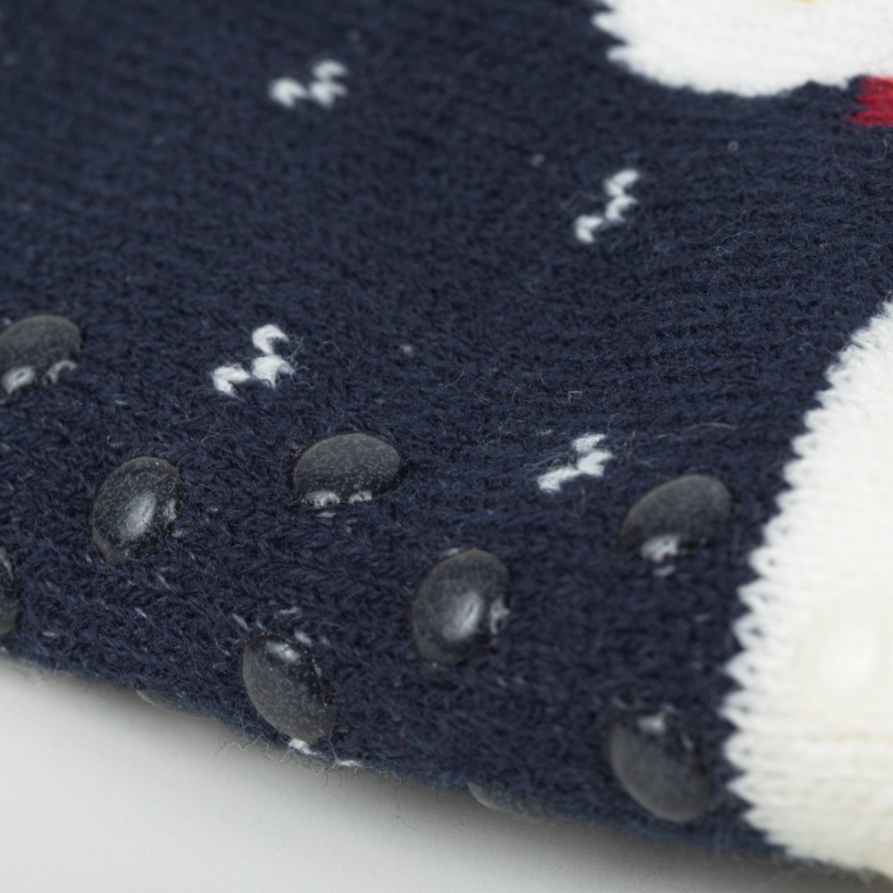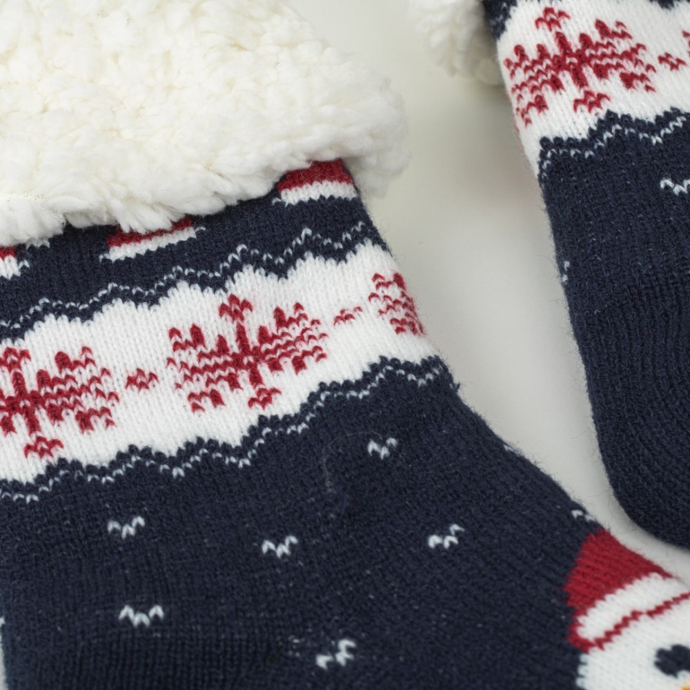 Calcetines térmicos de sherpa unisex de color azul marino con muñeco de nieve y estrellas en tonos blanco y rojo, tienen agarres de silicona en la parte inferior que le permitirán andar con mayor seguridad por su suela antideslizante.