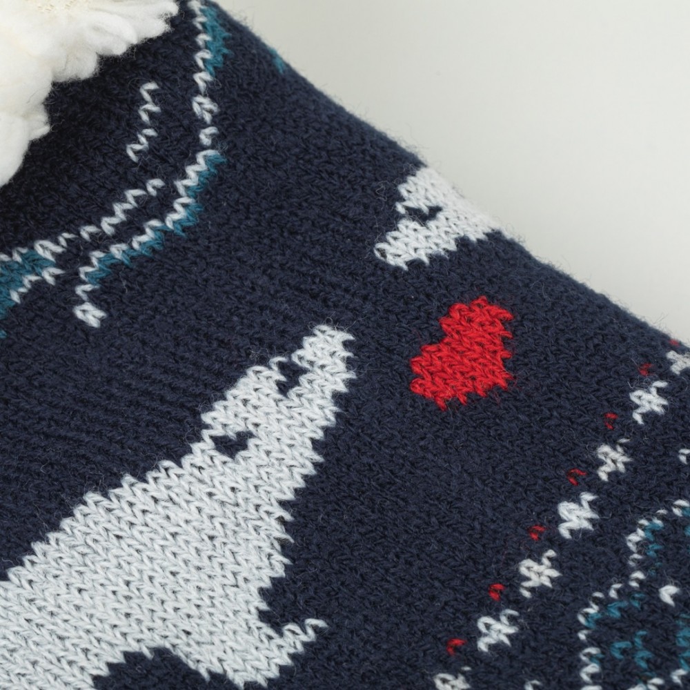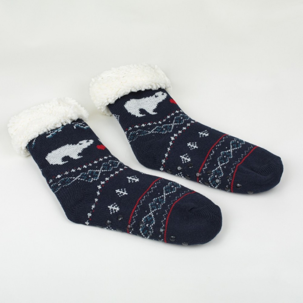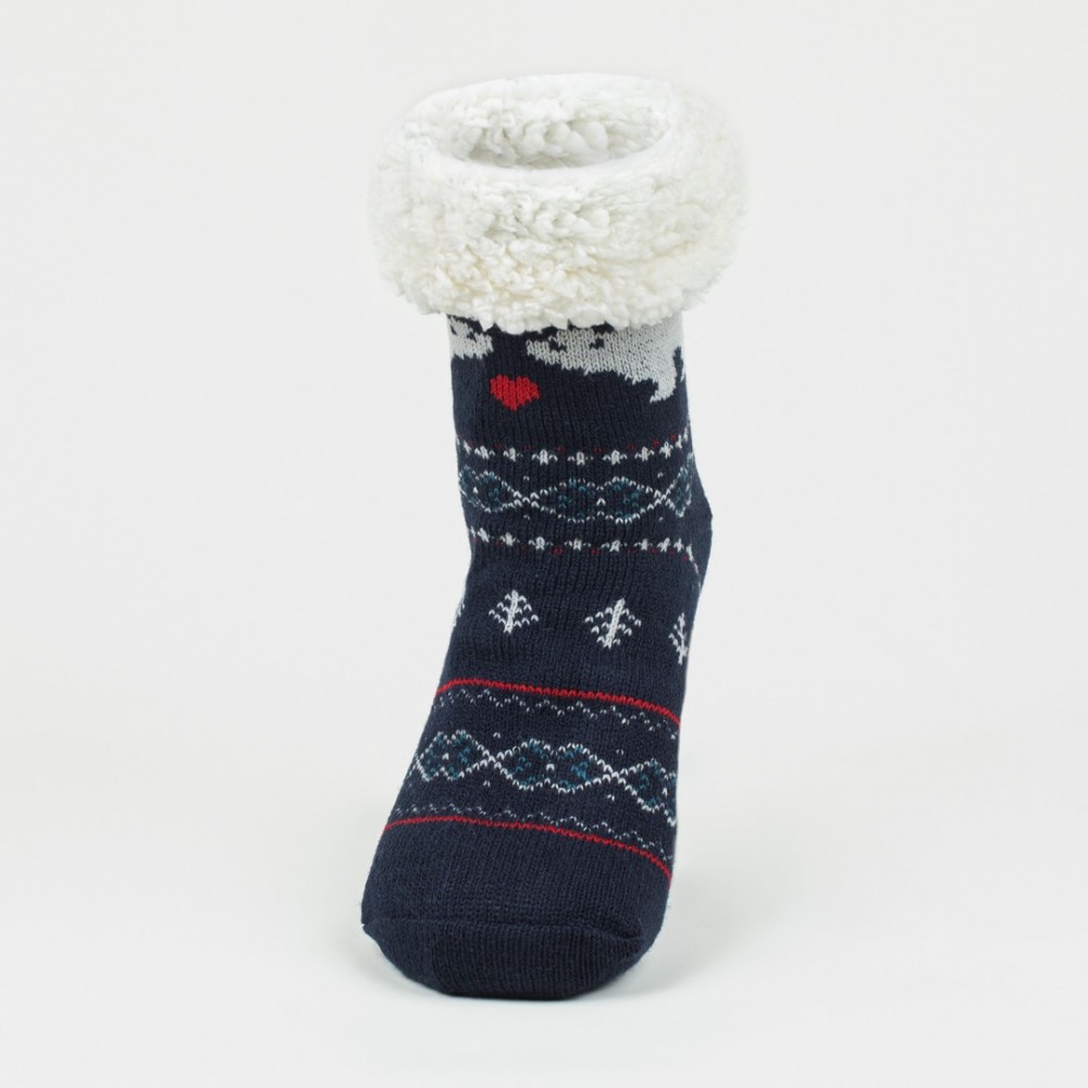 Calcetines térmicos de sherpa unisex de color azul marino con estampado de osos, corazones y diferentes figuras geométricas de color blanco y rojo, tienen agarres de silicona en la parte inferior que le permitirán andar con mayor seguridad por su suela antideslizante.