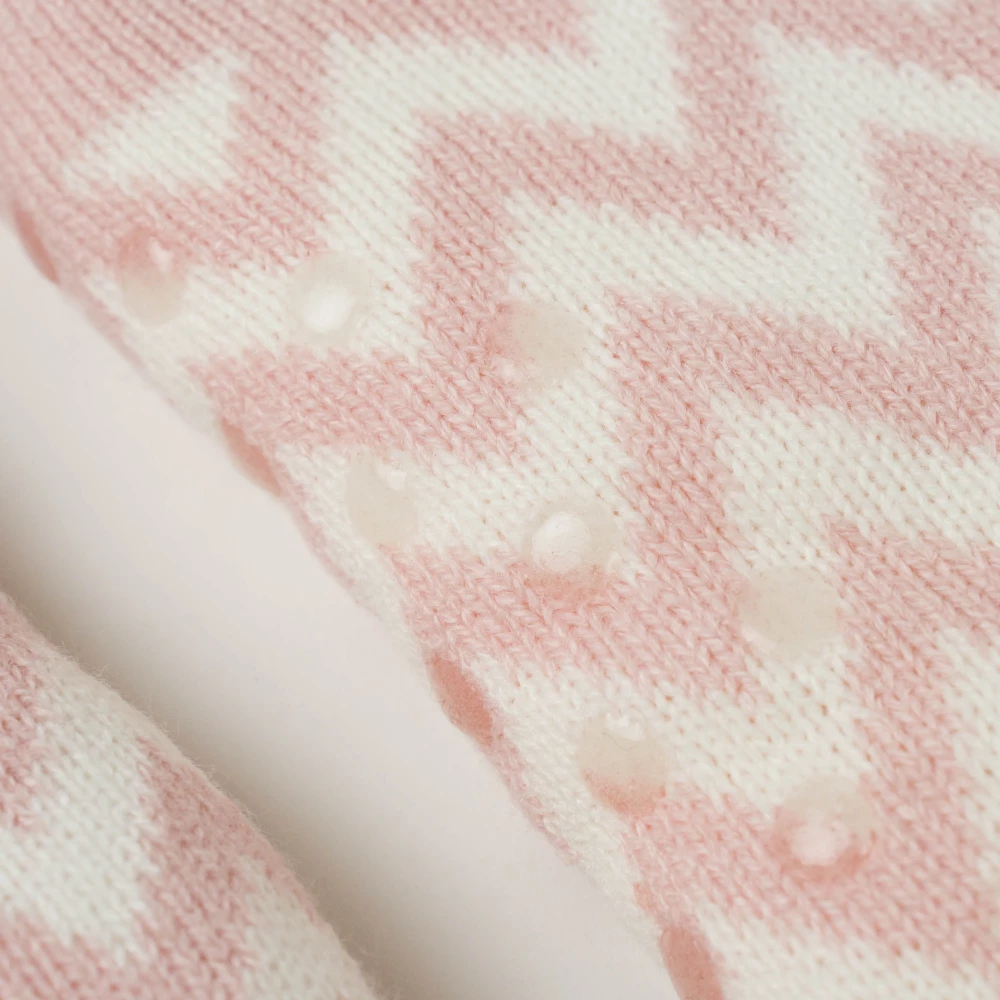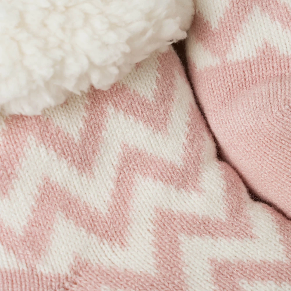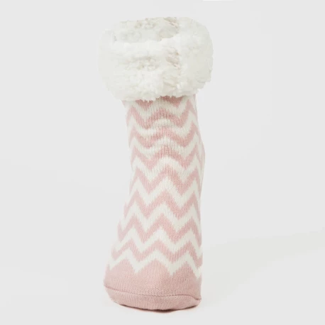 Calcetines térmicos de sherpa de color rosa con estampado de zigzags en color blanco, tienen agarres de silicona en la parte inferior que le permitirán andar con mayor seguridad por su suela antideslizante.
