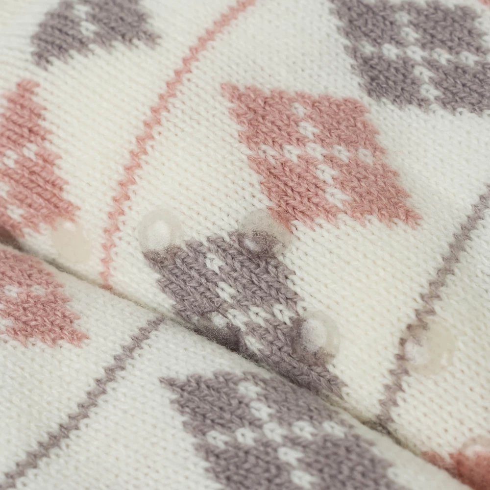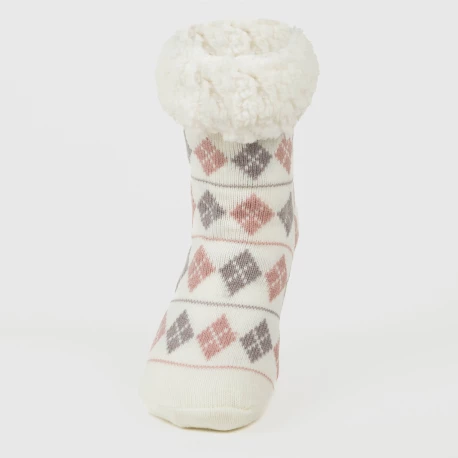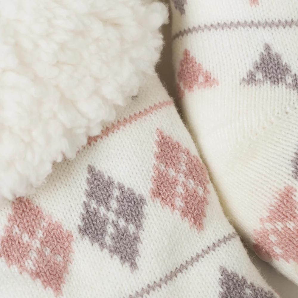 Calcetines térmicos de sherpa de color blanco con estampado de rombos y rayas en tonos grises y rosas, tienen agarres de silicona en la parte inferior que le permitirán andar con mayor seguridad por su suela antideslizante.