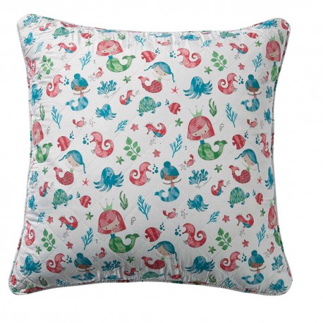 Cara frontal con diseño juvenil de sirenas, cangrejos, pulpos, burbujas y flores marinas simulando un fondo marino sobre fondo blanco, la cara trasera presenta el mismo diseño.
