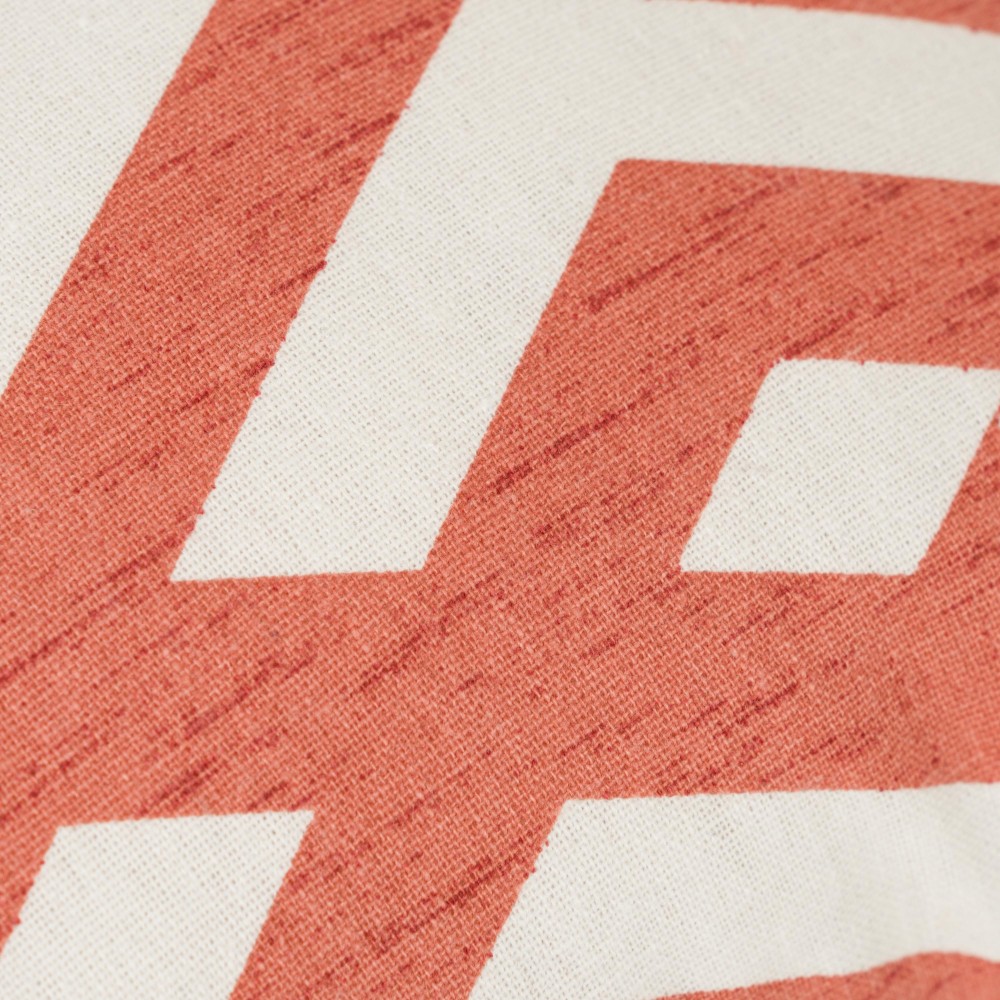 Presenta un estampado de rombos entrelazados sobre un fondo blanco.