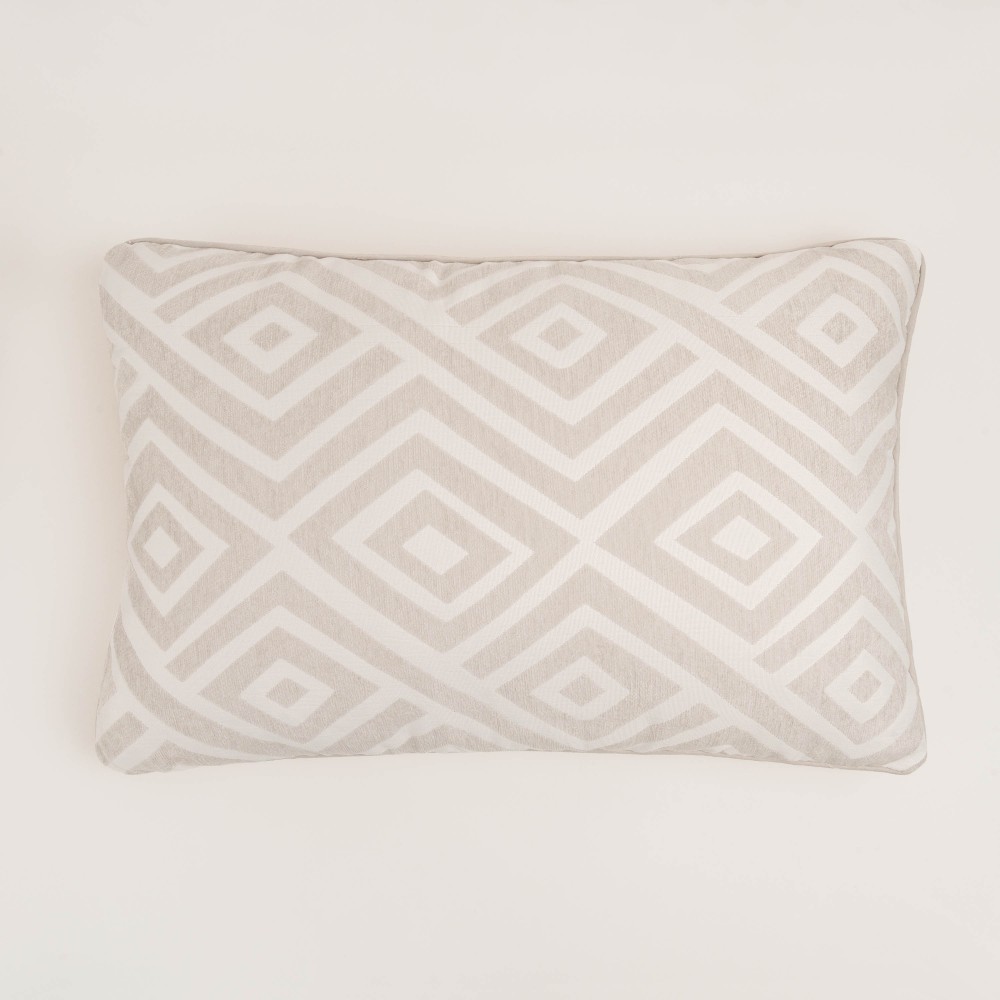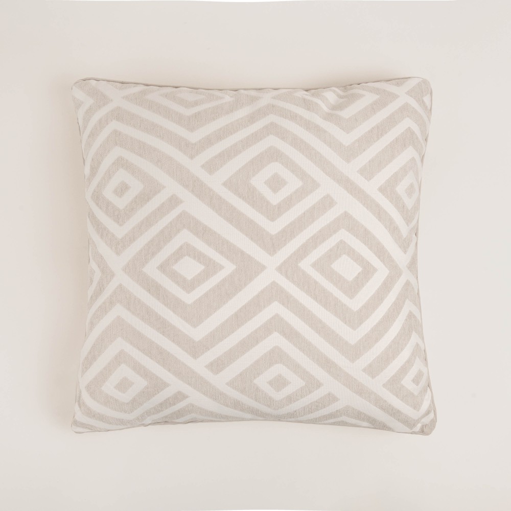 Cojín jacquard chenilla Feria perla con estampado a doble cara.