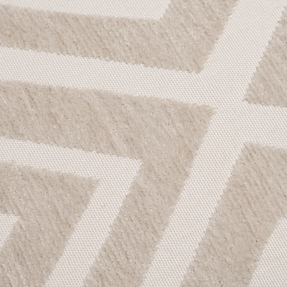 La cara delantera presenta un estampado original de rombos grises en diferentes tamaños sobre un fondo blanco en tejido chenilla que le aportan un efecto brillo estiloso y original, la cara trasera es de color perla liso.