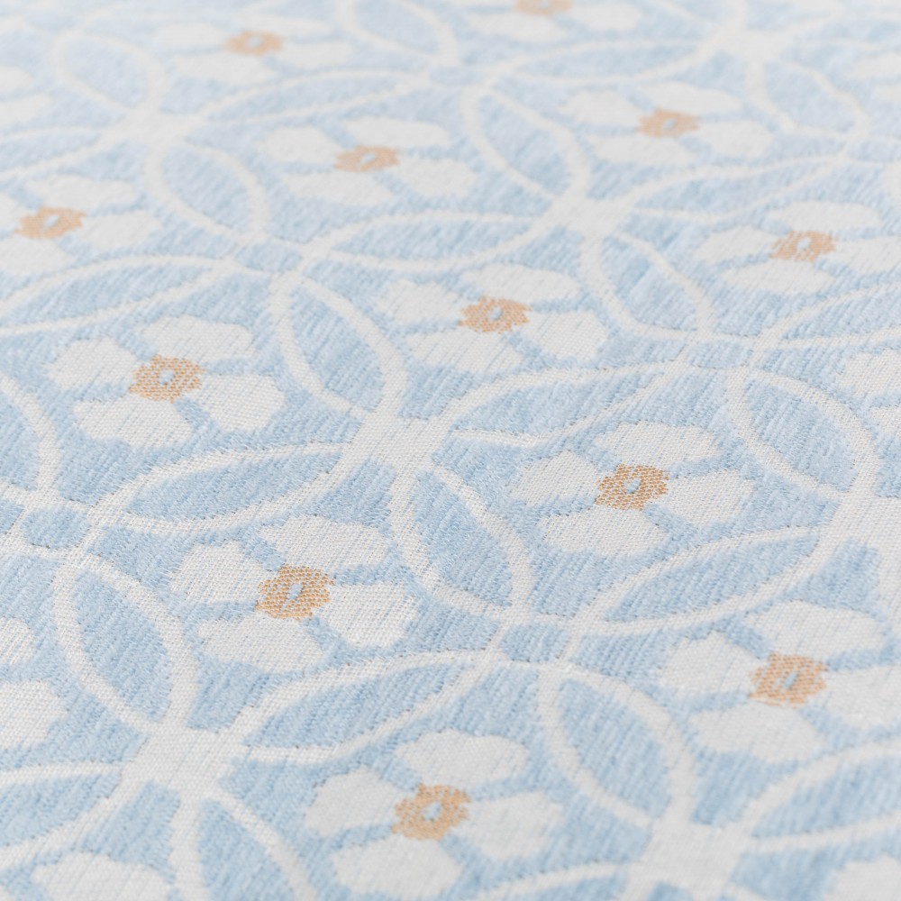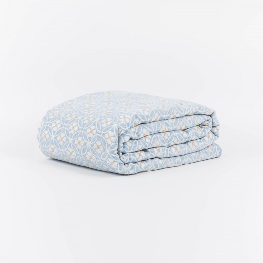 Colcha de 120gr. Cara delantera estampada con elegantes formas geométricas, cuenta con flores en diferentes tonos blancos y amarillos rodeados de un círculo en un tono índigo y blanco en tejido chenilla que le aportan un efecto brillo estiloso y original. La cara trasera es de color azul liso.