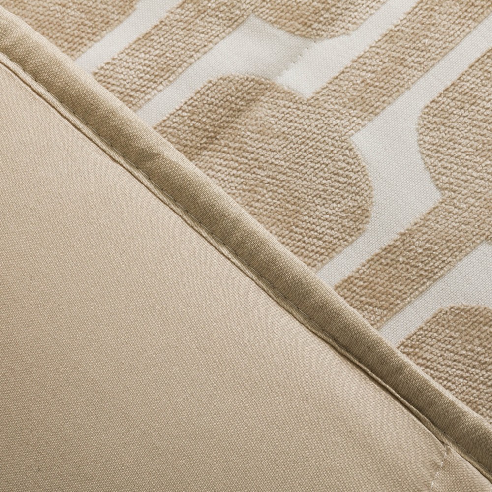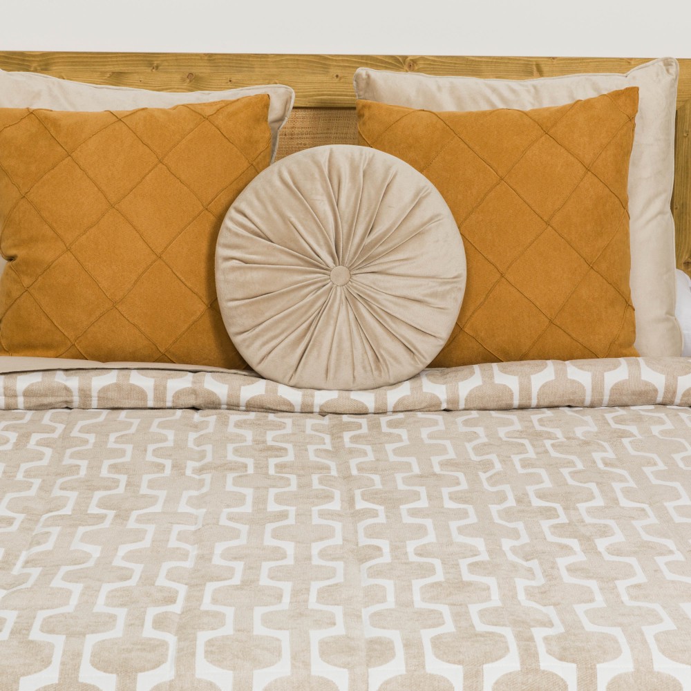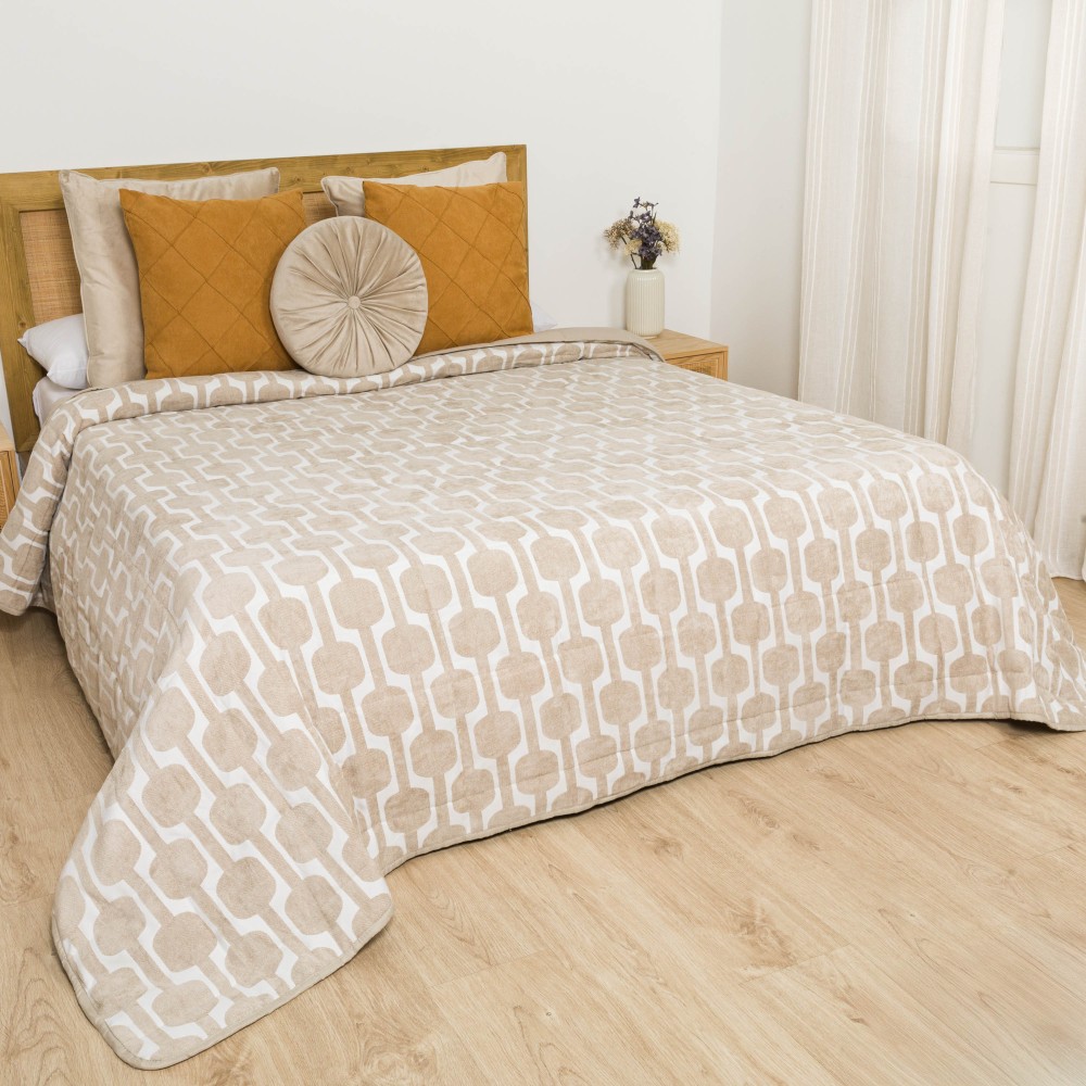 Colcha de 120gr. Cara delantera estampada con un diseño geométrico en color liso sobre un fondo blanco en tejido chenilla que le aportan un efecto brillo estiloso y original.