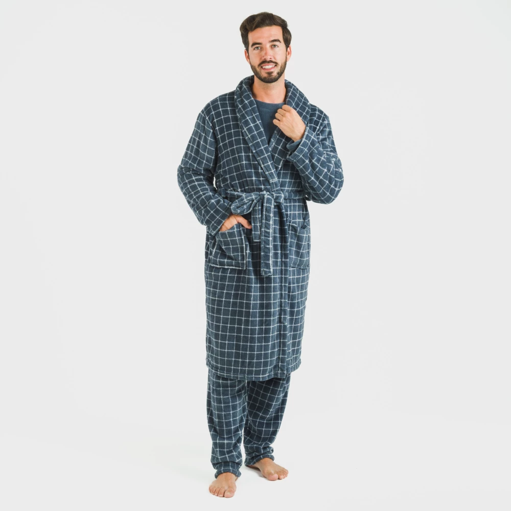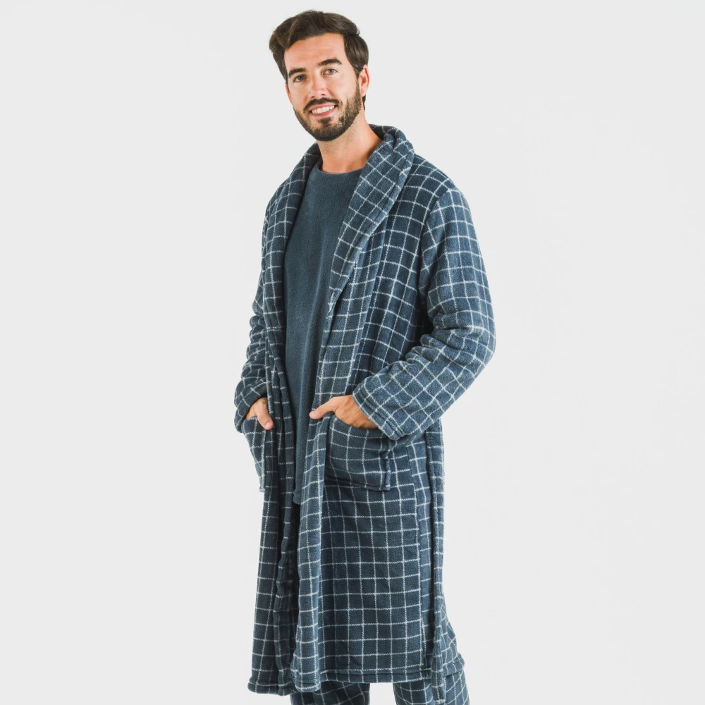 Bata de diseño sencillo de cuadros blancos sobre un fondo azul, fabricada con tejido de coralina muy suave y ajustable con cinturón.