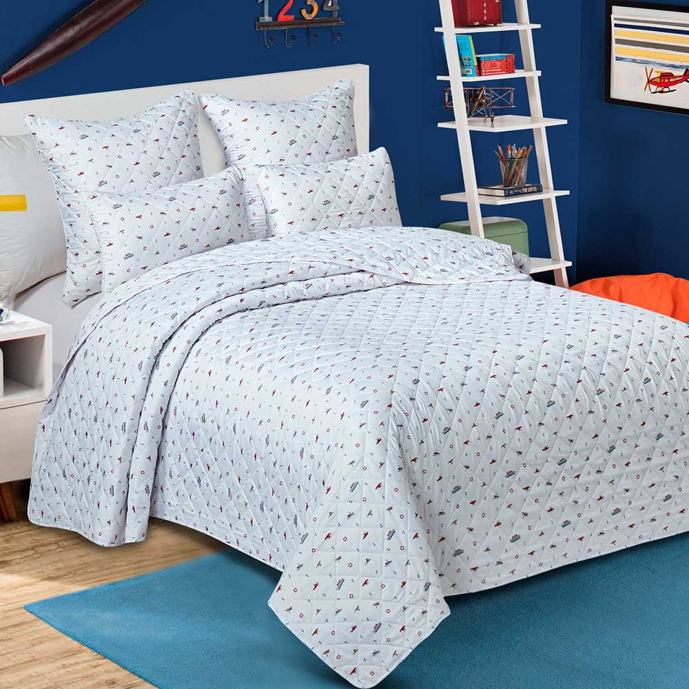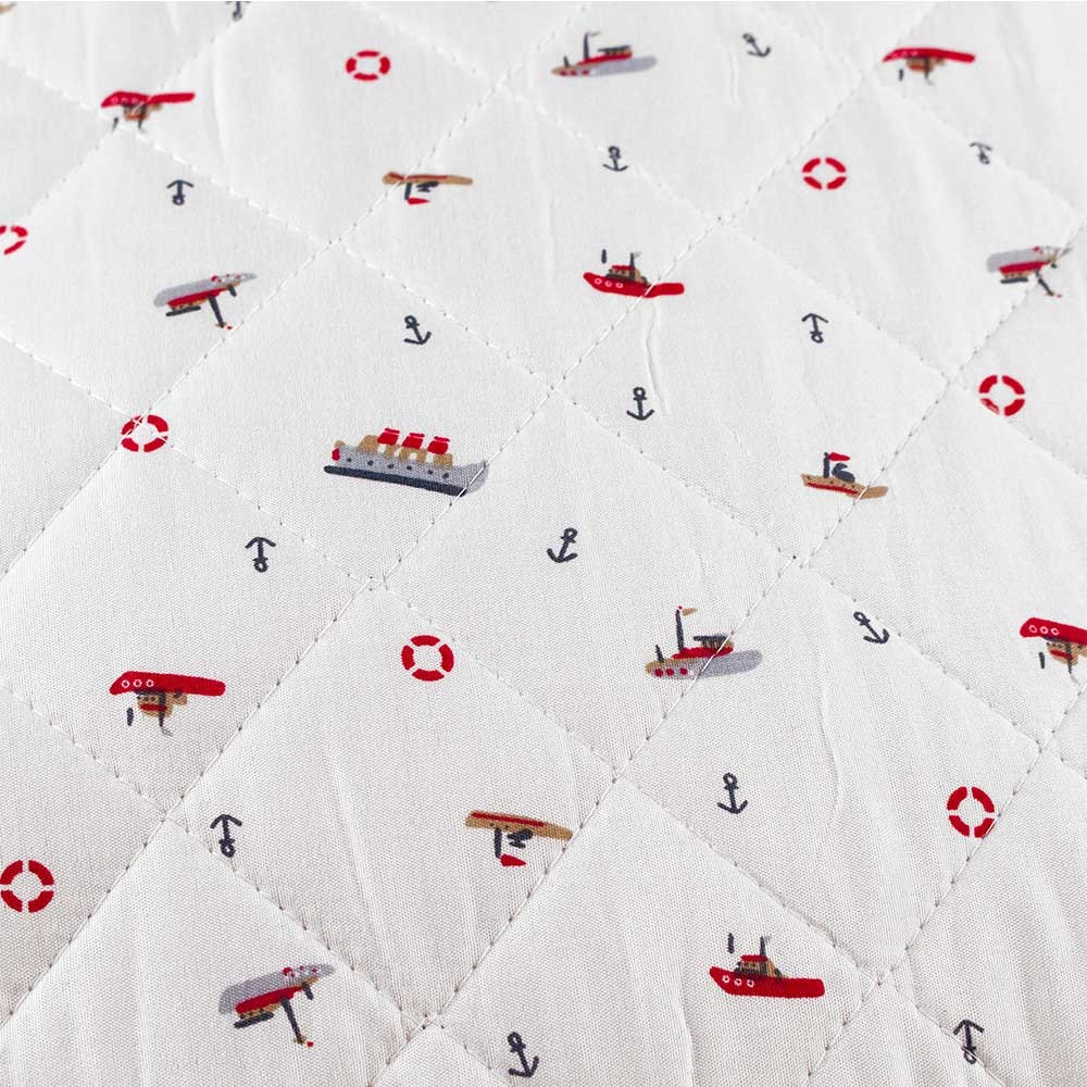 Colcha Bouti Little Ships con diseño de pequeños barcos, anclas y flotadores sobre un fondo blanco en la cara delantera, la cara trasera presenta el mismo diseño.