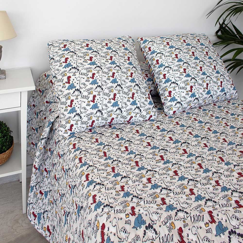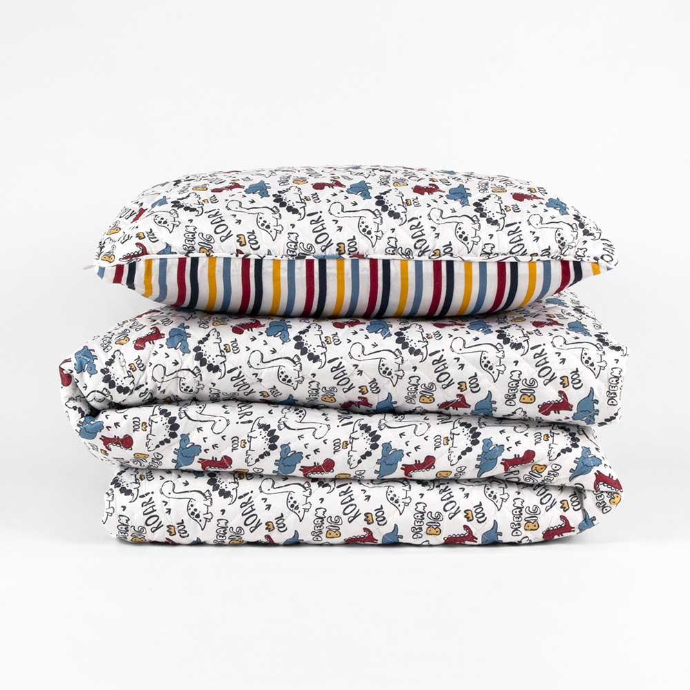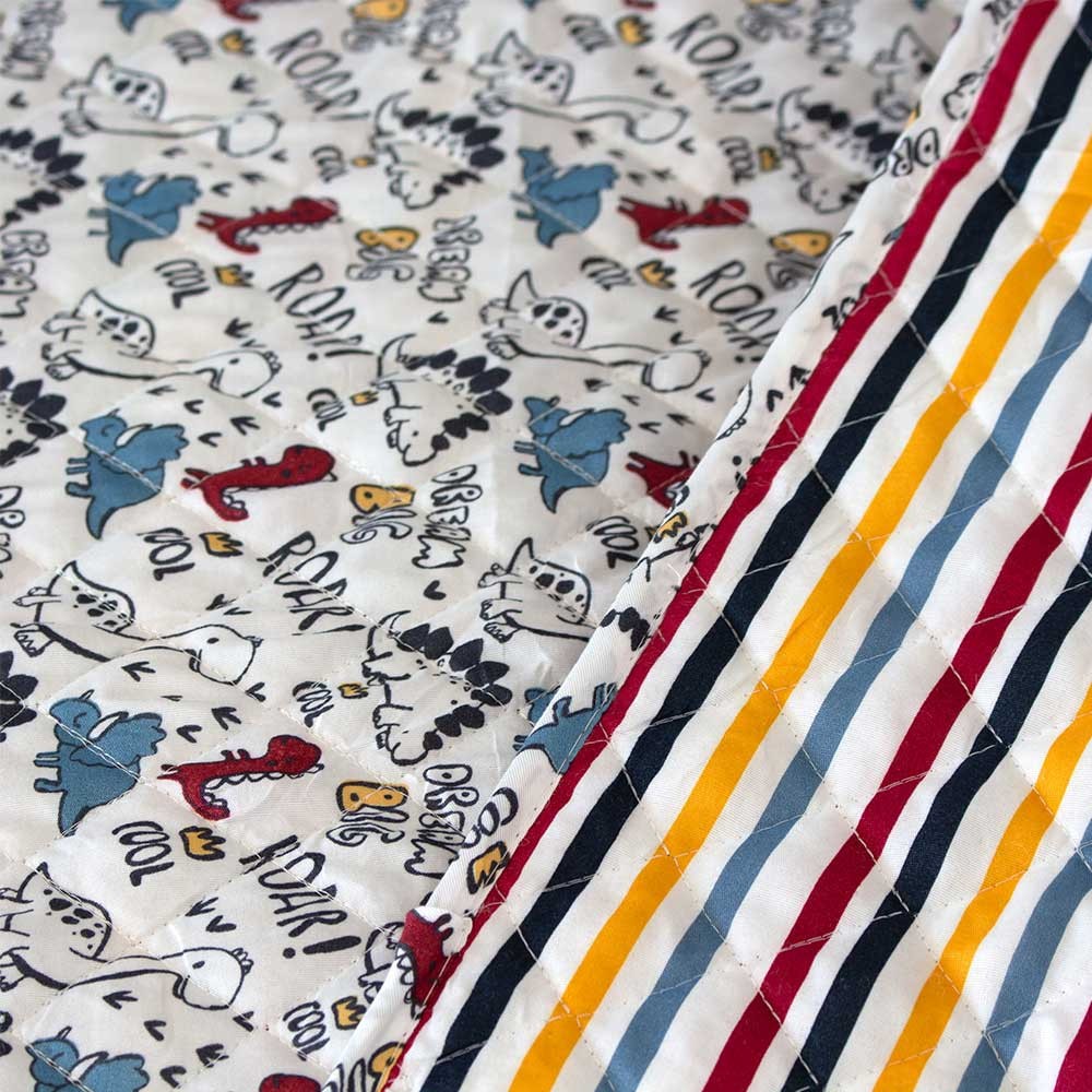 Colcha bouti Picapiedra con diferentes dinosaurios pequeños en tonos azules, rojos y blancos con algunos detalles como coronas, palabras y pisadas sobre el fondo blanco en la cara delantera, la cara trasera presenta rayas amarillas, azules y rojas sobre fondo blanco.