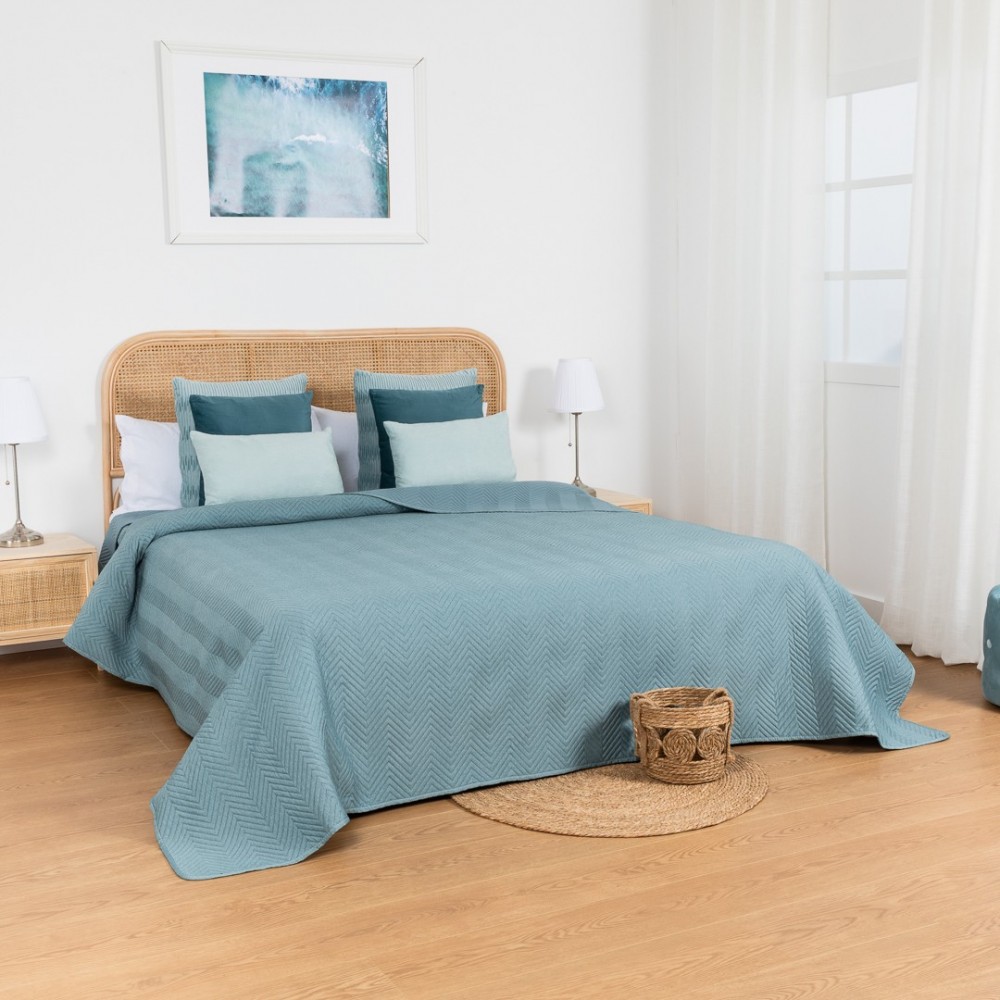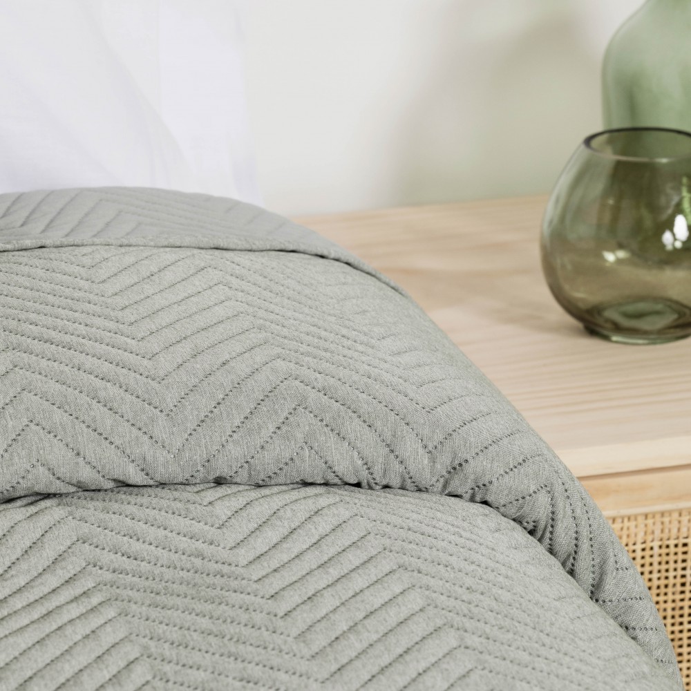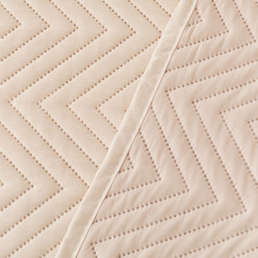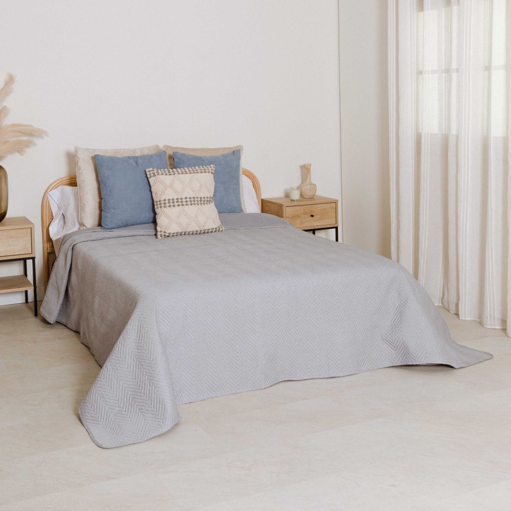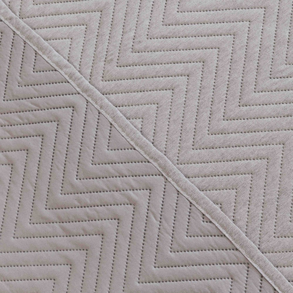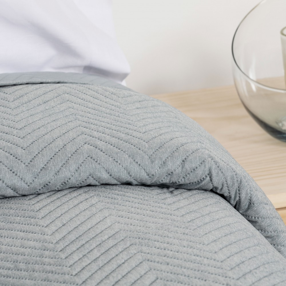 Su diseño es innovador y elegante con un pespunteado de zigzag sobre un fondo de estilo desgastado en la cara delantera, la cara trasera presenta el mismo diseño pero de color liso sencillo. El acabado de la colcha es recto con ribete bies del mismo tono, un modelo ideal para vestir tu cama en los meses de entretiempo de primavera y verano.
