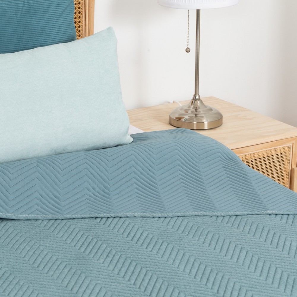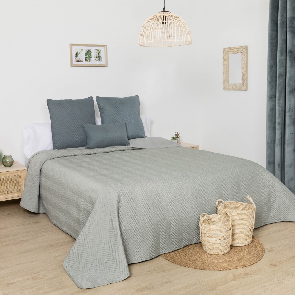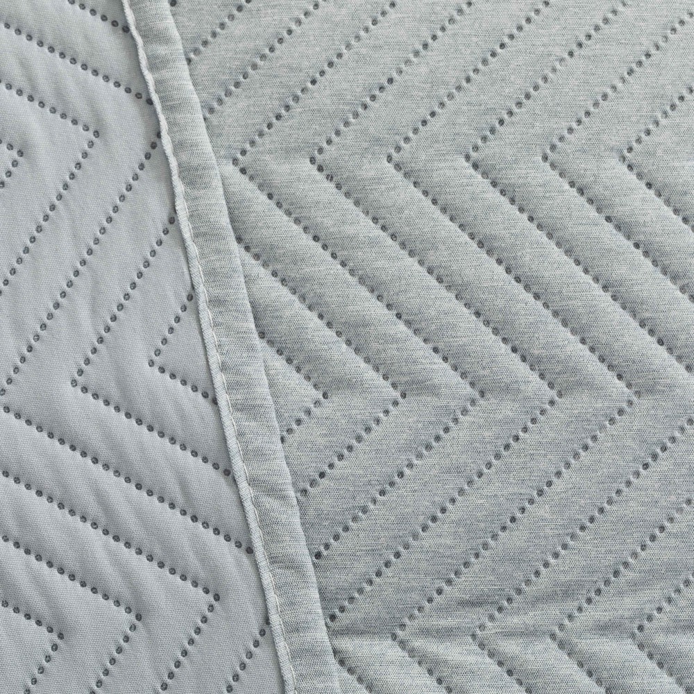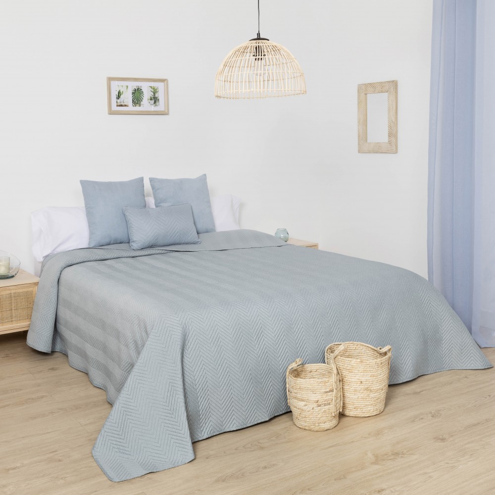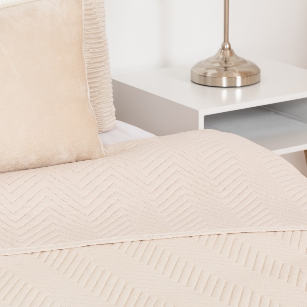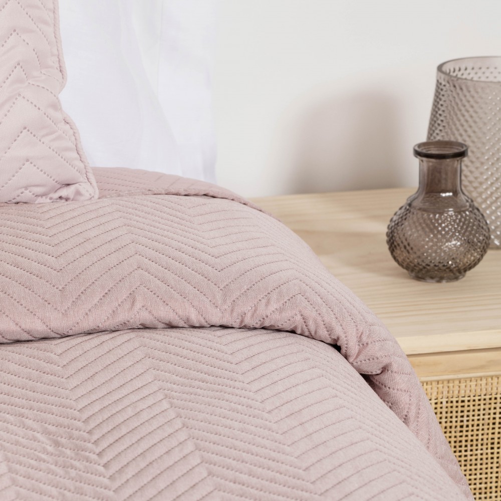 Su diseño es innovador y elegante con un pespunteado de zigzag sobre un fondo de estilo desgastado en la cara delantera, la cara trasera presenta el mismo diseño pero de color liso sencillo. El acabado de la colcha es recto con ribete bies del mismo tono, un modelo ideal para vestir tu cama en los meses de entretiempo de primavera y verano.