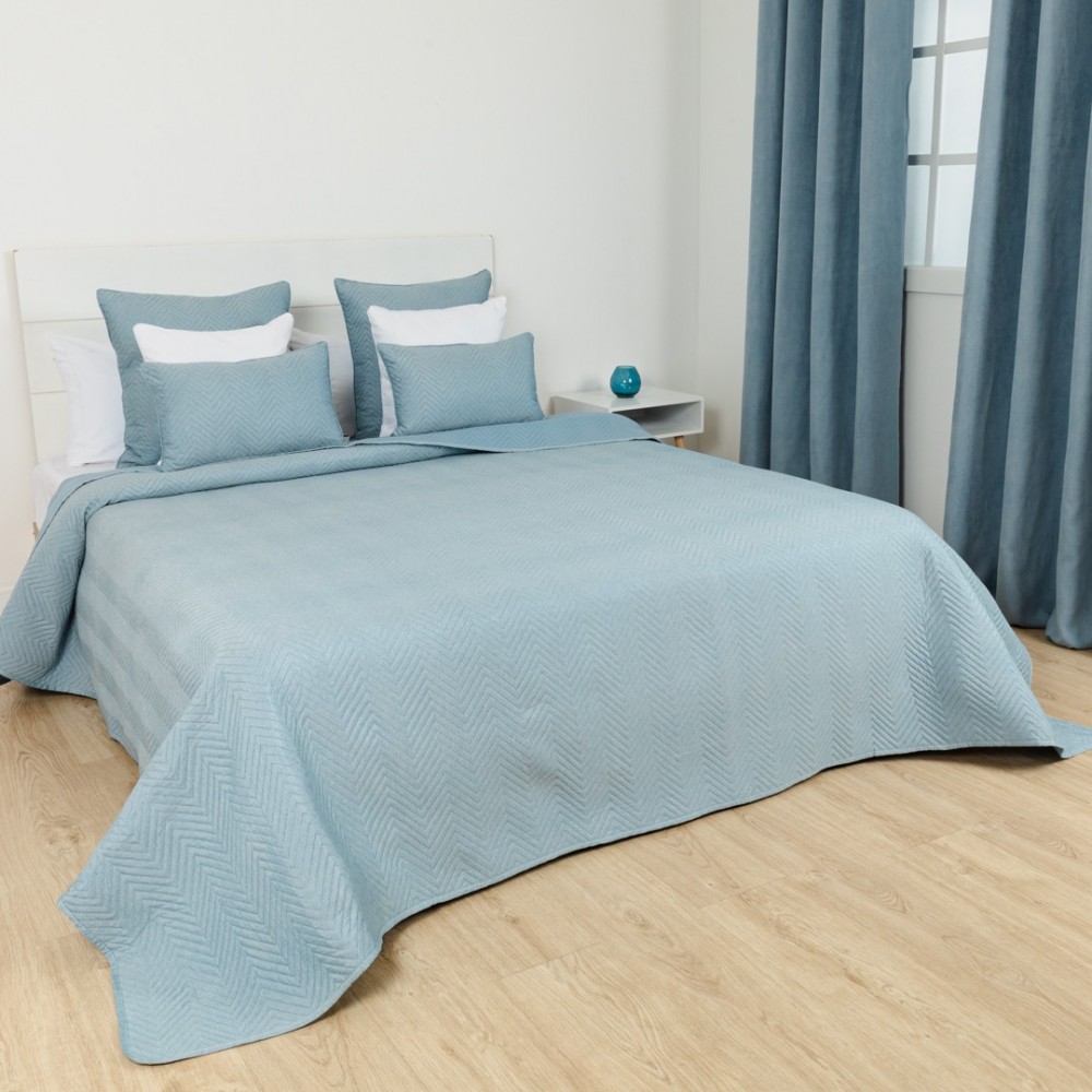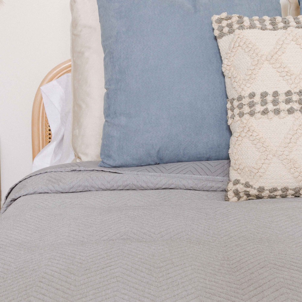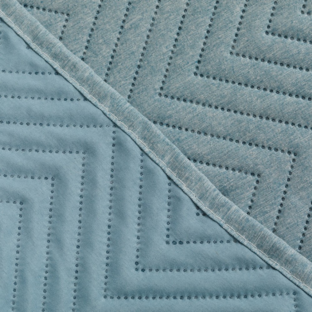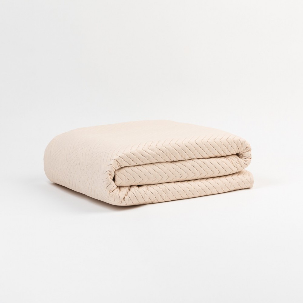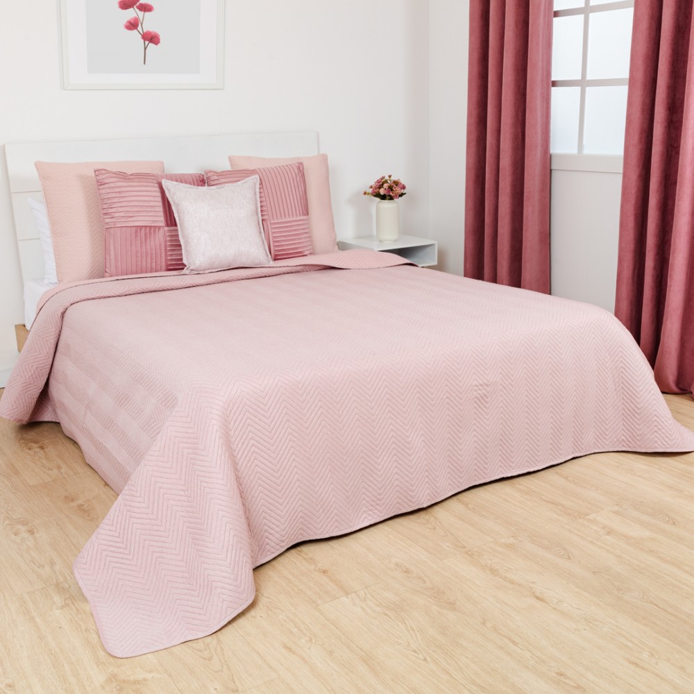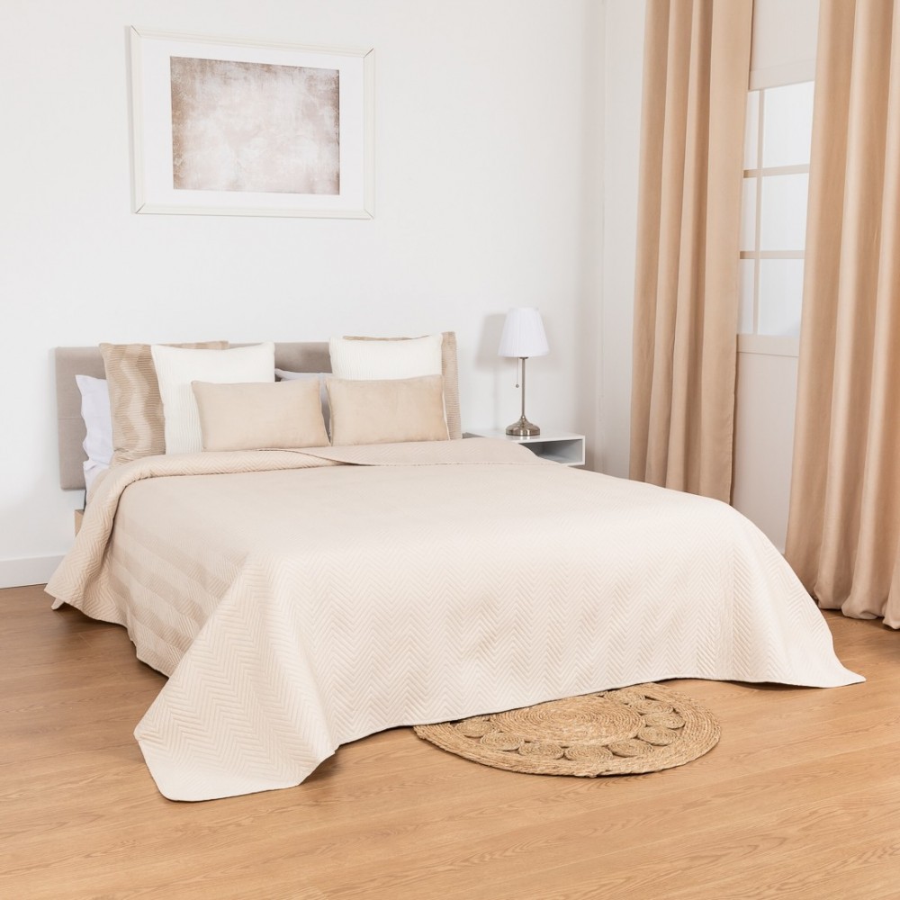 Su diseño es innovador y elegante con un pespunteado de zigzag sobre un fondo de estilo desgastado en la cara delantera, la cara trasera presenta el mismo diseño pero de color liso sencillo. El acabado de la colcha es recto con ribete bies del mismo tono, un modelo ideal para vestir tu cama en los meses de entretiempo de primavera y verano.
