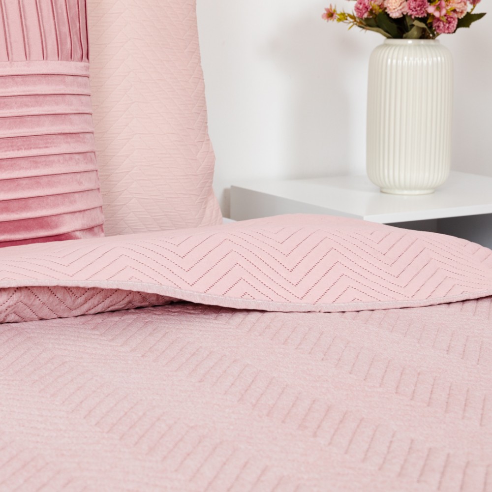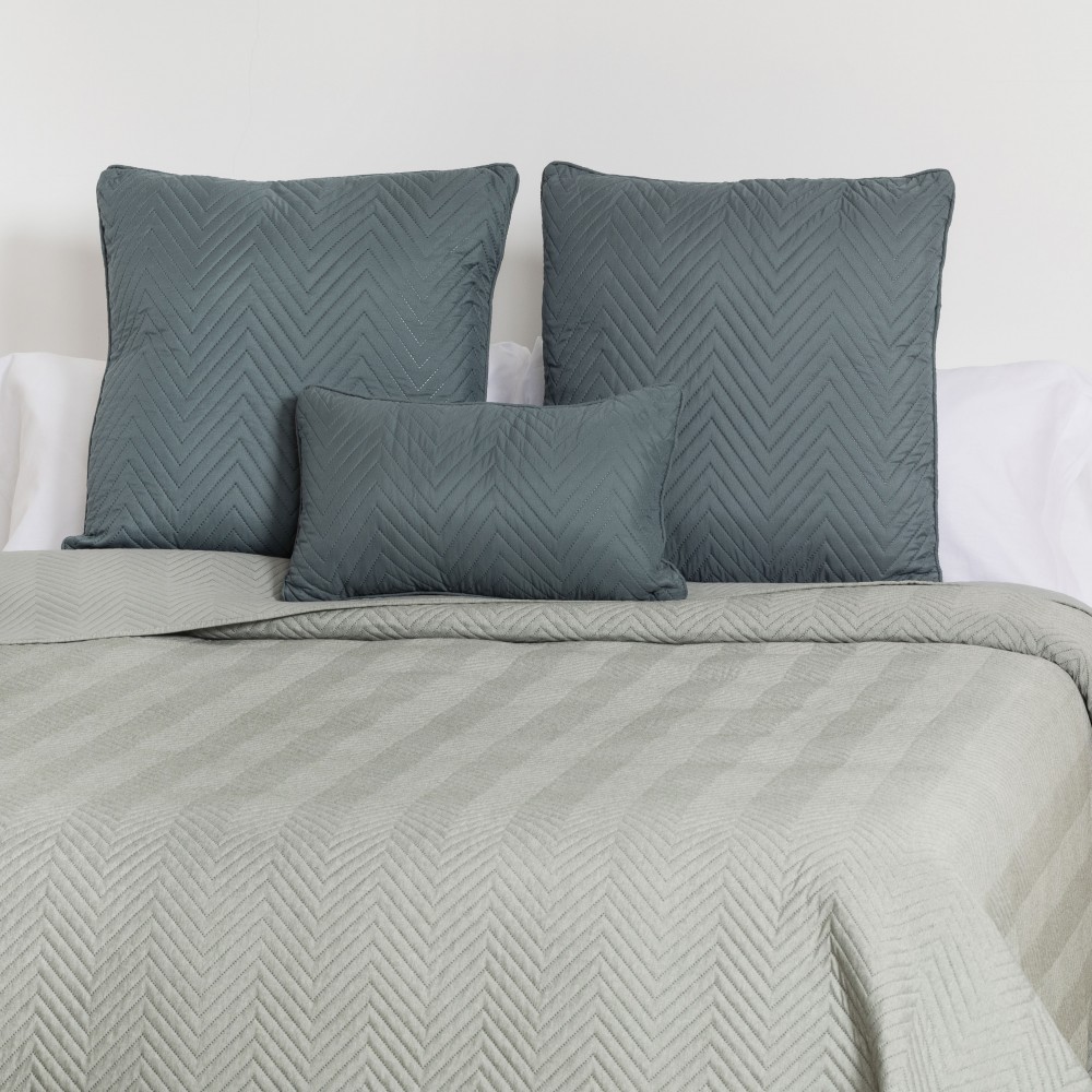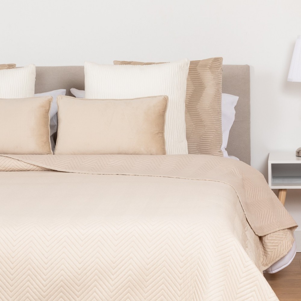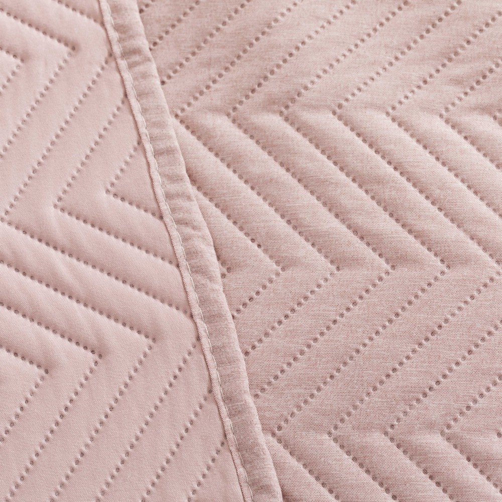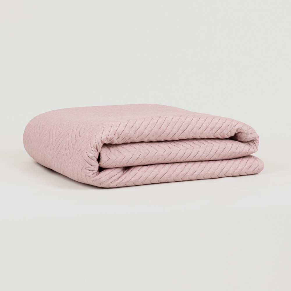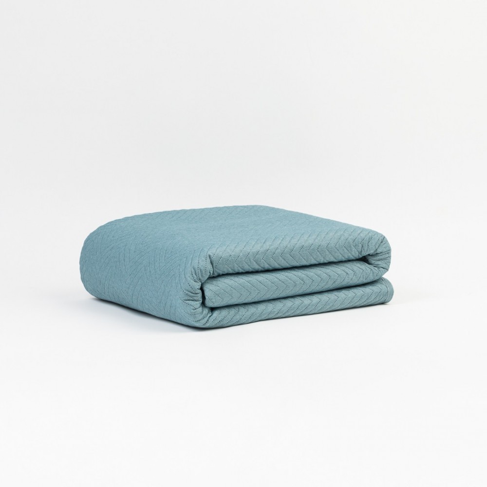 Su diseño es innovador y elegante con un pespunteado de zigzag sobre un fondo de estilo desgastado en la cara delantera, la cara trasera presenta el mismo diseño pero de color liso sencillo. El acabado de la colcha es recto con ribete bies del mismo tono, un modelo ideal para vestir tu cama en los meses de entretiempo de primavera y verano.