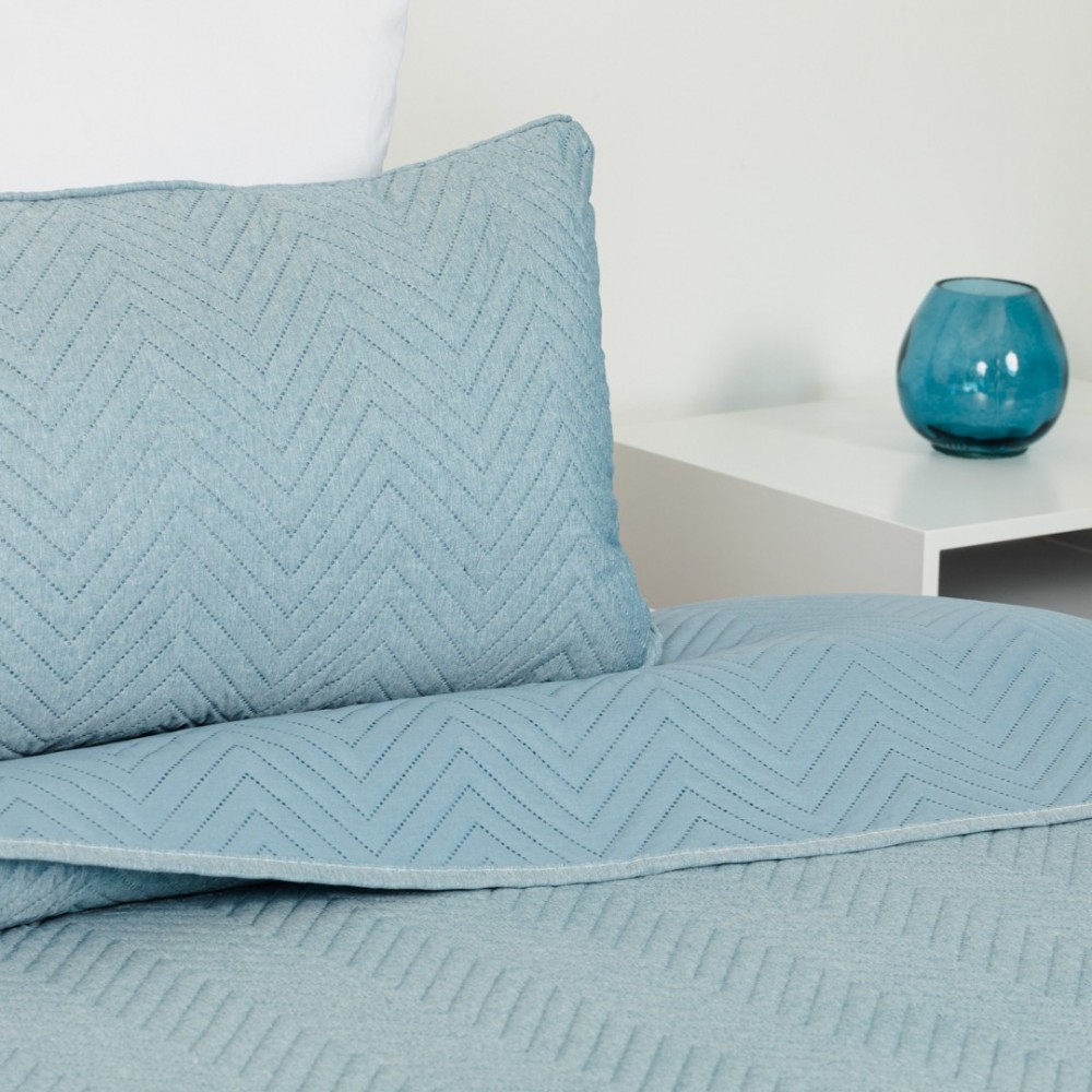 Presenta un color liso con efecto desgastado y detalle de pespunteado de zigzag en la cara delantera, su cara trasera es del mismo estilo pero de color liso sencillo, ideal para vestir tu cama en los meses de primavera y verano por su fino acolchado.