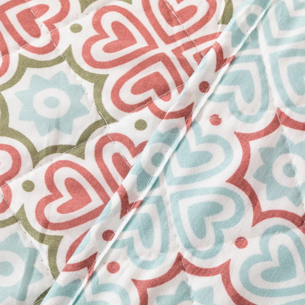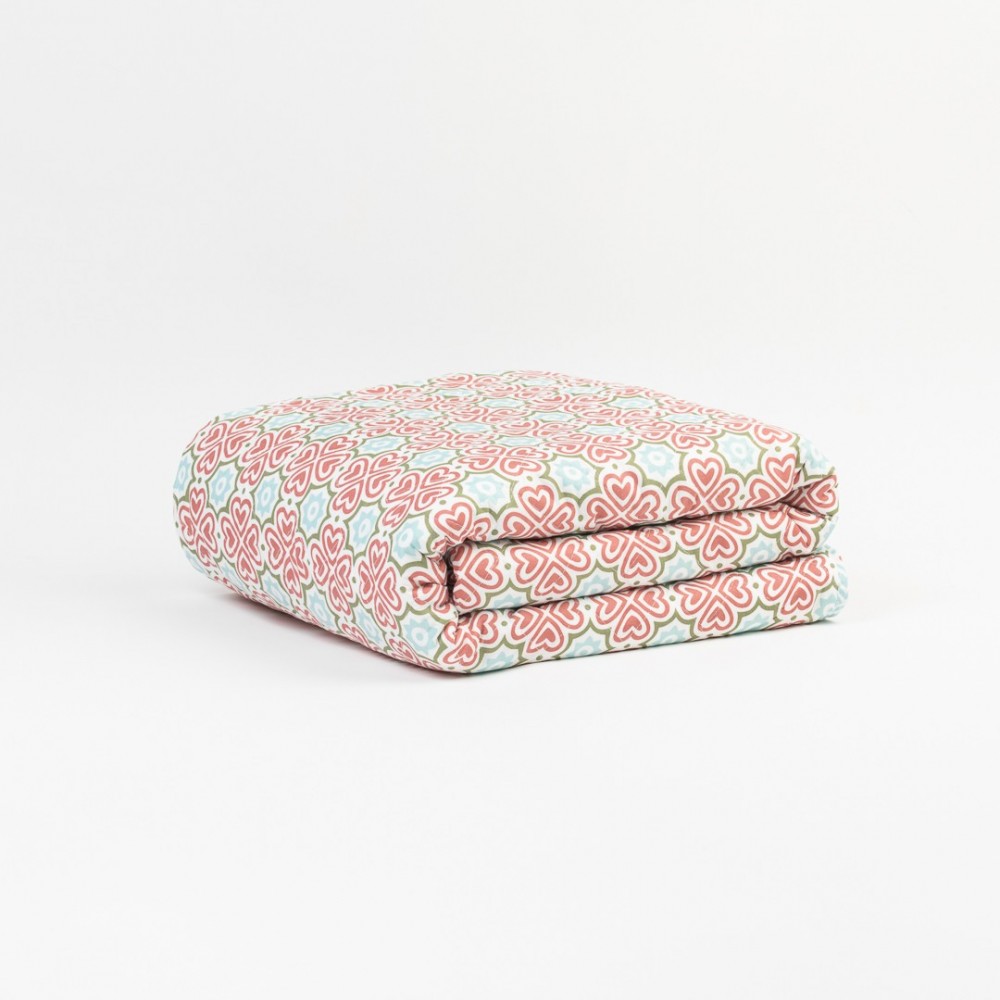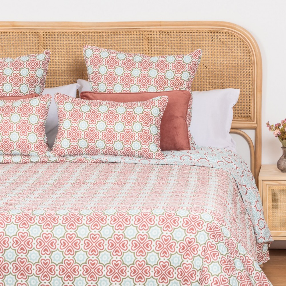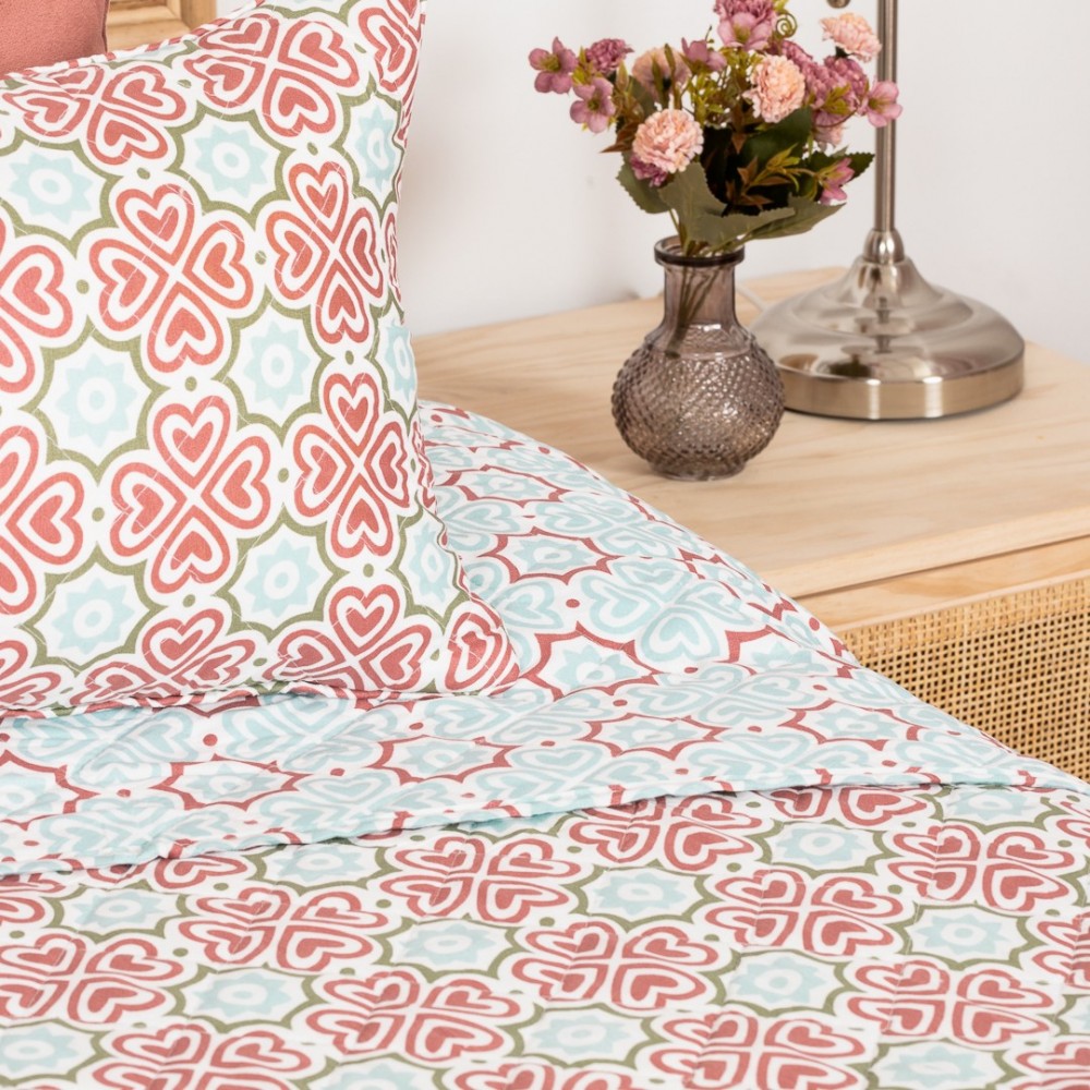 Colcha bouti Capri marsala con estampado geométrico original y colorido de corazones y soles en tonos verdes, marsala y azul sobre un fondo blanco, la cara trasera presenta el mismo diseño pero con diferentes colores.