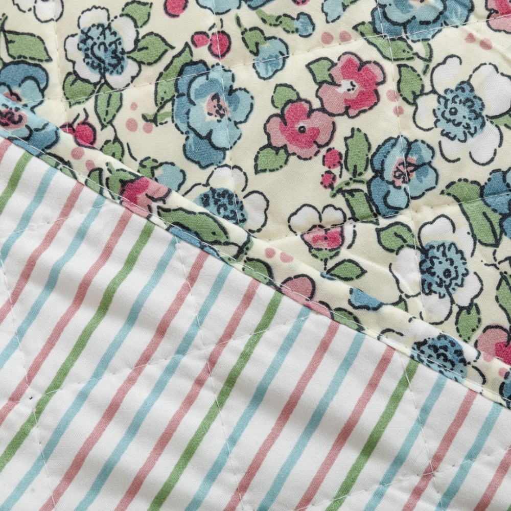 Colcha bouti modelo Belinda verde tiffany con estampado de flores pequeñas en tonos rosas, azules y blanco con hojas verdes sobre un fondo beige, la cara trasera es de rayas en los mismos colores sobre fondo blanco.