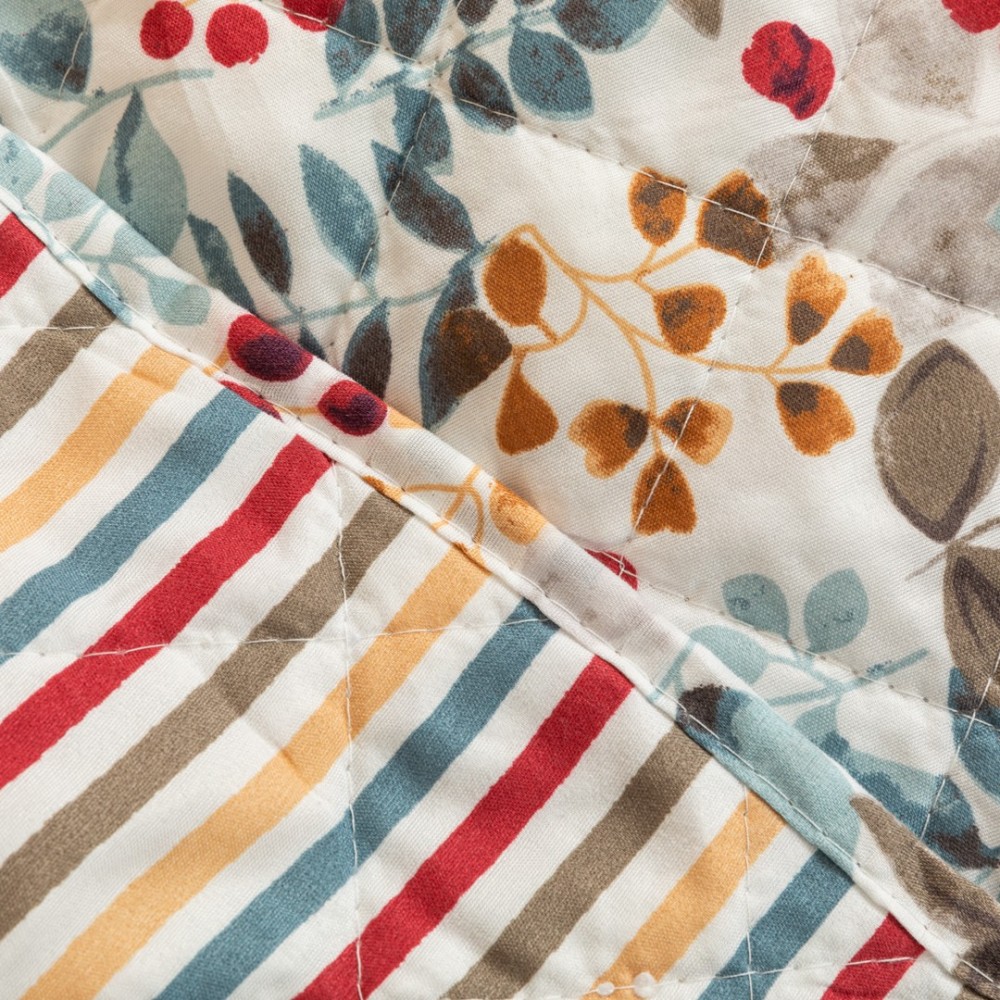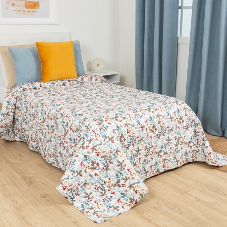 Colcha bouti modelo Viena índigo con estampado alegre y primaveral de diferentes modelos de hojas en varios colores como el verde, gris, arena y rojo sobre un fondo blanco, la cara trasera es de rayas en los mismos colores.