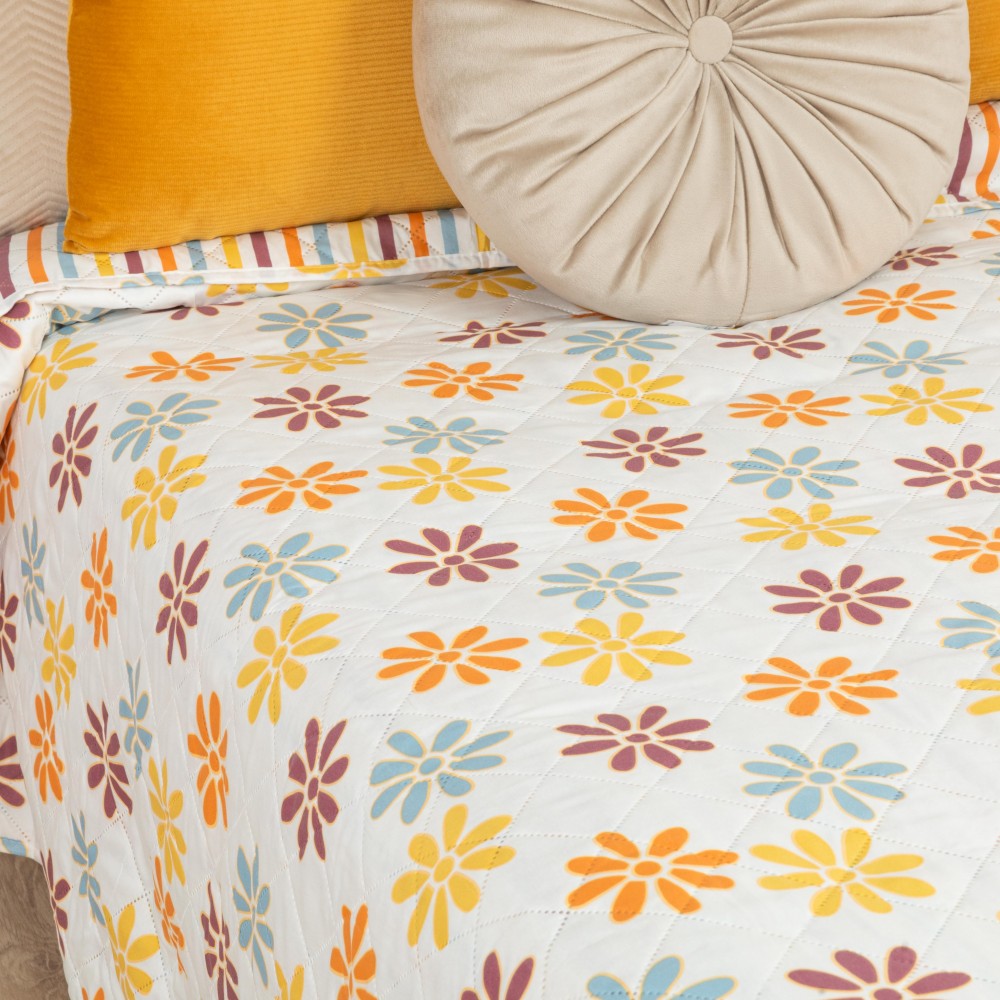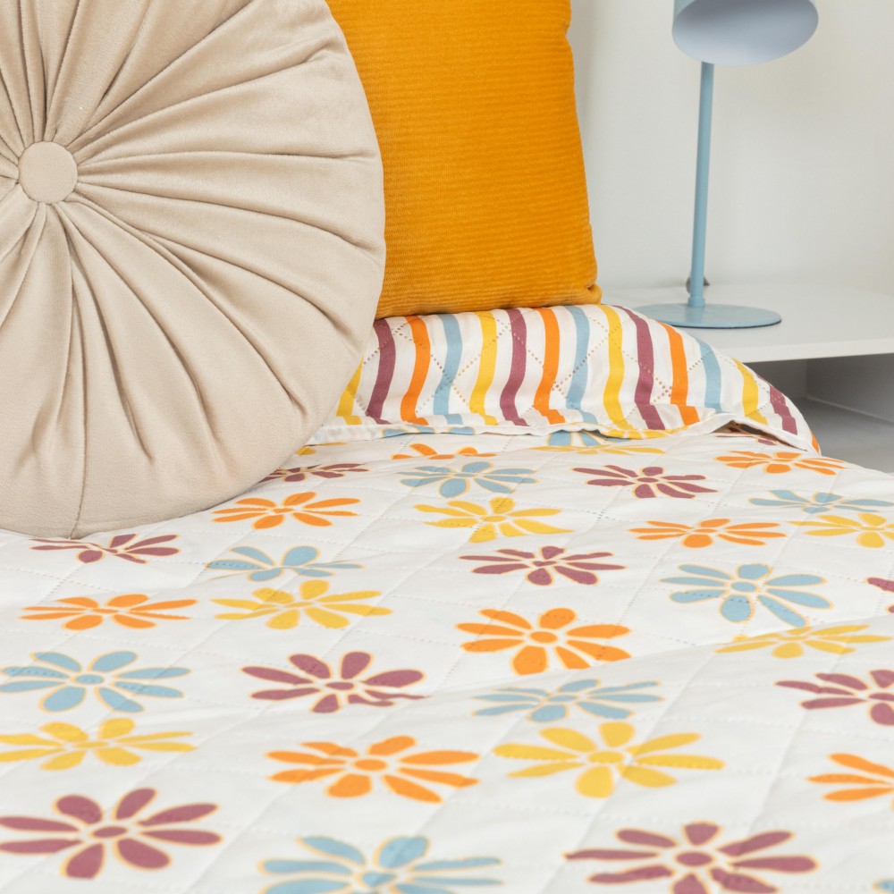 Presenta un estampado alegre y juvenil de flores en tonos naranjas, amarillos y azules sobre un fondo blanco, la cara trasera es de rayas en los mismos tonos.