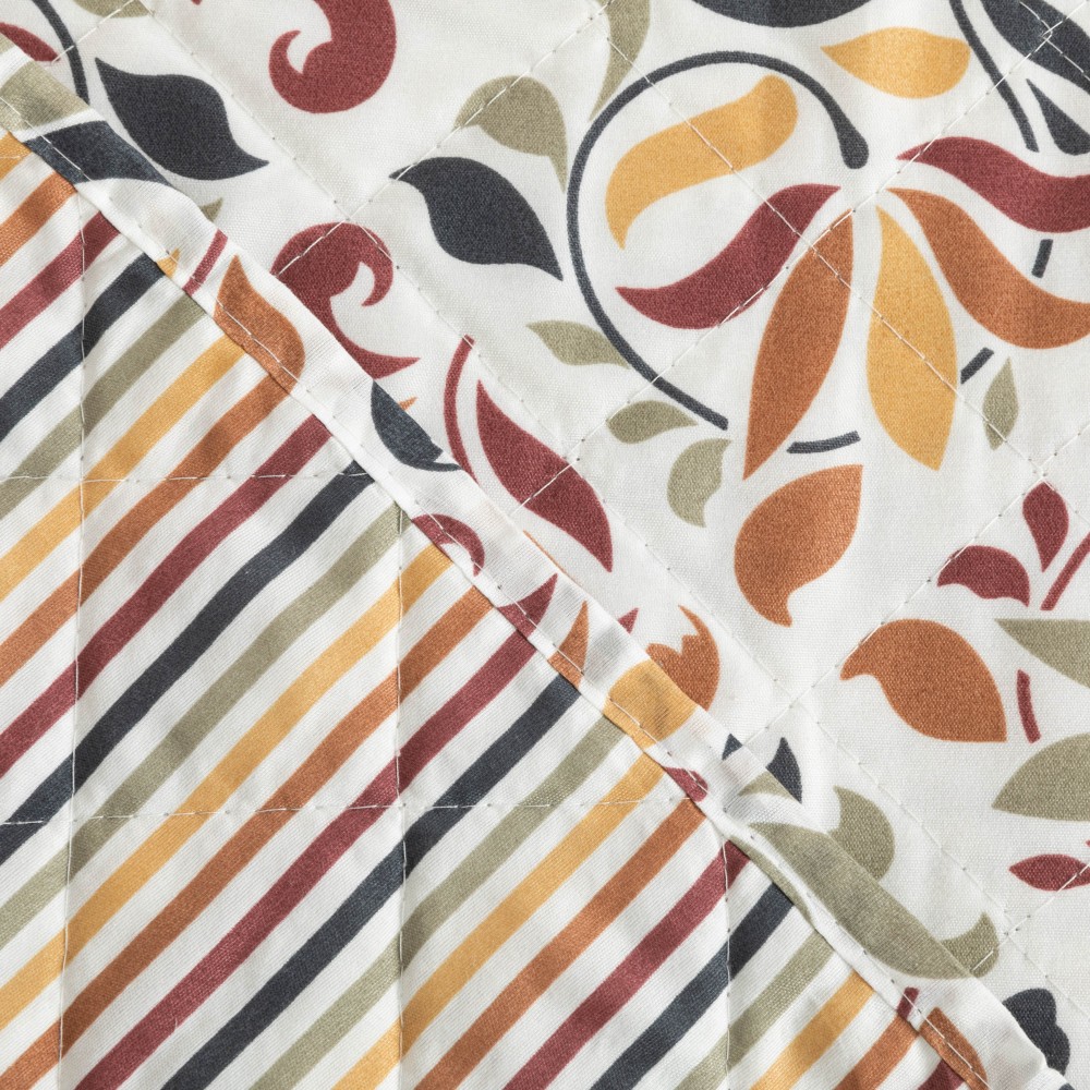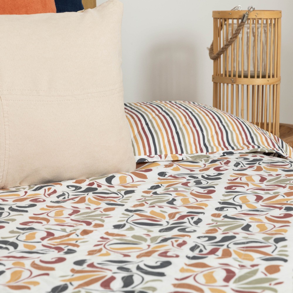 Presenta un estampado original de grandes flores y hojas en tonos verdes, naranjas, amarillo y malva sobre un fondo blanco, la cara trasera es de rayas en los mismos colores.