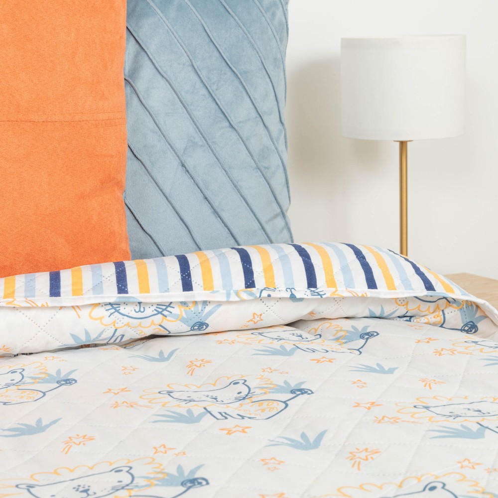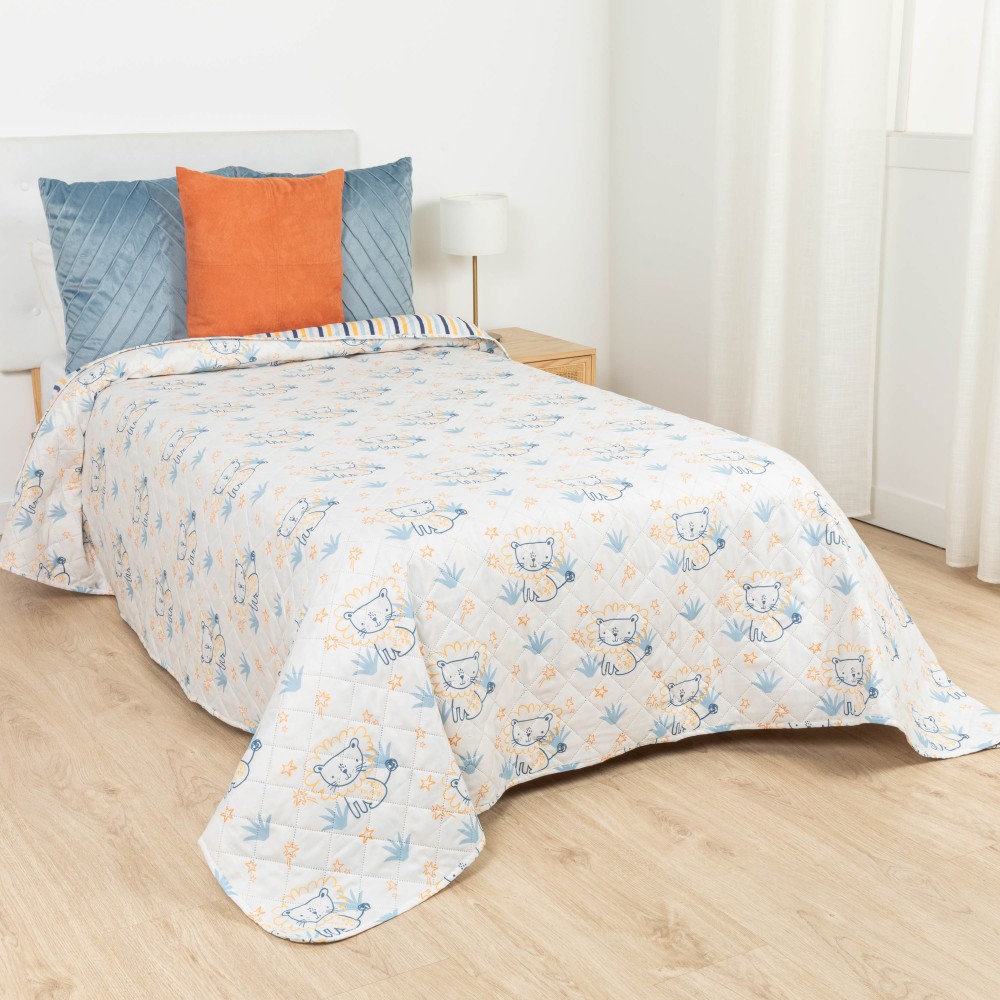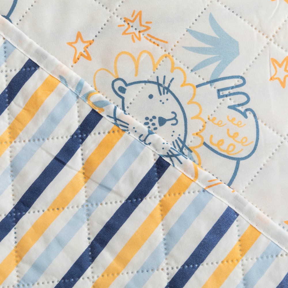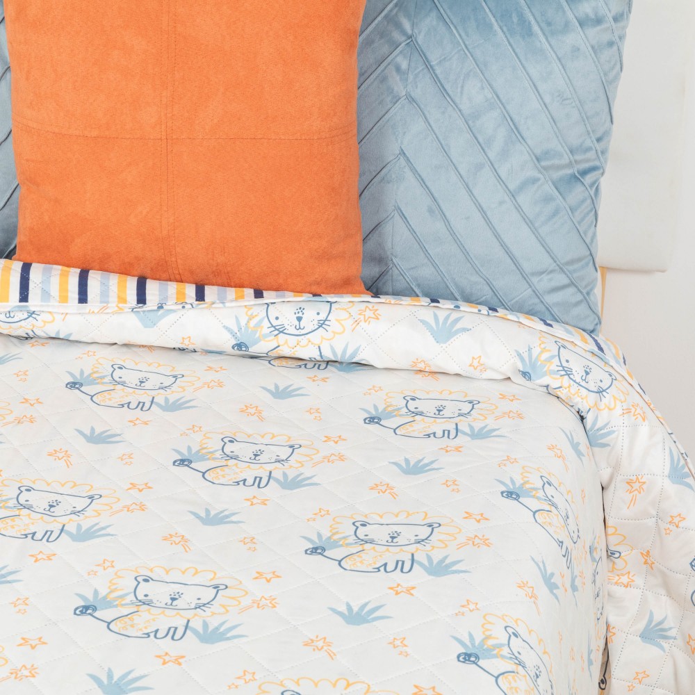 Presenta un estampado juvenil de leones y estrellas en tonos azules y amarillos sobre un fondo blanco, la cara trasera es de rayas en los mismos colores.