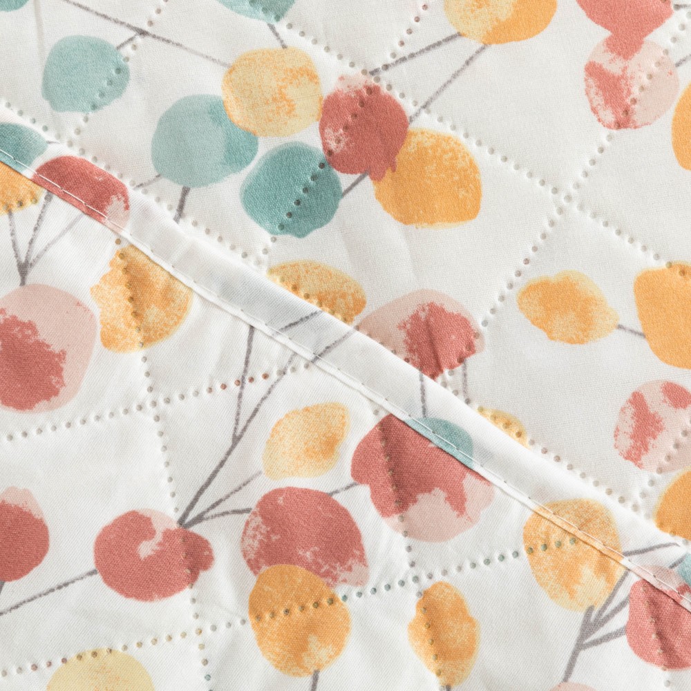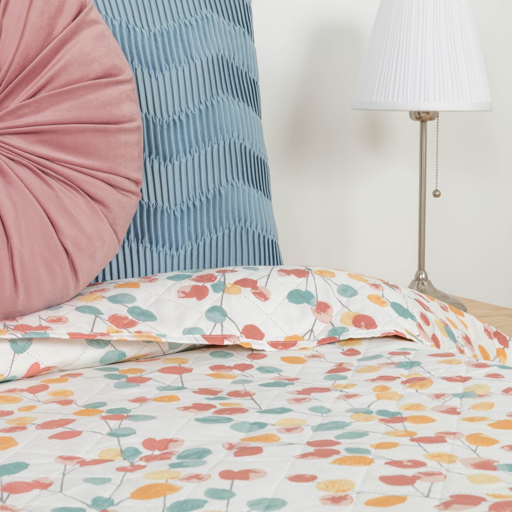 Presenta un estampado de hojas en diferentes tonos rosas, verdes y naranjas sobre un fondo blanco, la cara trasera presenta el mismo diseño.
