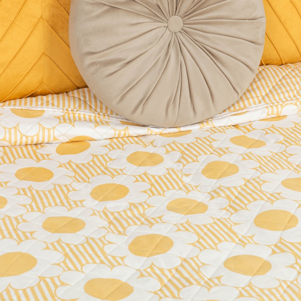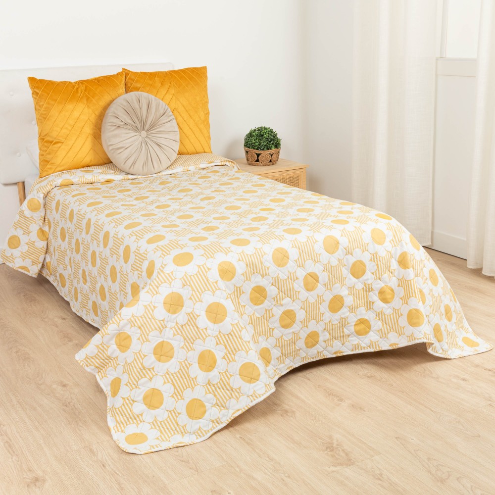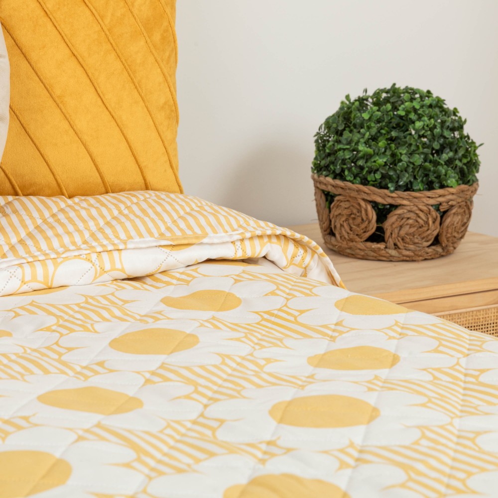 Presenta un estampado de flores sobre un fondo de rayas en tonos mostaza y blanco, la cara trasera es de rayas en los mismos colores.