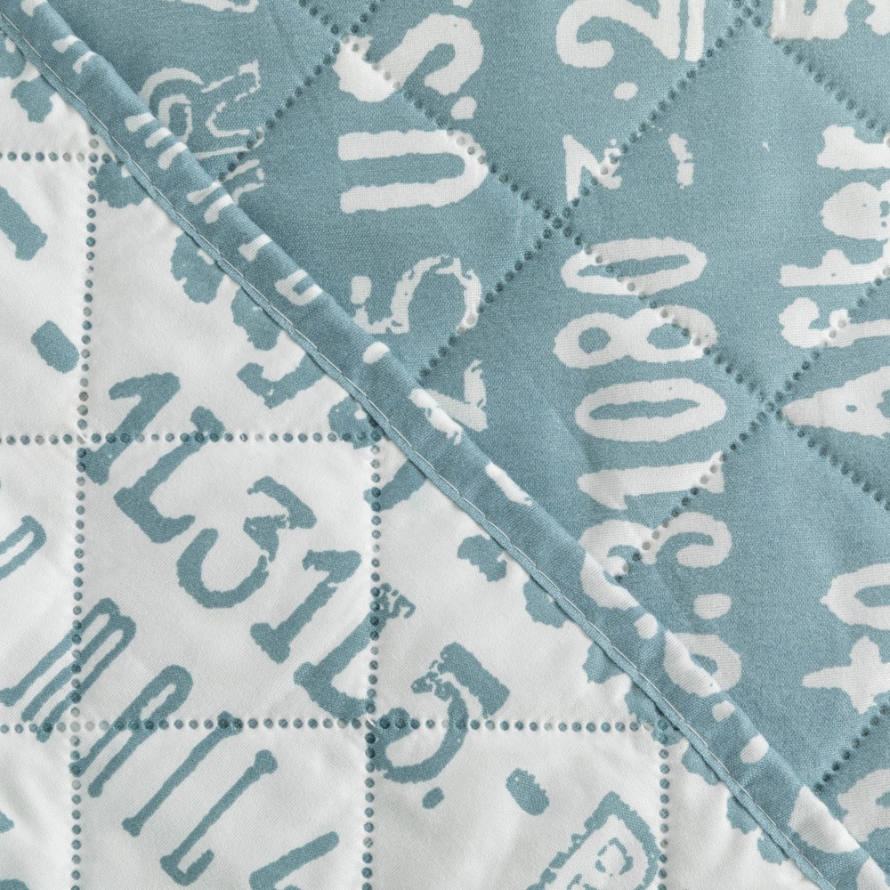 Presenta un estampado de letras y números en color blanco sobre un fondo azul, la cara trasera presenta el mismo diseño pero a la inversa, letras azules sobre fondo blanco.