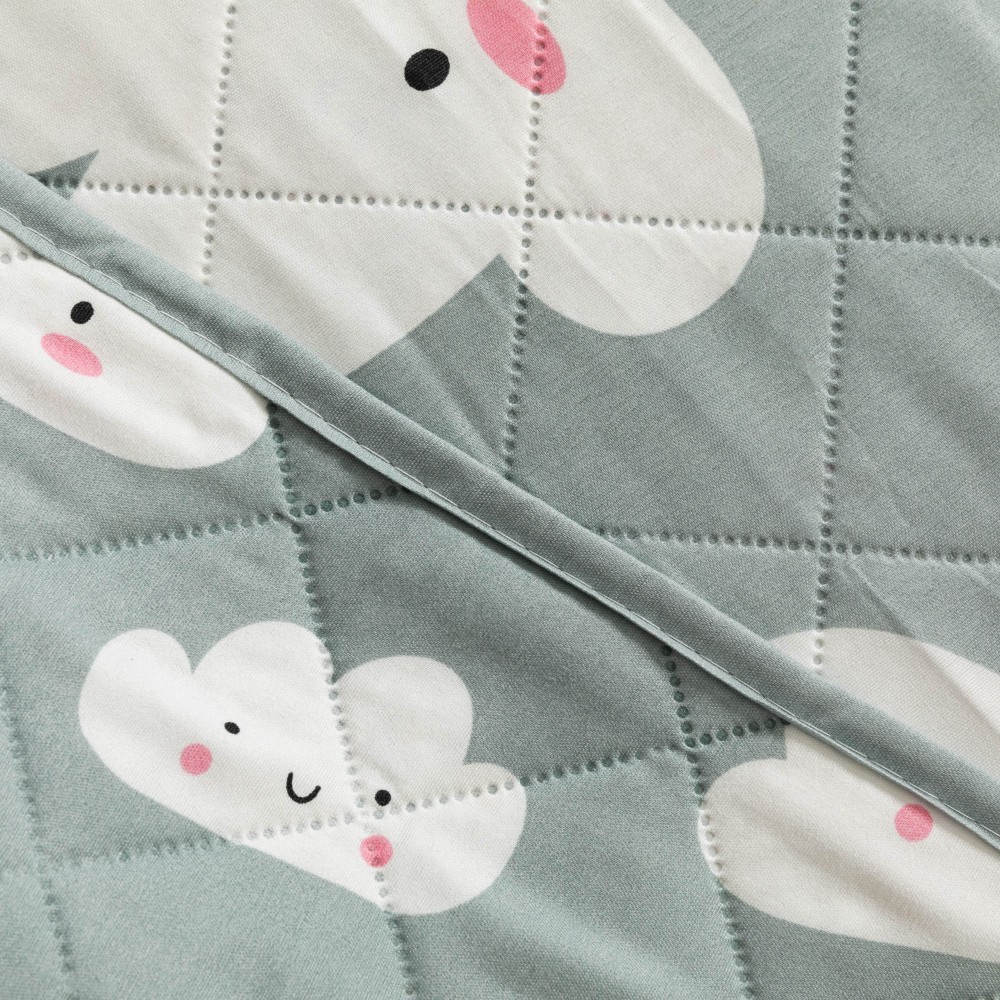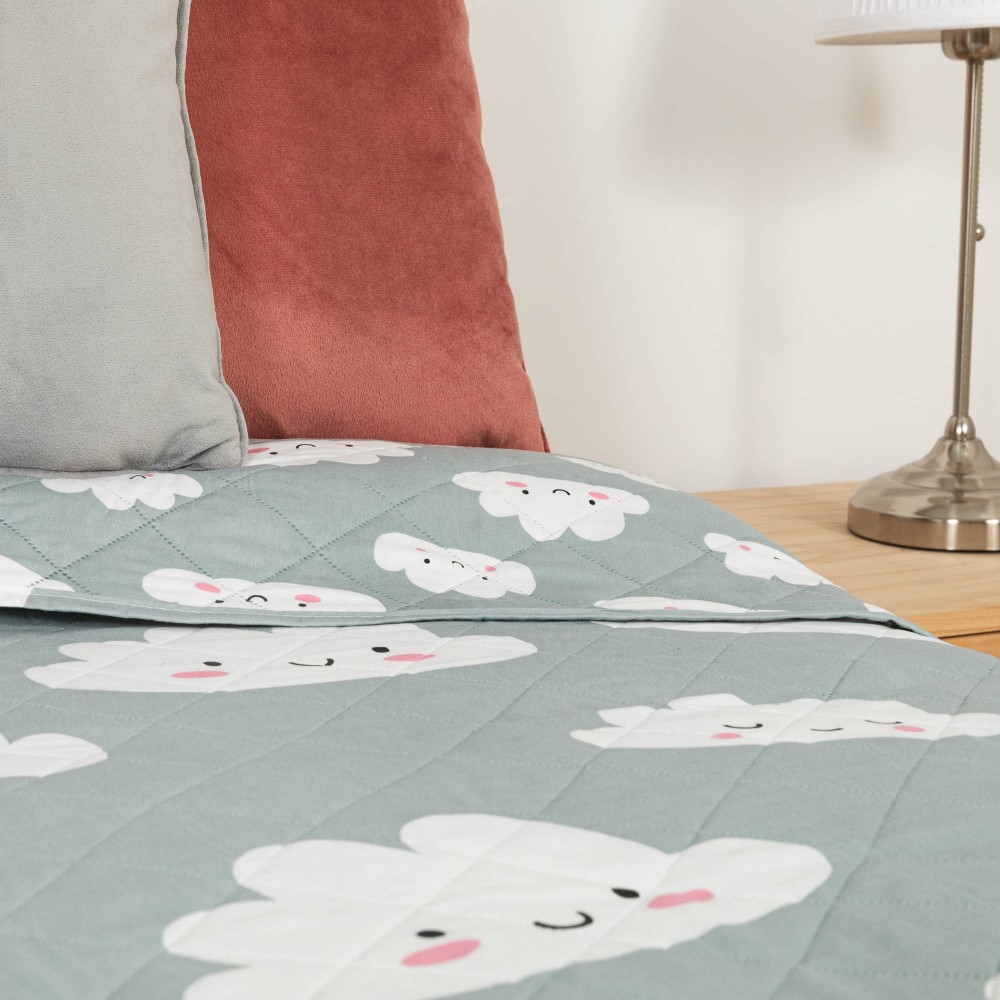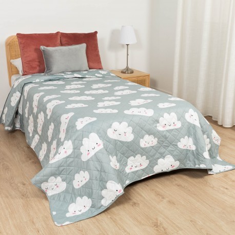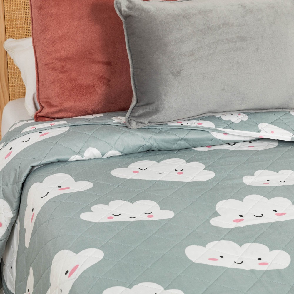 Presenta un estampado juvenil de nubes blancas con caritas sonrientes sobre un fondo azul celeste, la cara trasera presenta el mismo diseño.