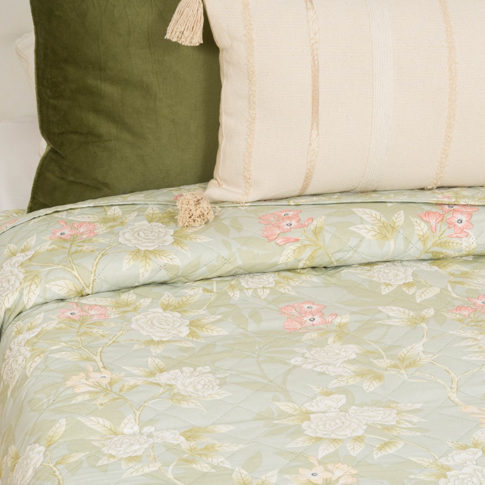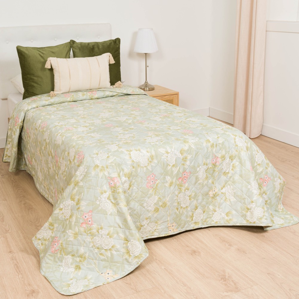 Presenta un estampado elegante de flores en tonos verdes, rosas y blanco sobre un fondo verde claro, la cara trasera presenta el mismo diseño.