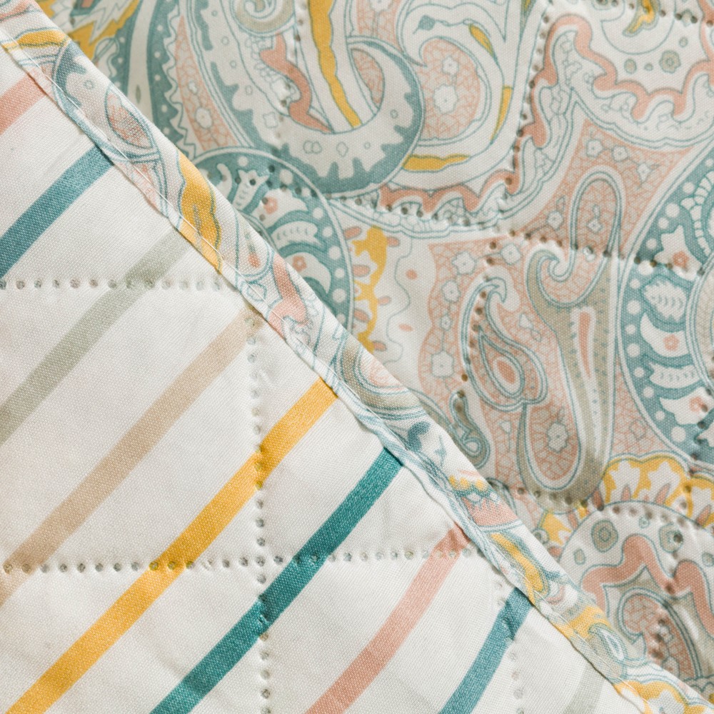 Su diseño presenta un estampado de cachemir elegante y original en tonos verde, rosas y beige sobre un fondo blanco, la cara trasera es blanca con rayas en diferentes colores.