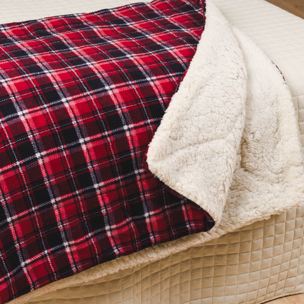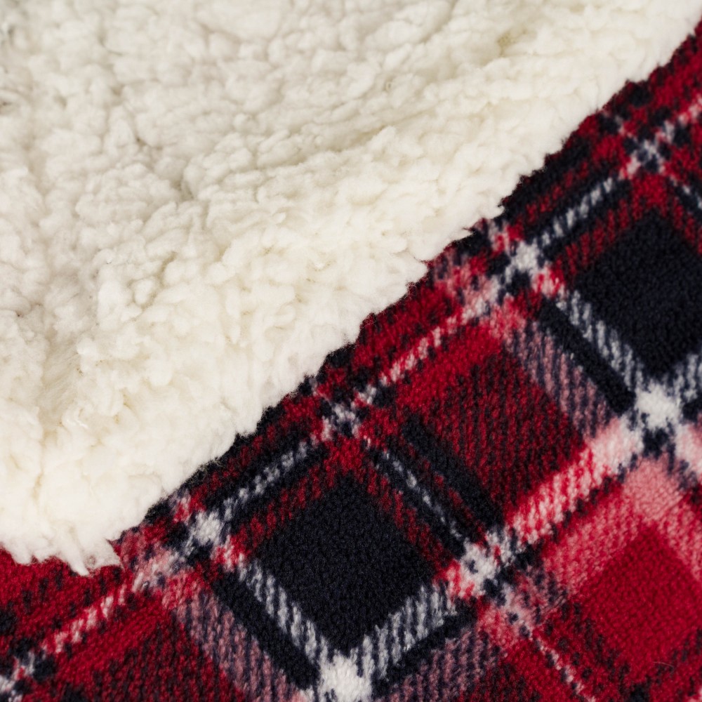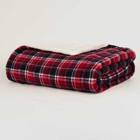 Se caracteriza por tener dos caras con textura diferentes: una más suave coralina con estampado de cuadros azules y blancos sobre un fondo rojo, y otra más cálida esponjosa que hace símil a la lana de borreguito en color crema.