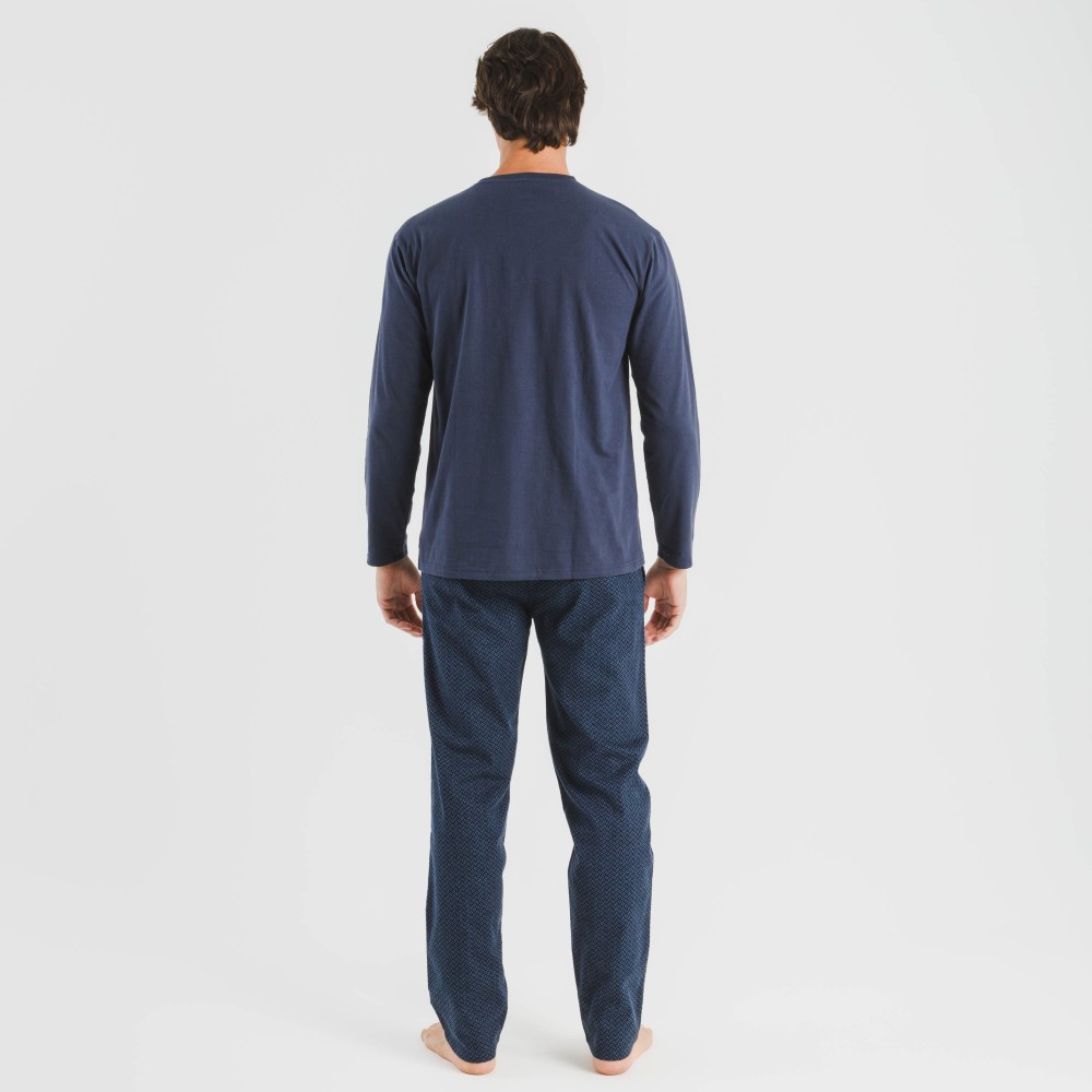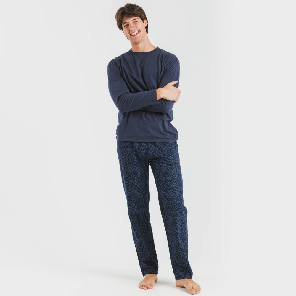 Camiseta lisa de color azul marino y pantalón de pequeño estampado en color celeste sobre un fondo azul. El pantalón del pijama tiene la cintura elástica recubierta con una cinta para ajustar.