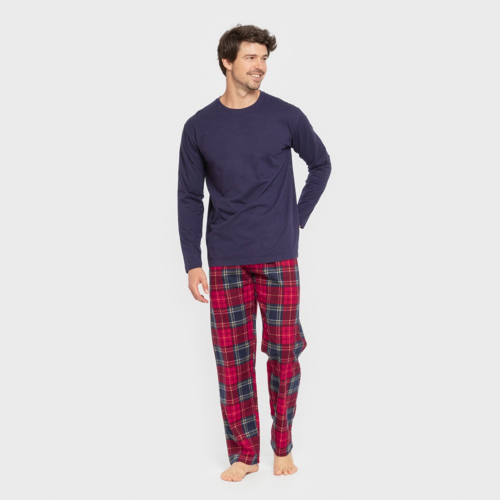 Camiseta lisa de color azul marino y pantalón rojo de cuadros escoceses. El pantalón del pijama tiene la cintura elástica recubierta con una cinta para ajustar.