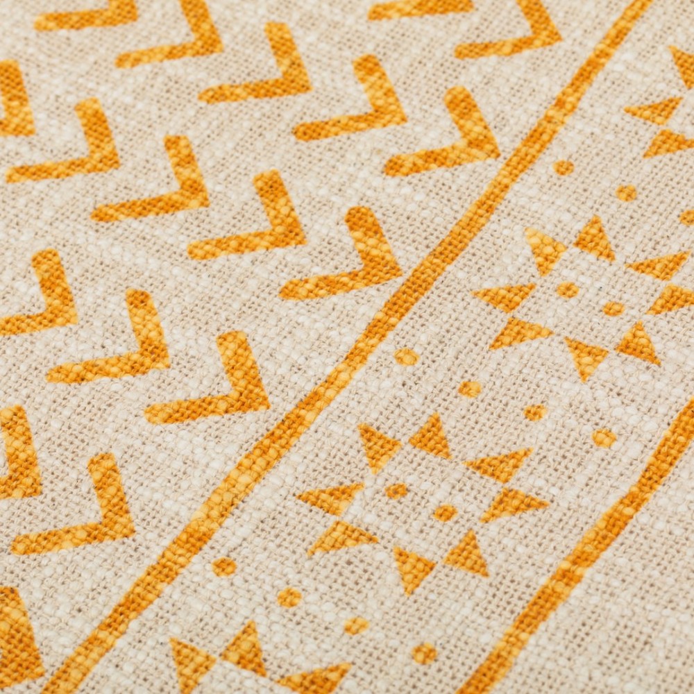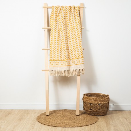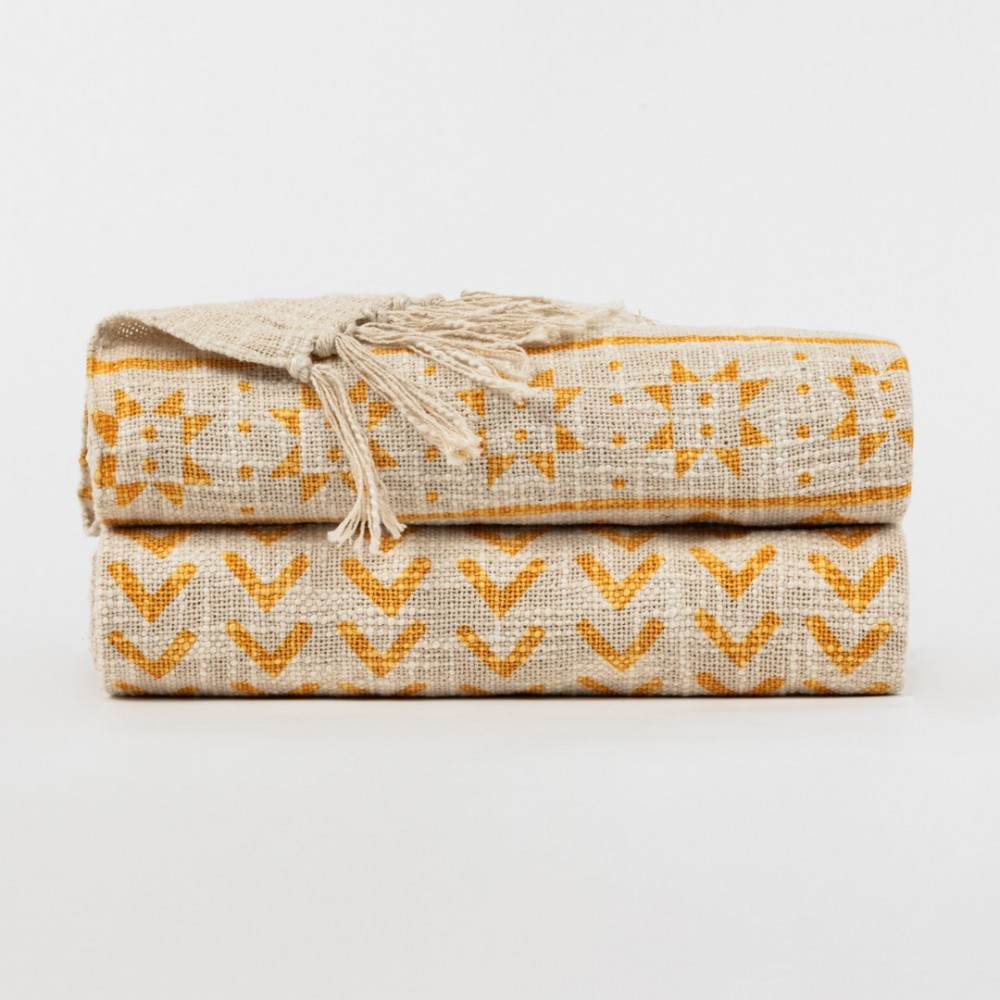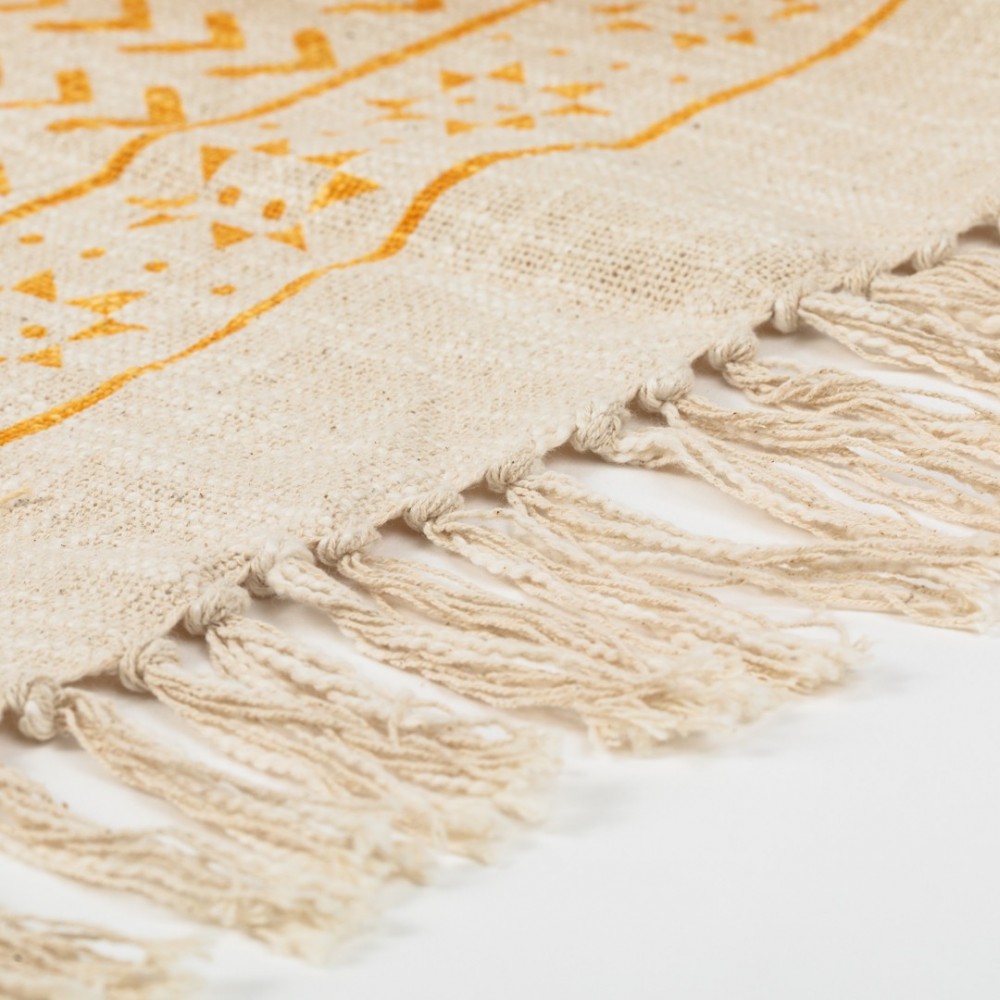 Presenta un estampado discreto de estilo étnico en tonos mostaza sobre fondo arena con borlones de flecos en los extremos que le dan un aire nuevo, es el complemento perfecto para el hogar, se puede utilizar para poner a los pies de la cama o en el sofá.