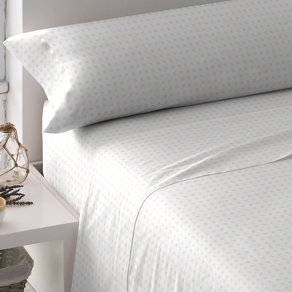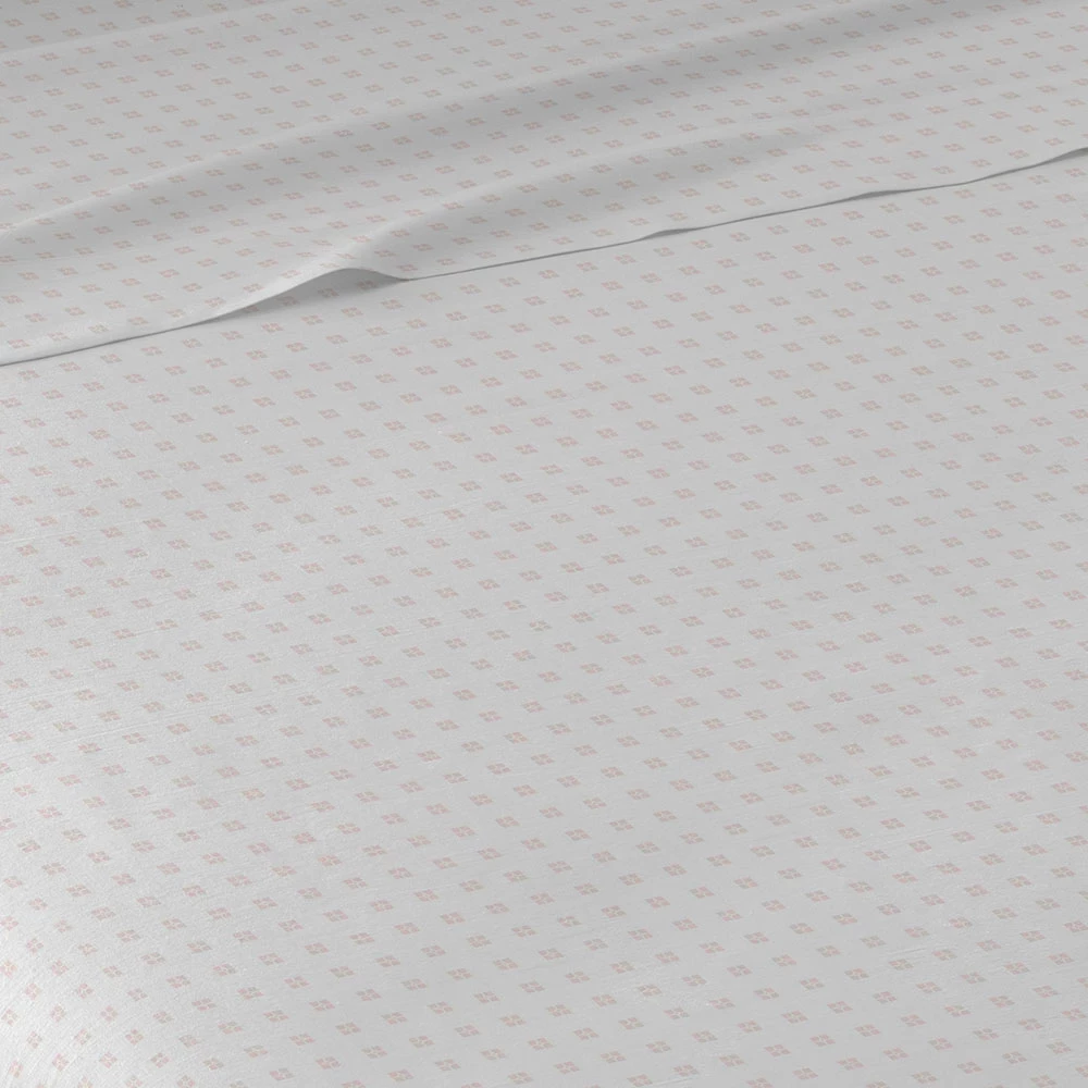 Sábanas y funda de almohada con estampado de pequeños cuadros en color malva sobre un fondo blanco.
