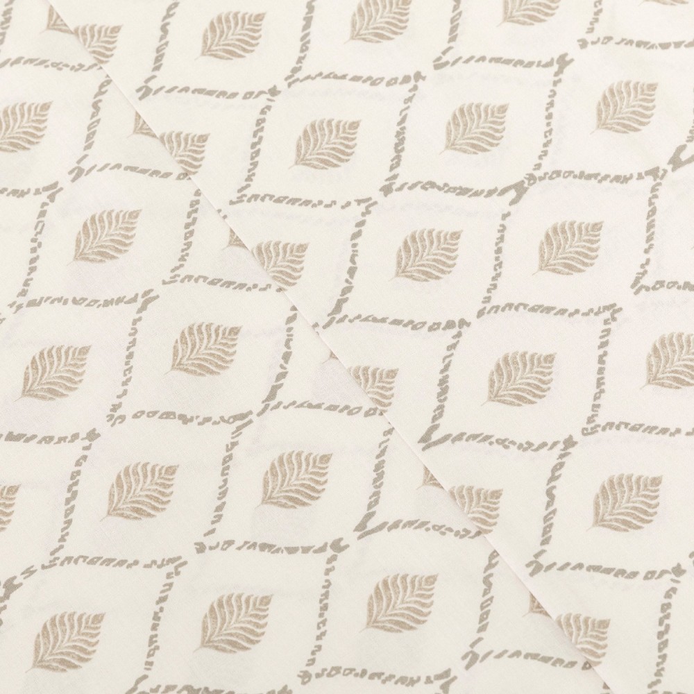 Sábanas y fundas de almohada con un estampado original de hojas marrones sobre un fondo beige.