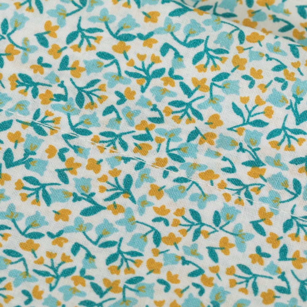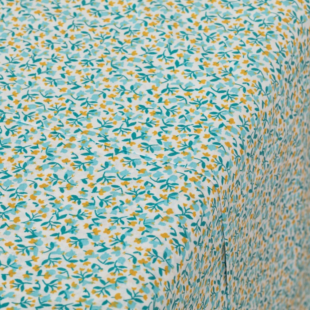 Sábanas y funda de almohada de tacto suave, elevada resistencia a los lavados y excelente transpirabilidad con estampado discreto y sencillo de pequeñas flores en tonos naranja y verde sobre un fondo blanco.