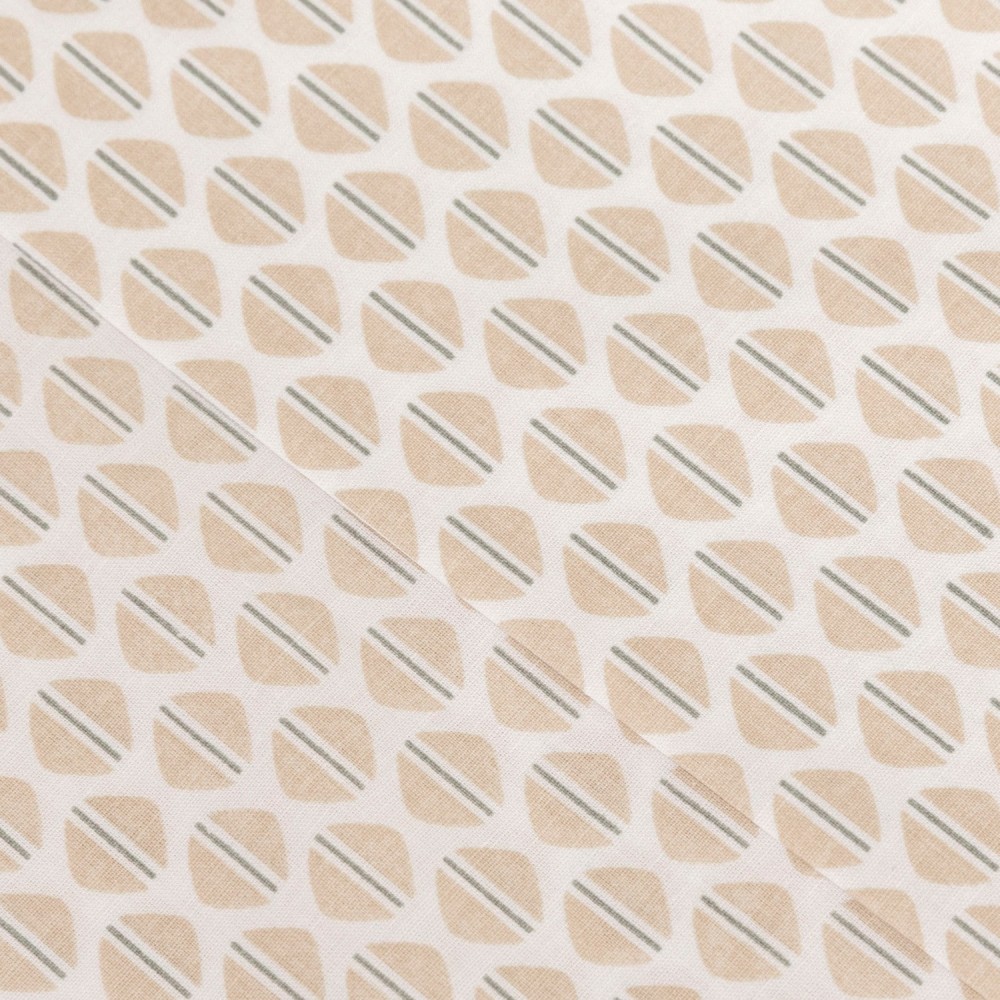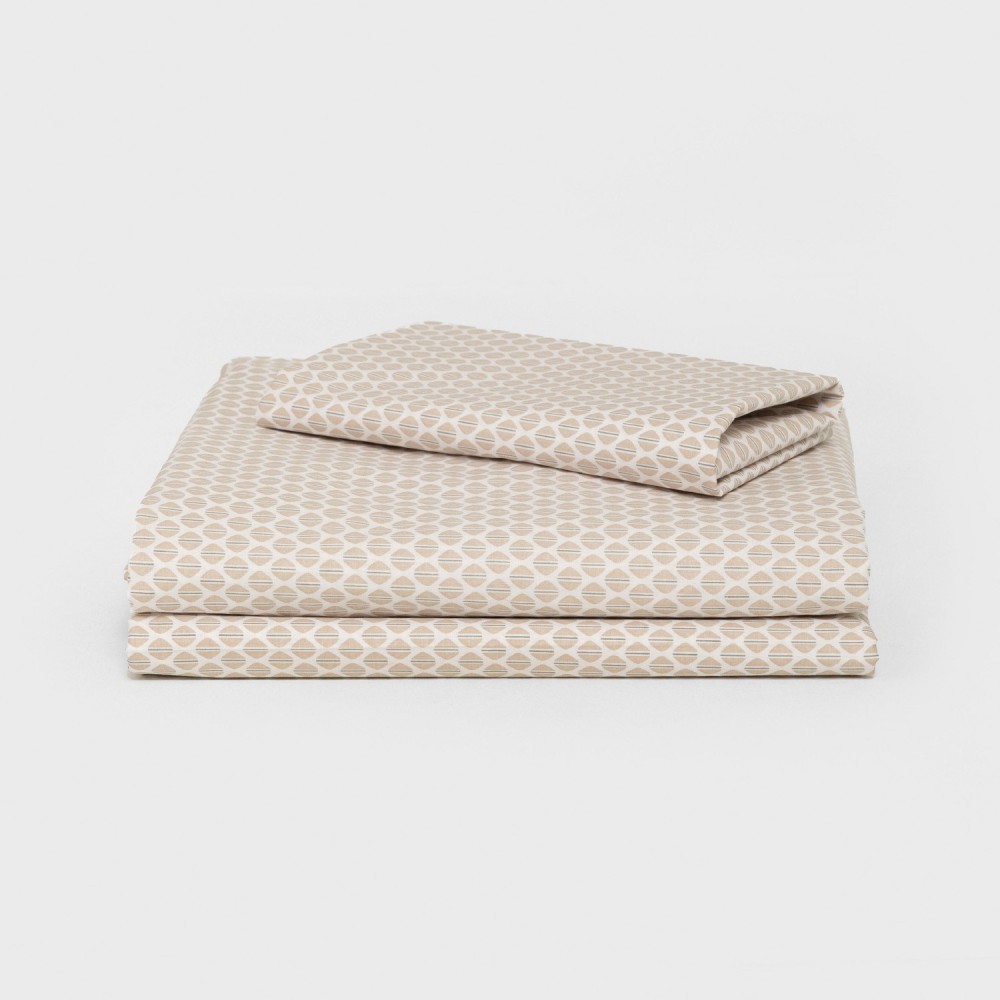 Sábanas y fundas de almohada de tacto suave, elevada resistencia a los lavados y excelente transpirabilidad con estampado de pequeñas figuras en tonos beige sobre un fondo natural.