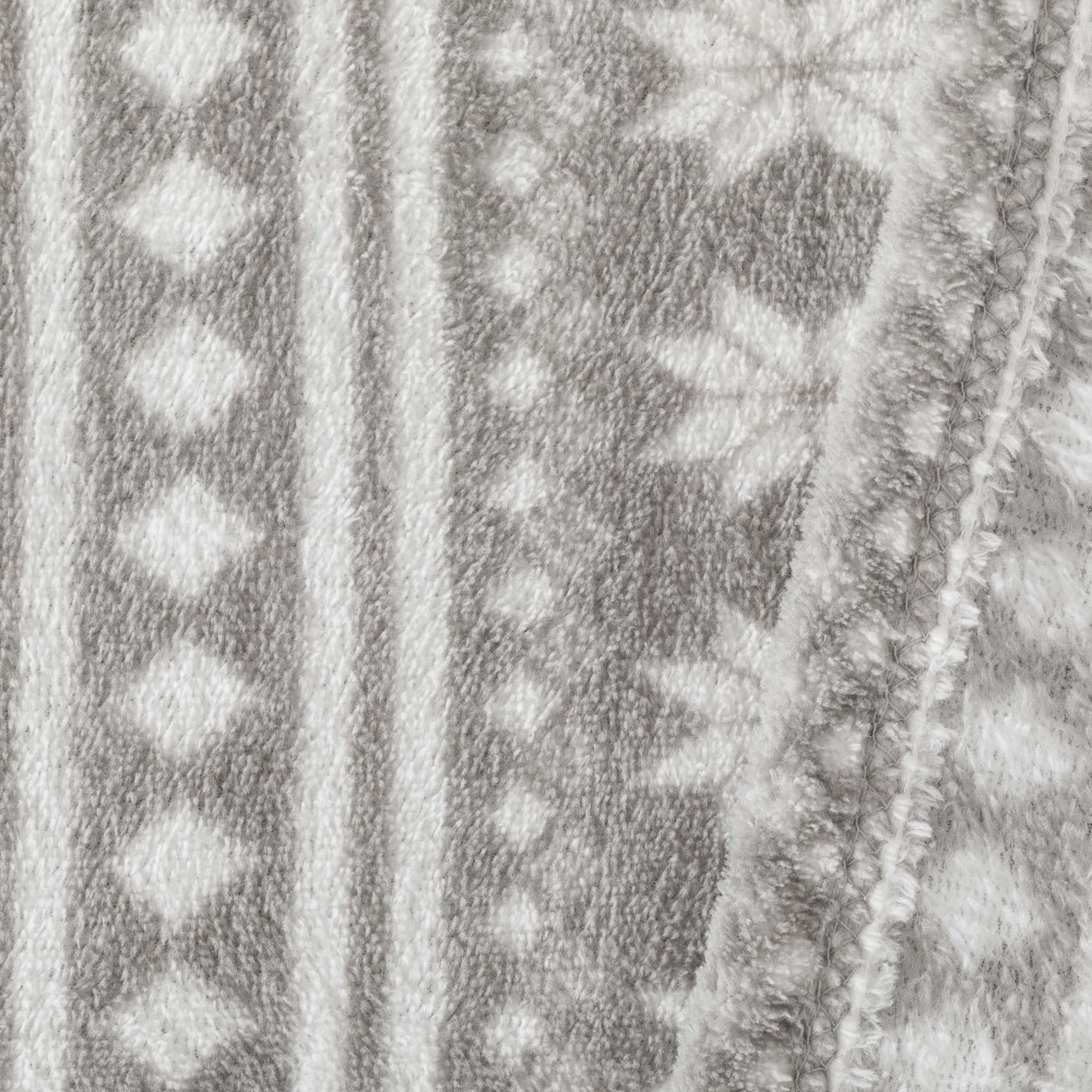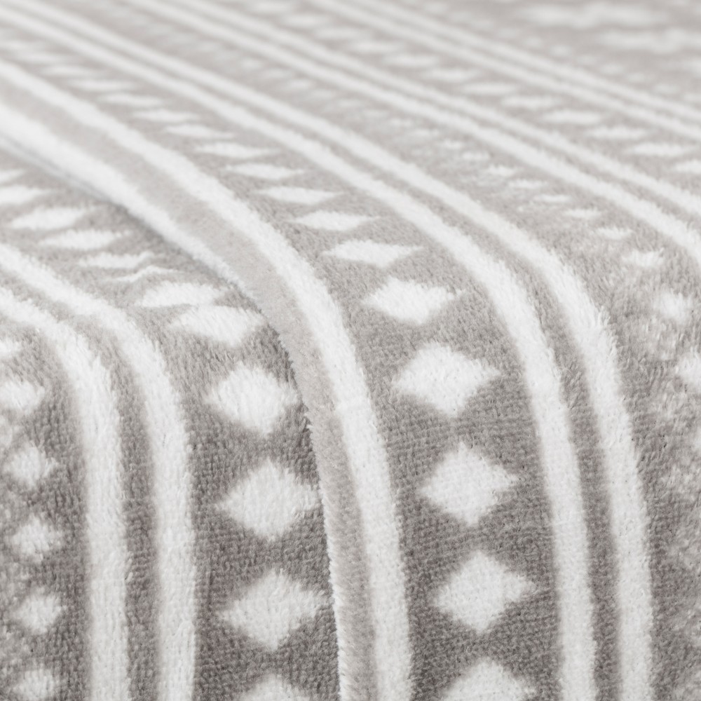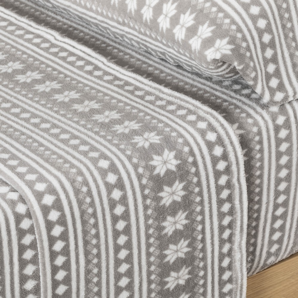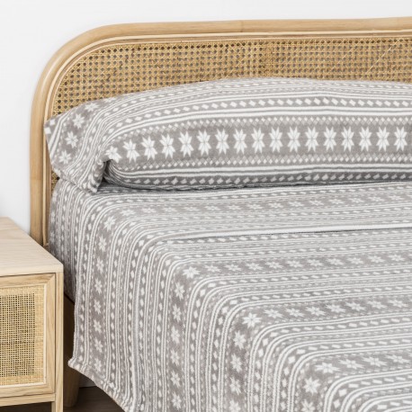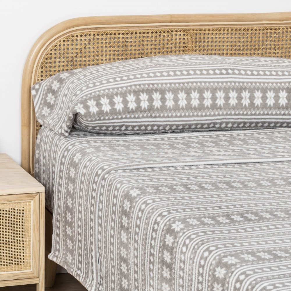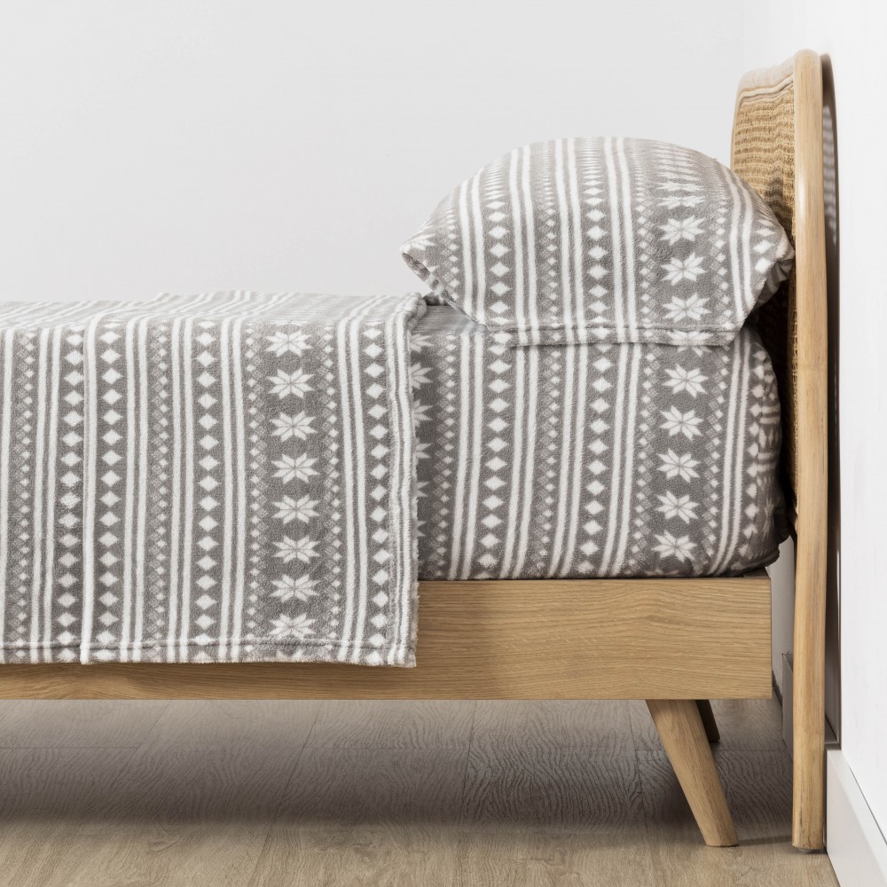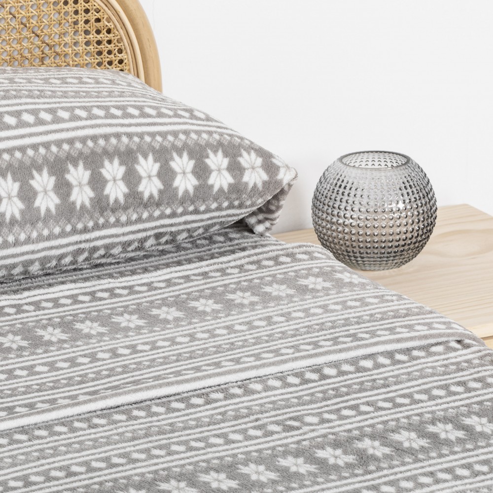 Sábanas y funda de almohada con series geométricas de rombos y estrellas de nieve blancas sobre un fondo gris. Tacto muy suave, similar al terciopelo con tejido coralina a doble cara, ideal para los meses fríos de invierno.