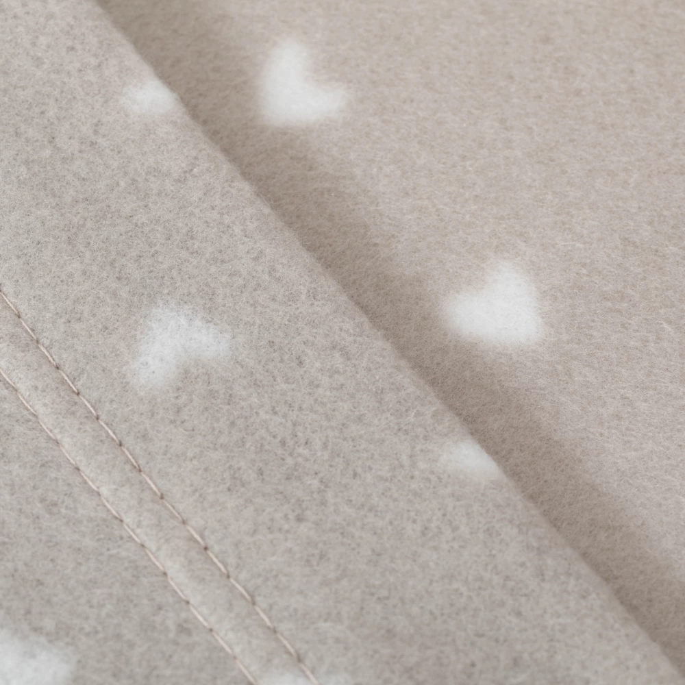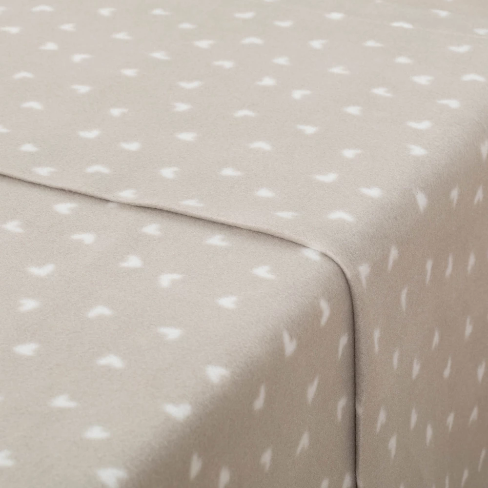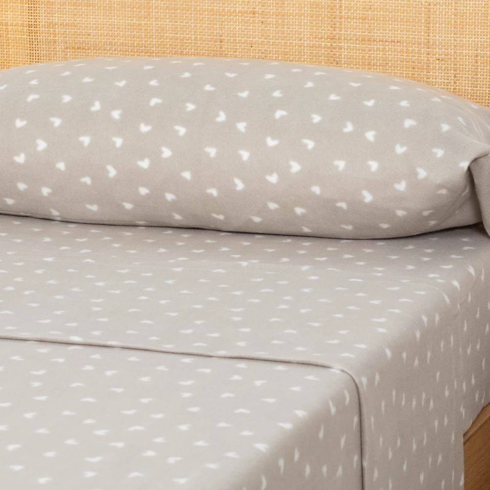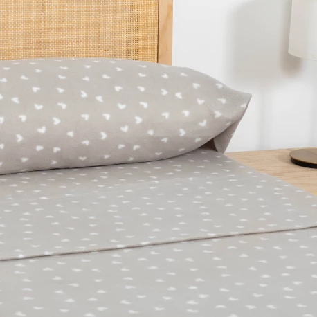 Sábanas y funda de almohada con estampado juvenil de pequeños corazones blancos sobre un fondo gris.
