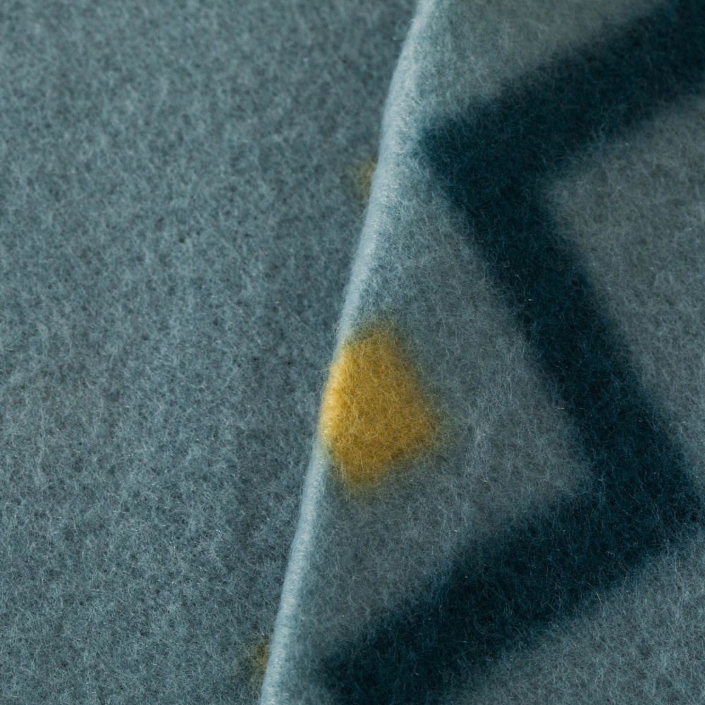 Sábanas y fundas de almohada con estampado de zigzags y rombos en tonos azules, blanco y mostaza sobre un fondo azul.